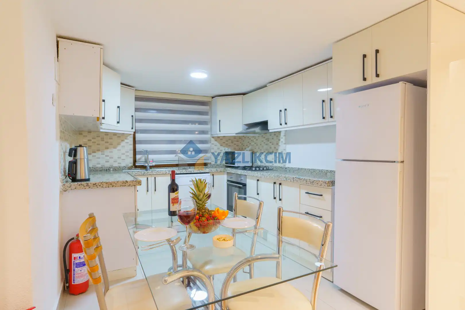 Mutfak Detayları:  Buzdolabı, bulaşık makinesi, fırın, çamaşır makinesi, yemek takımı, tava-tencere, çatal-bıçak seti bulunmaktadır.