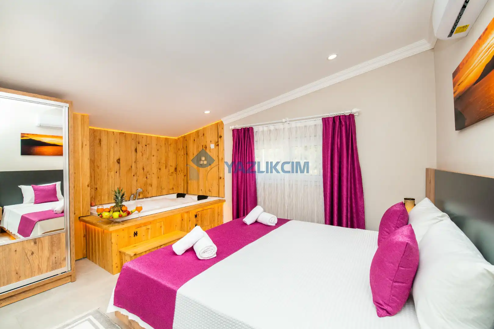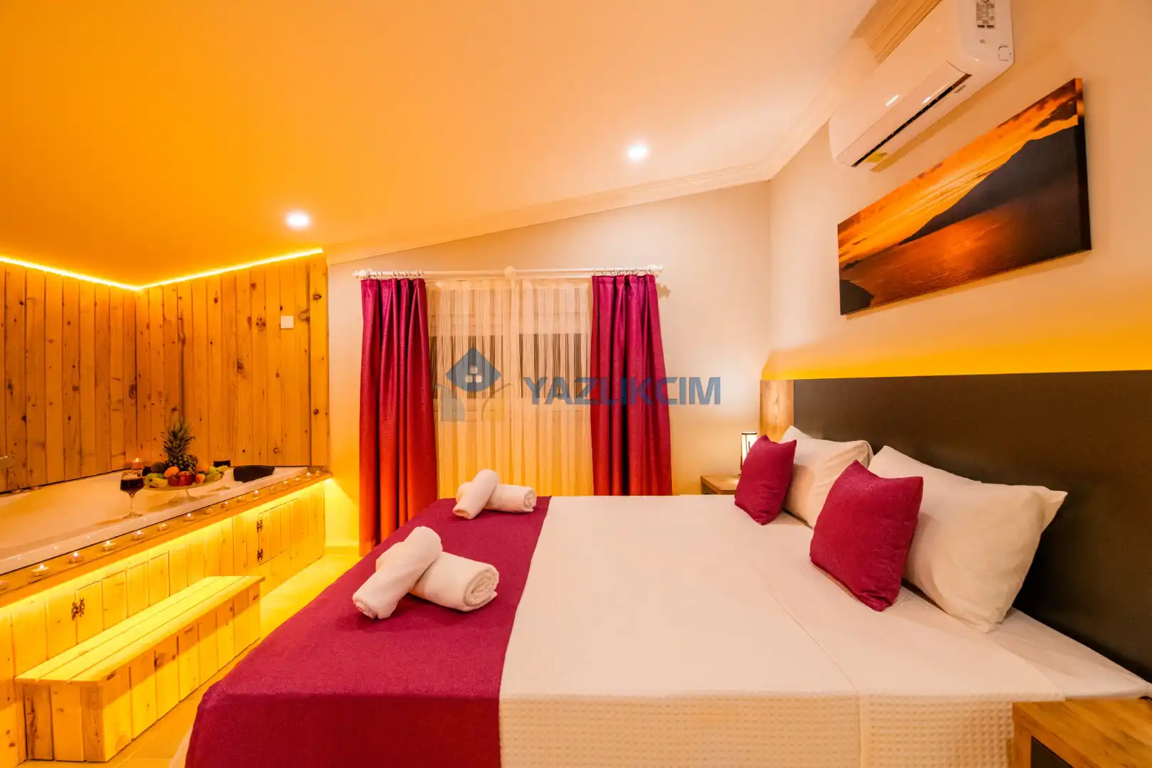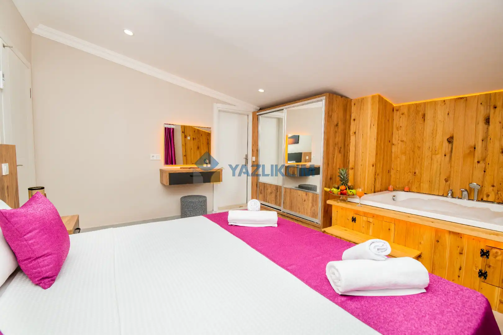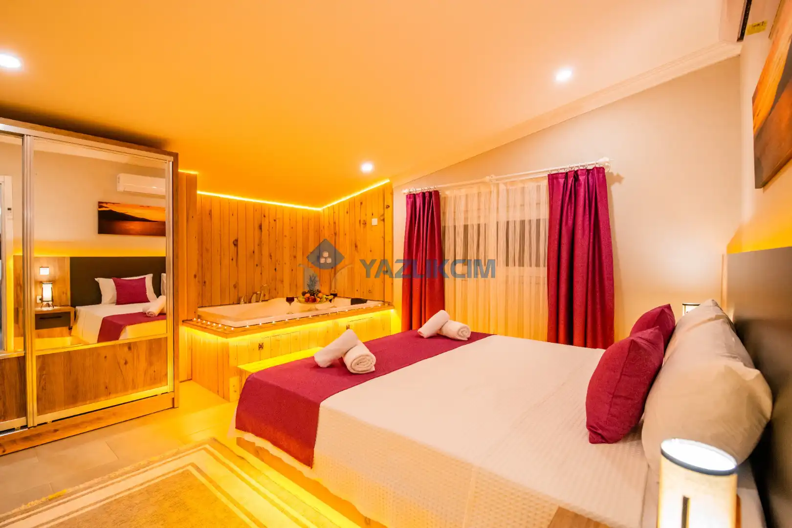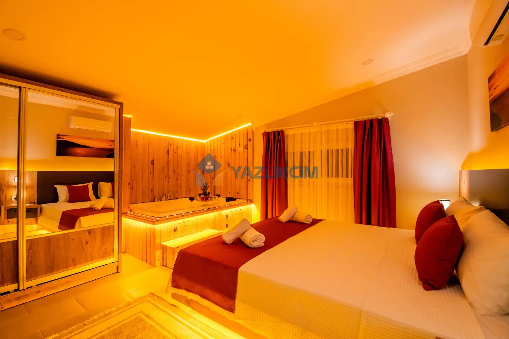 Detayları :  Çift kişilik yatak ,  jakuzi  , klima , komodin, makyaj masası , elbise dolabı,  banyo ve lavabo bulunmaktadır.