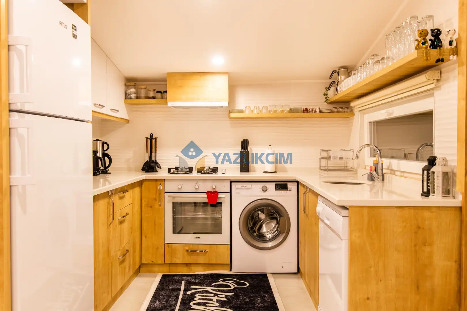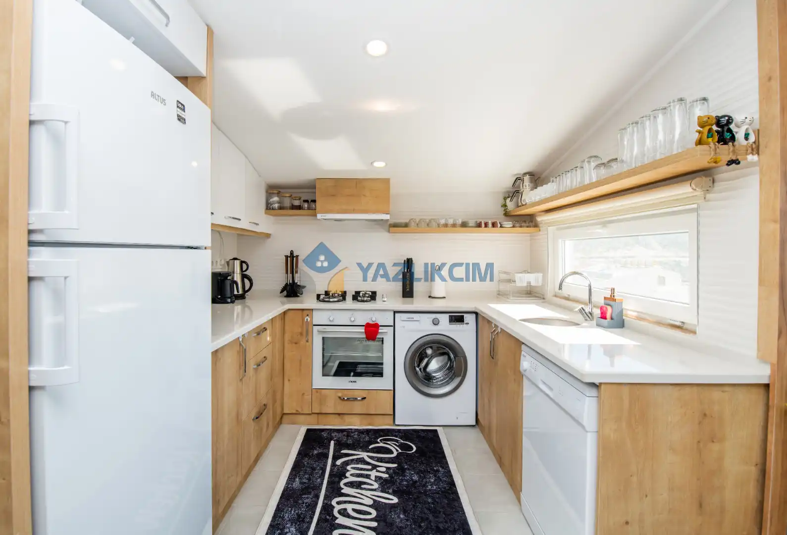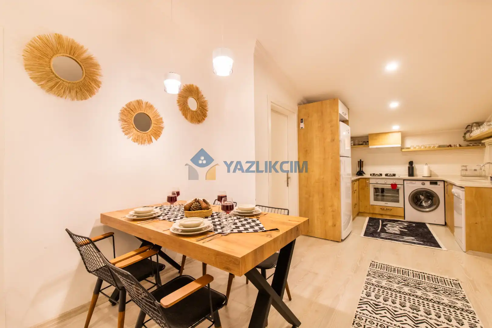 Mutfak Detayları : Buzdolabı , bulaşık makinesi ,  çamaşır makinesi , 4 kişilik  yemek takımı, tava-tencere, çatal-bıçak seti bulunmaktadır.