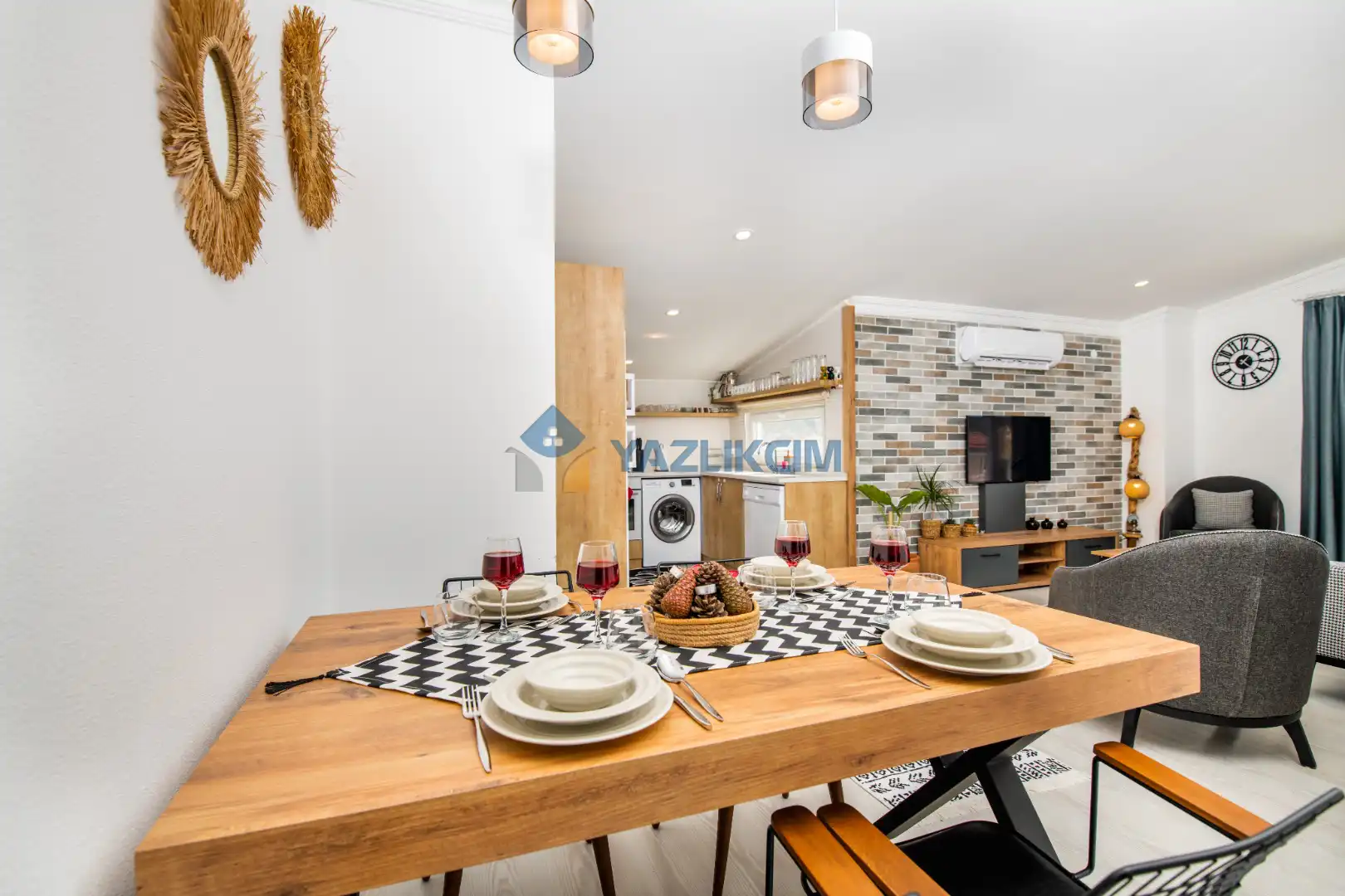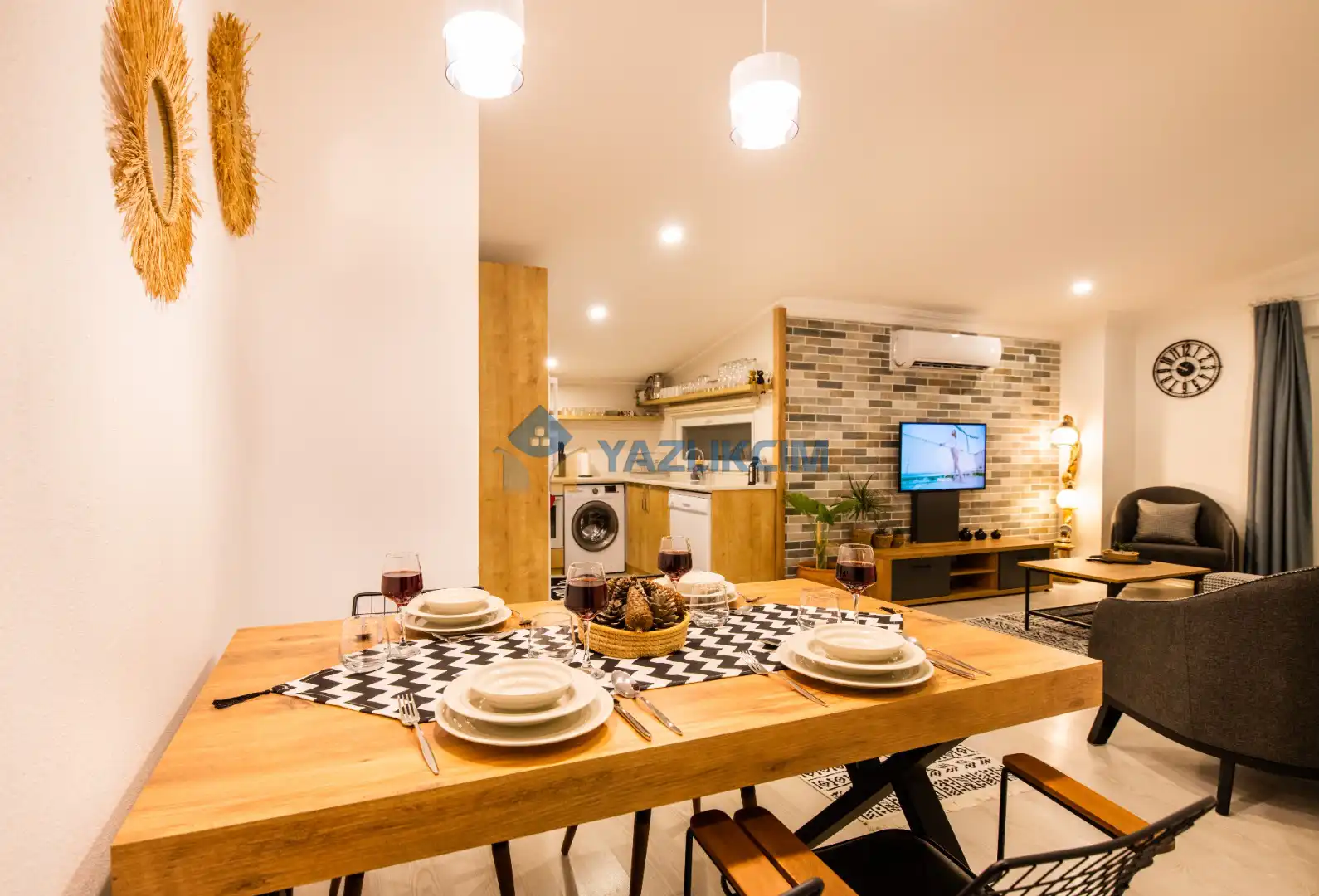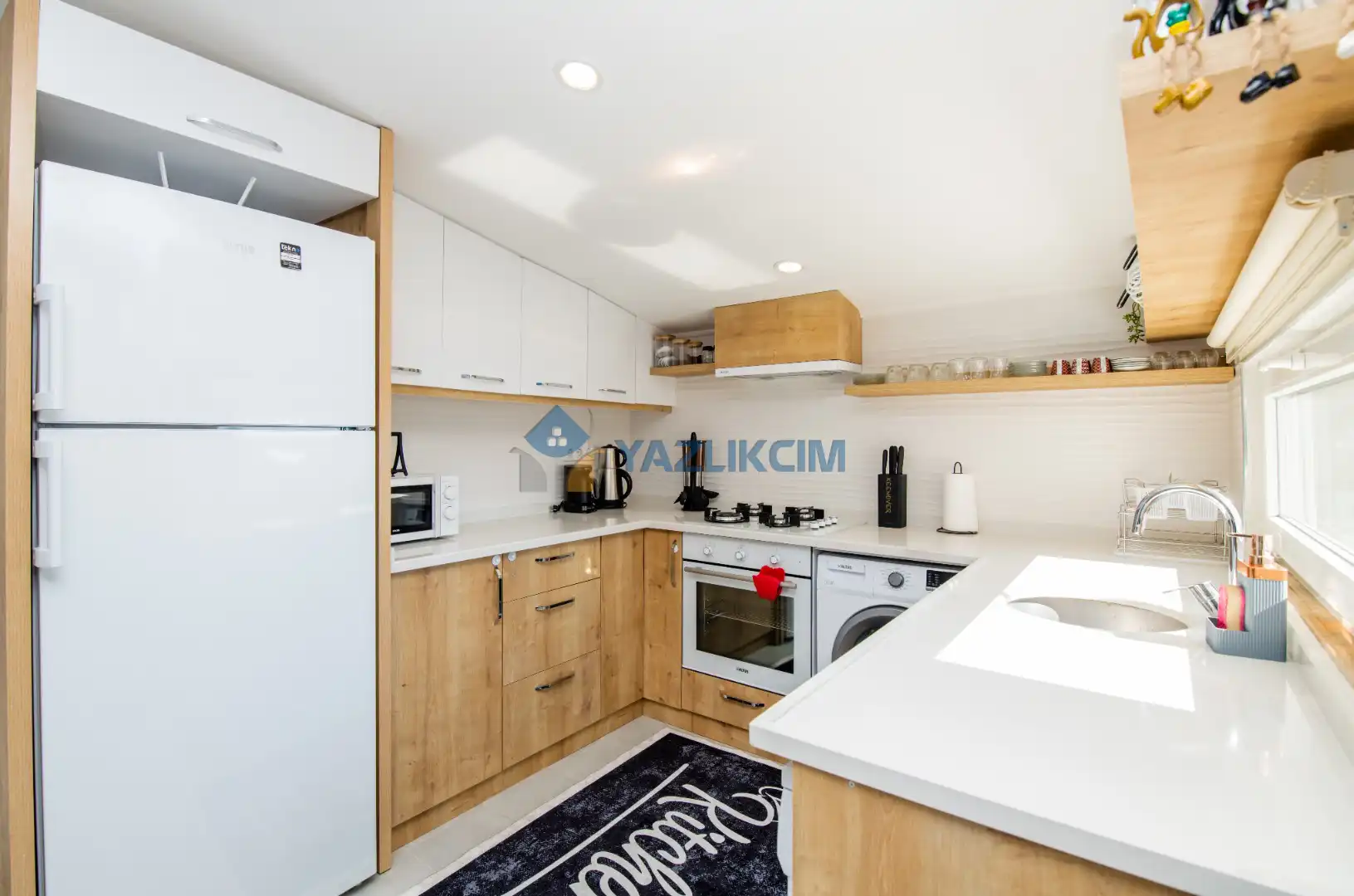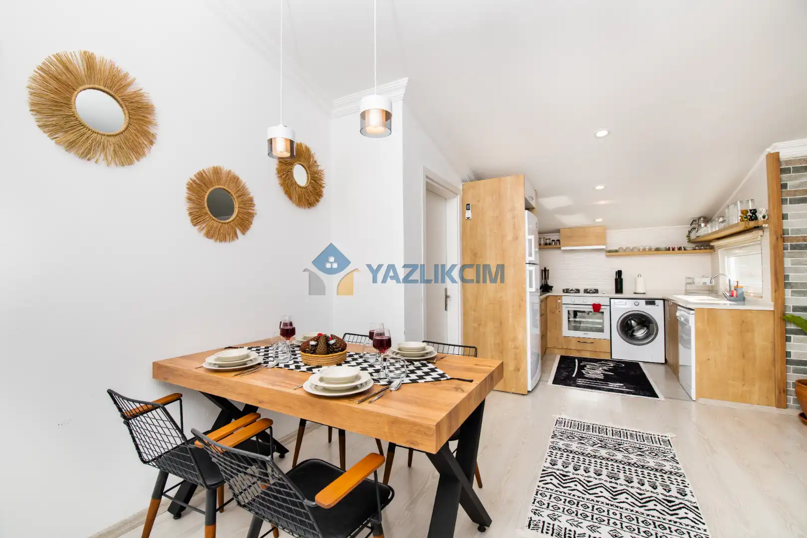 Mutfak Detayları : Buzdolabı , bulaşık makinesi ,  çamaşır makinesi , 4 kişilik  yemek takımı, tava-tencere, çatal-bıçak seti bulunmaktadır.