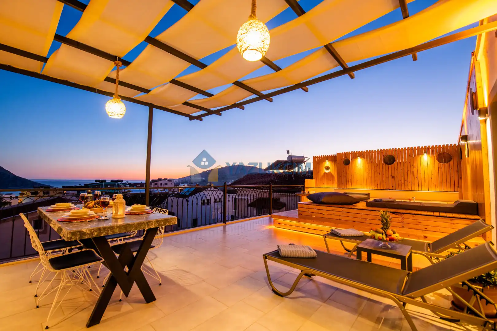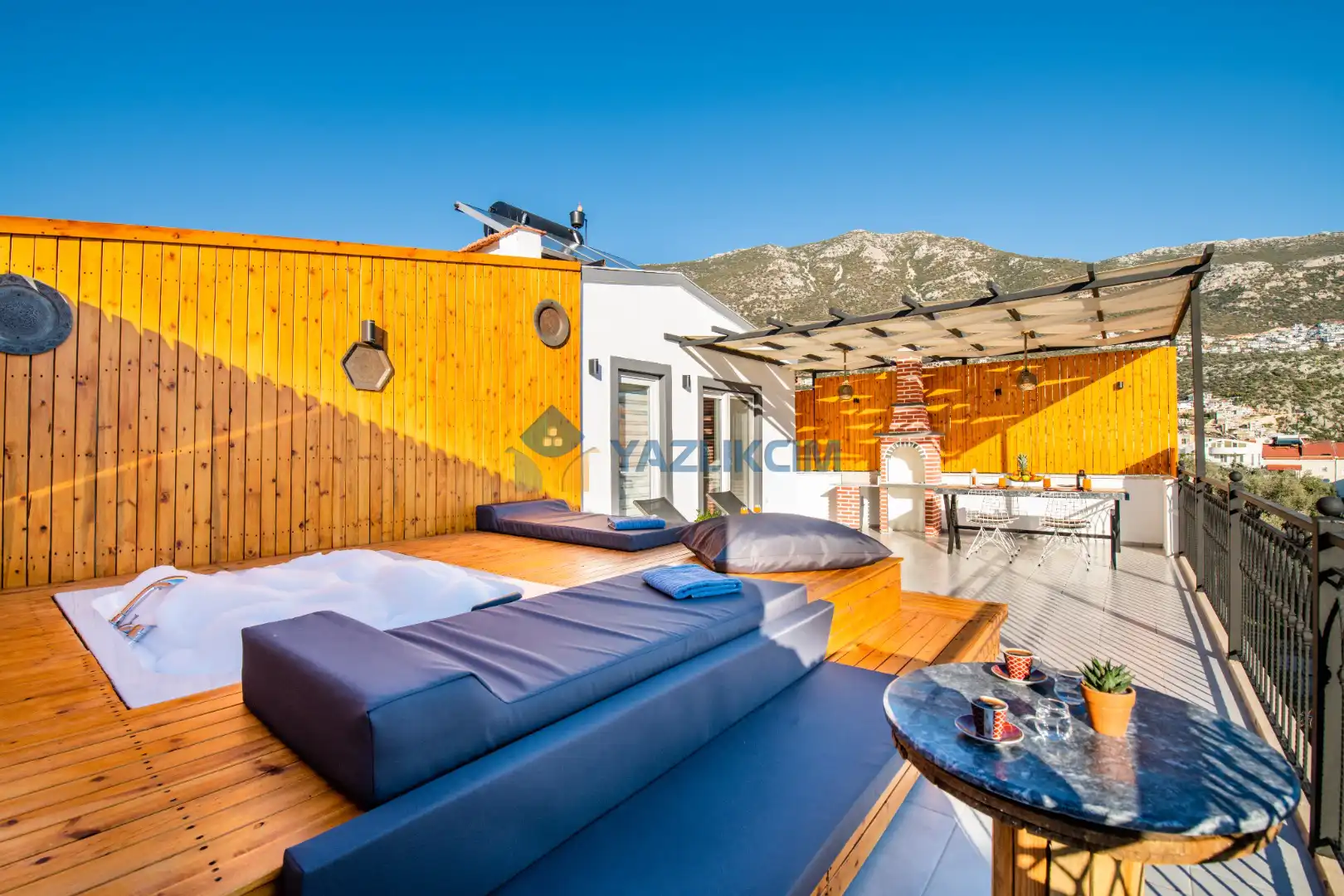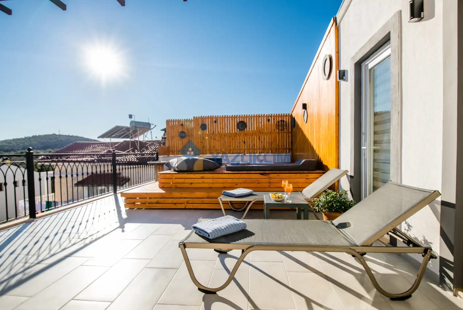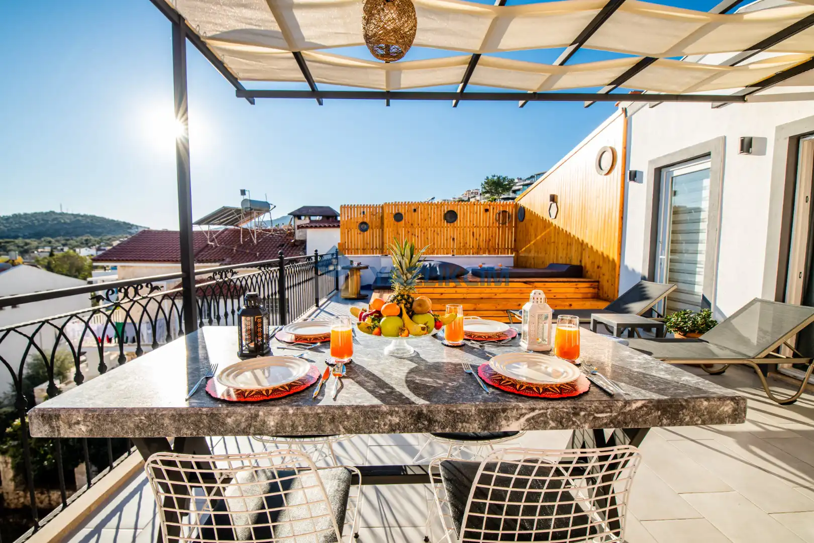 Teras Detayları : Deniz manzaralı, Şezlong , güneşlenme  şemsiyesi , Açık Hava Jakusi ,barbekü , yemek masası ve sandalyeleri       bulunmaktadır.