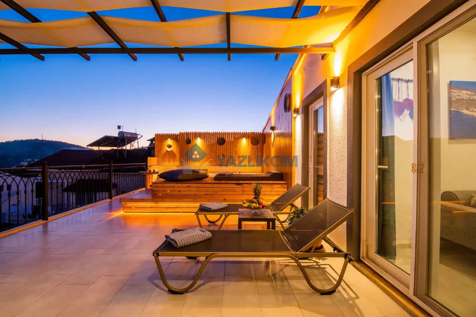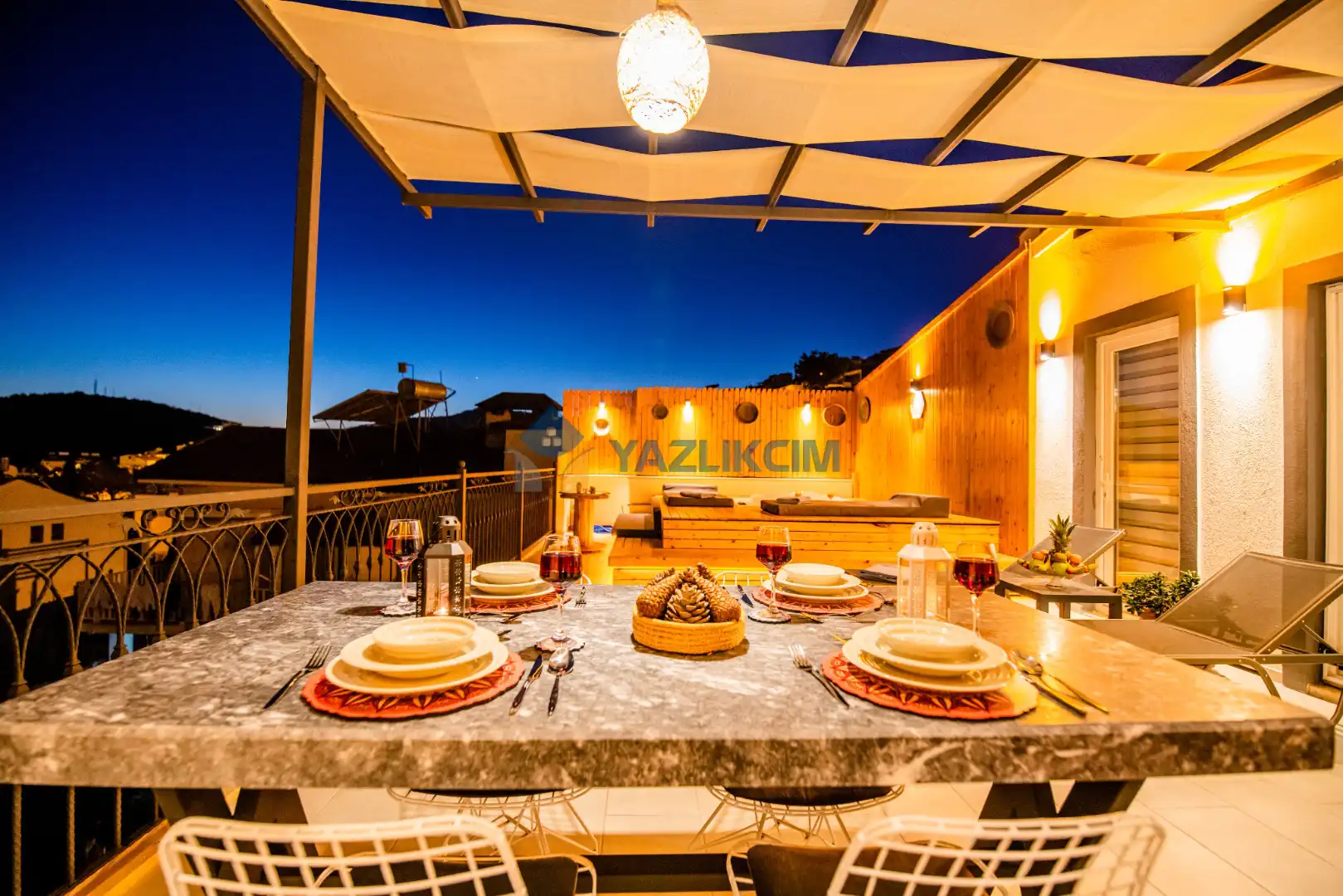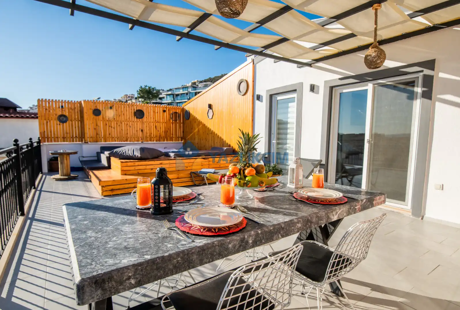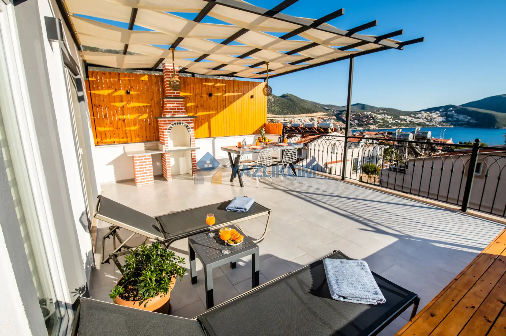 Teras Detayları : Deniz manzaralı, Şezlong , güneşlenme  şemsiyesi , Açık Hava Jakusi ,barbekü , yemek masası ve sandalyeleri       bulunmaktadır.