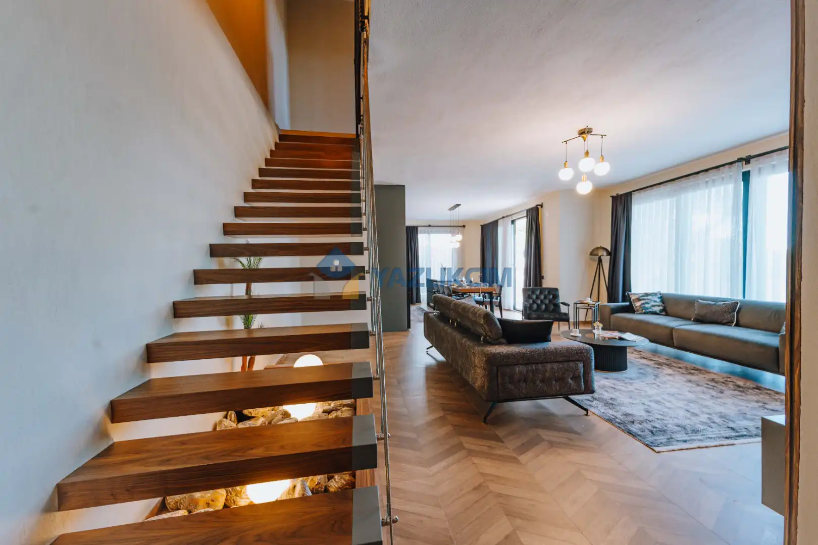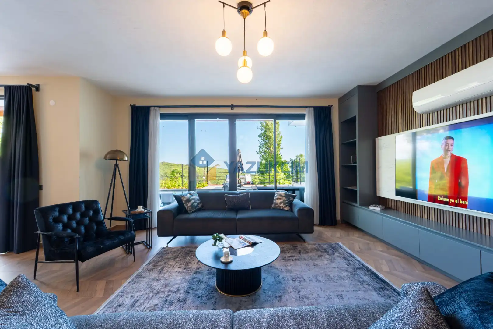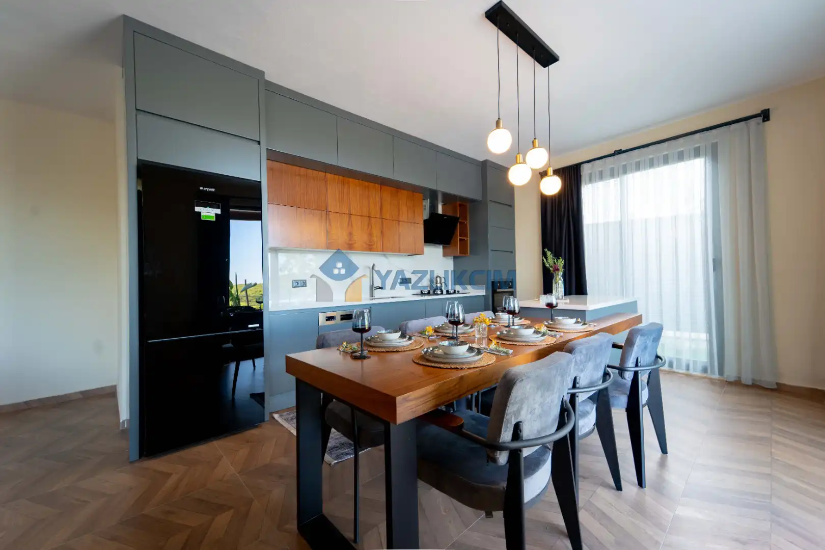 Salon Detayları: LCD TV, modern oturma grubu, yemek masası ve sandalyeler, kablosuz modem bulunmaktadır.