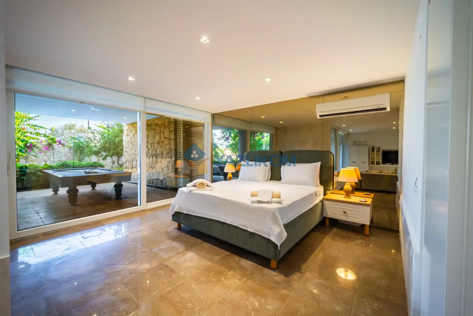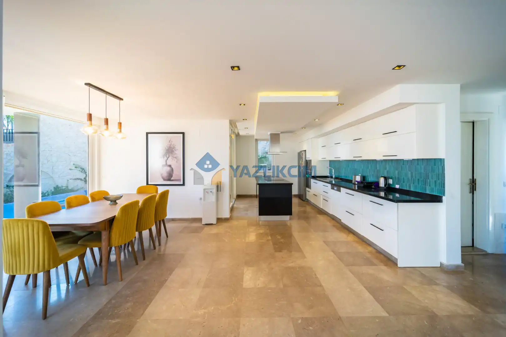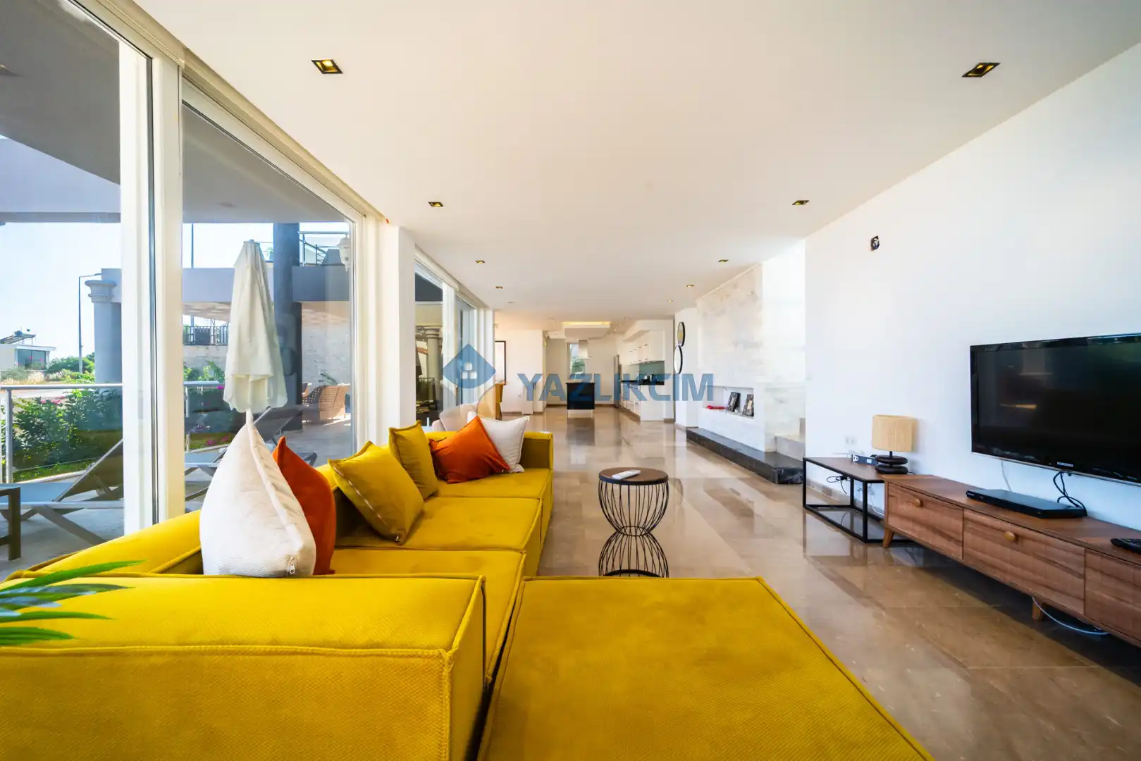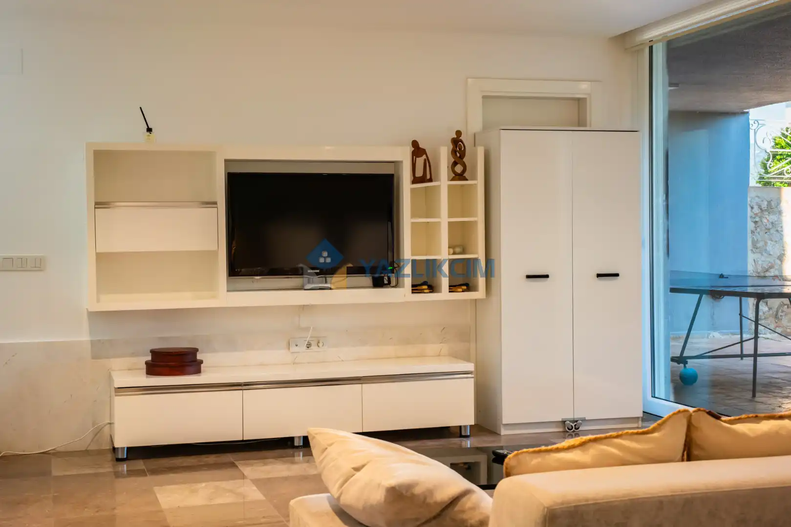 Salon Detayları: Oturma Grubu, Smart TV, Kablosuz İnternet, Klima, Yemek Masası, Havuz Terasına Çıkış Bulunmaktadır.