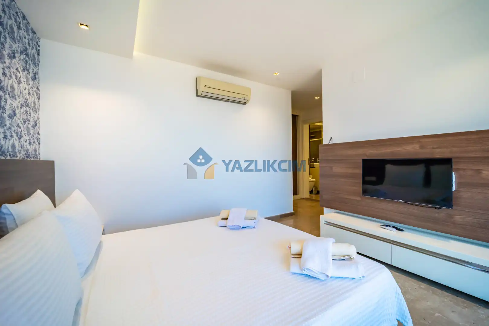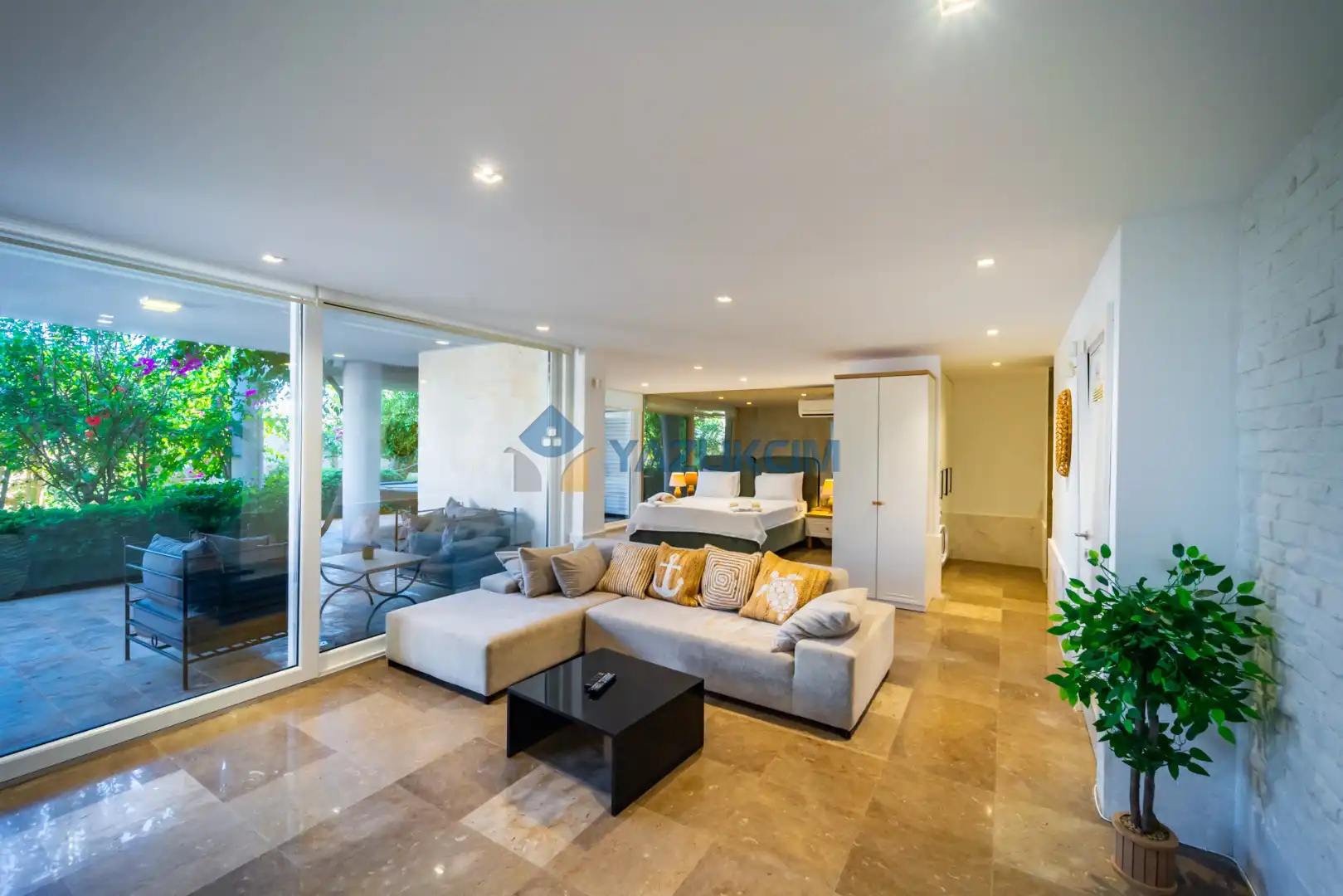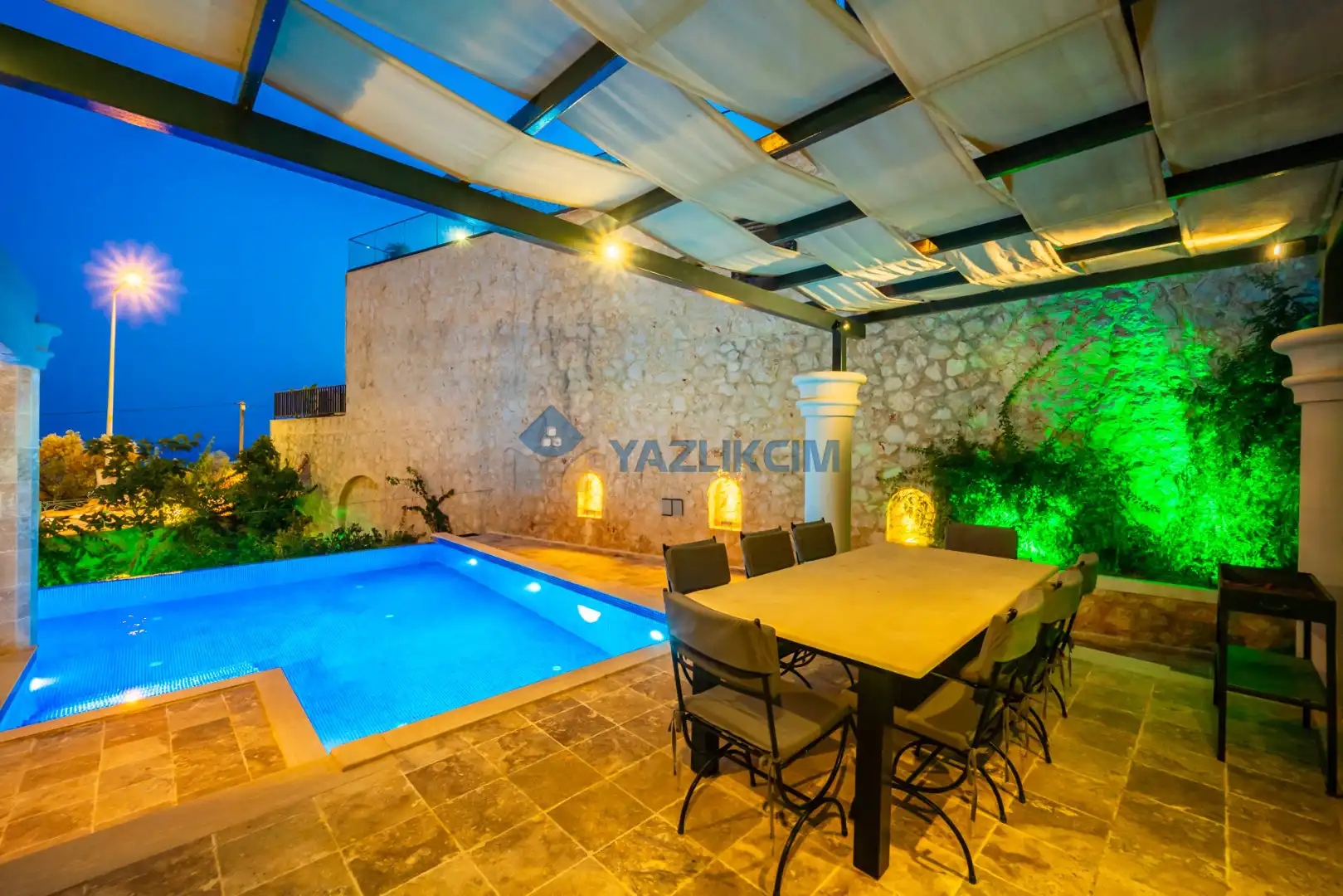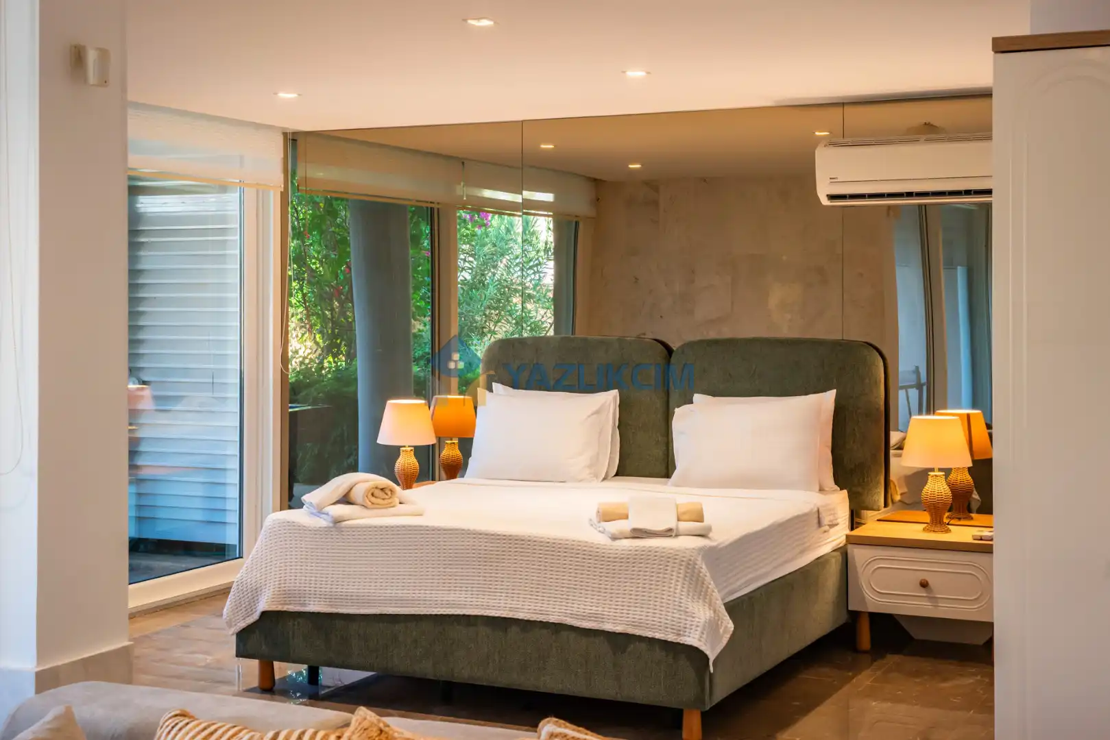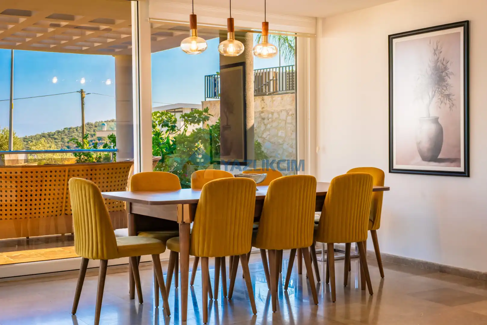 Salon Detayları: Oturma Grubu, Smart TV, Kablosuz İnternet, Klima, Yemek Masası, Havuz Terasına Çıkış Bulunmaktadır.