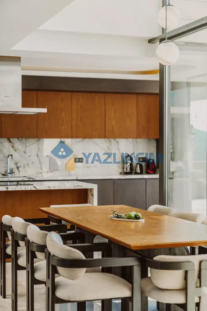 Mutfak Detayları: Geniş, Ferah ve Modern Dizayn Edilmiş Amerikan Mutfak, Buzdolabı, Bulaşık Makinesi, Çamaşır Makinesi, Fırın, 4’lü Ocak (ankastre), Elektrikli Su Isıtıcı, Tava & Tencere vb. Mutfak Ekipmanları, 10 Kişilik Yemek Takımı