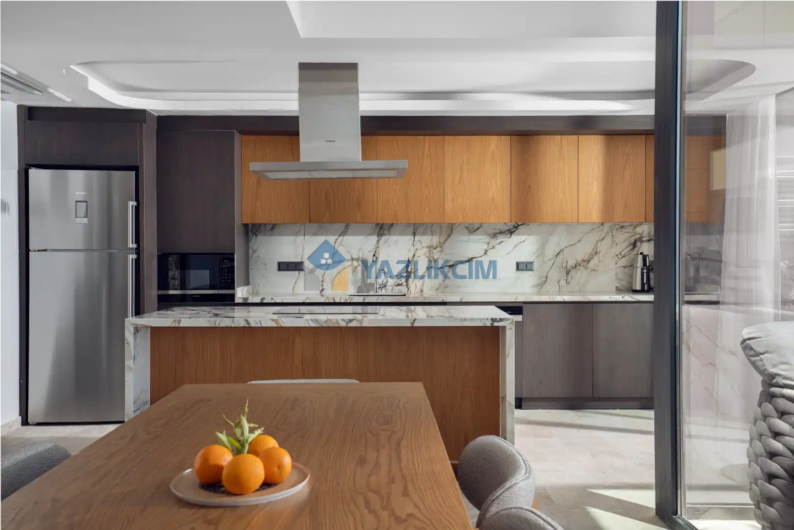 Mutfak Detayları: Geniş, Ferah ve Modern Dizayn Edilmiş Amerikan Mutfak, Buzdolabı, Bulaşık Makinesi, Çamaşır Makinesi, Fırın, 4’lü Ocak (ankastre), Elektrikli Su Isıtıcı, Tava & Tencere vb. Mutfak Ekipmanları, 10 Kişilik Yemek Takımı