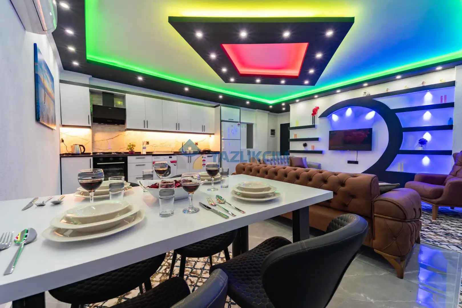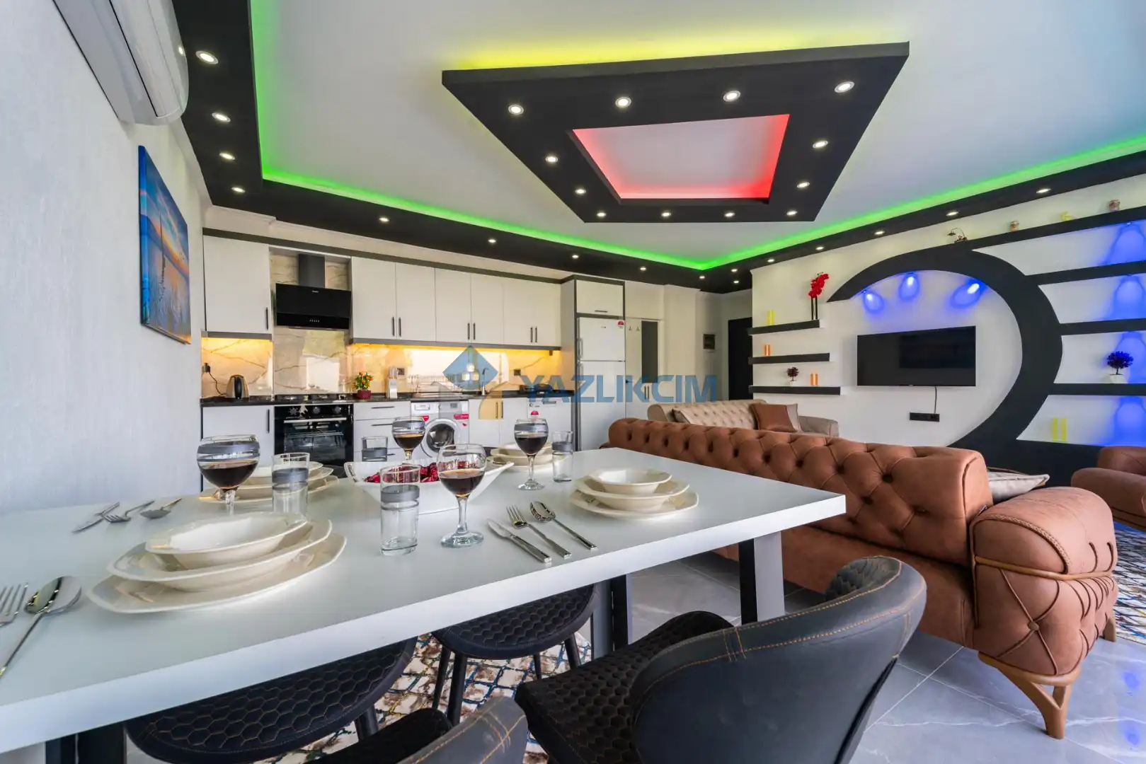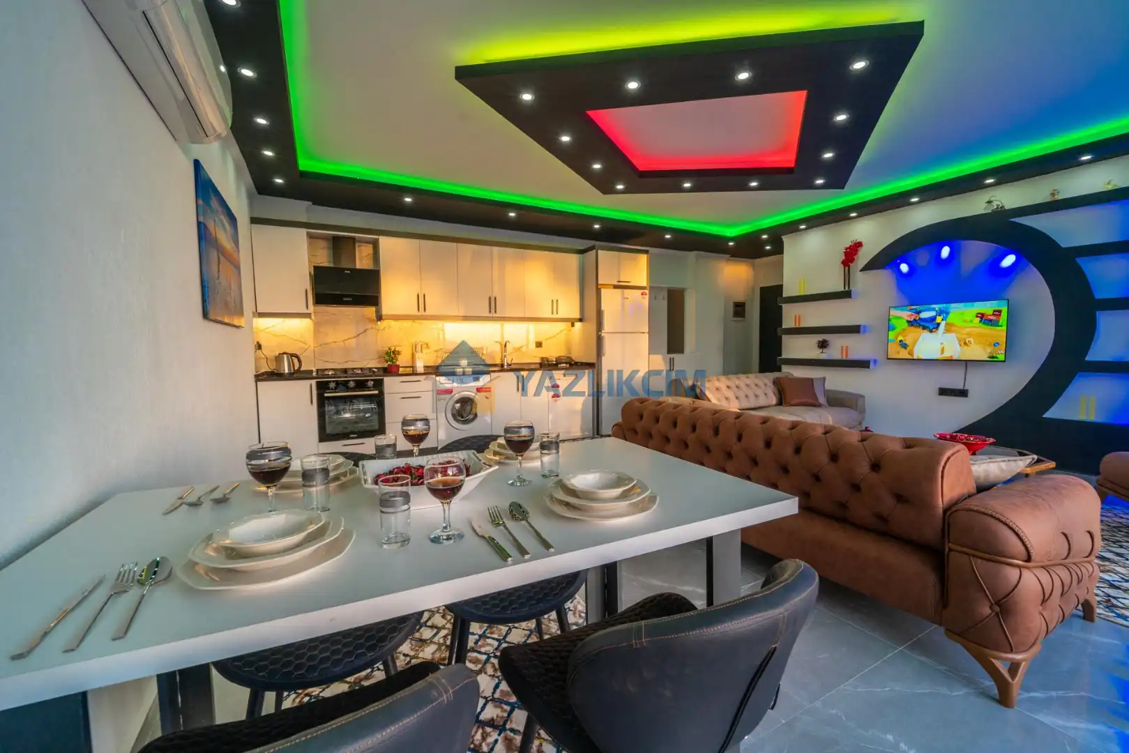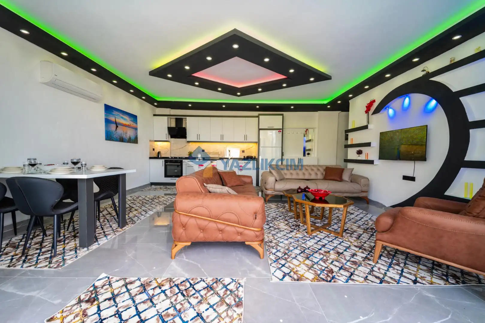 Salon Detayları: LCD TV, modern oturma grubu, yemek masası ve sandalyeler, kablosuz modem bulunmaktadır.