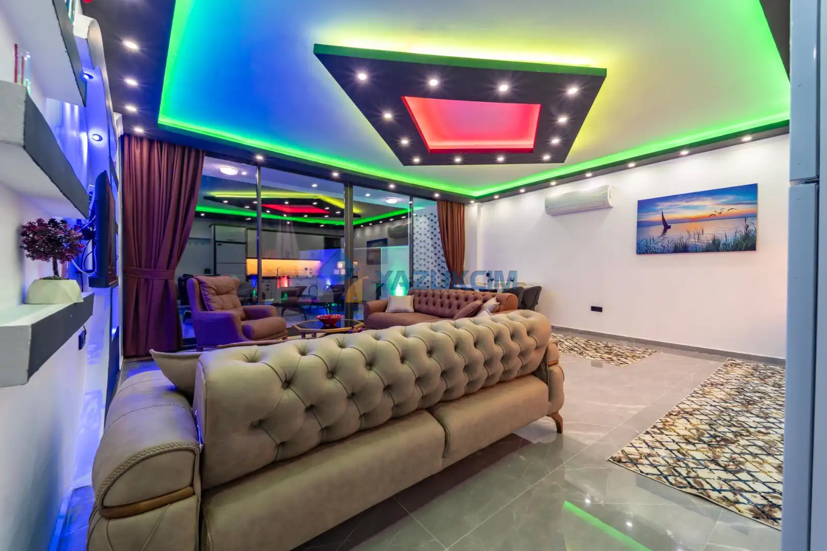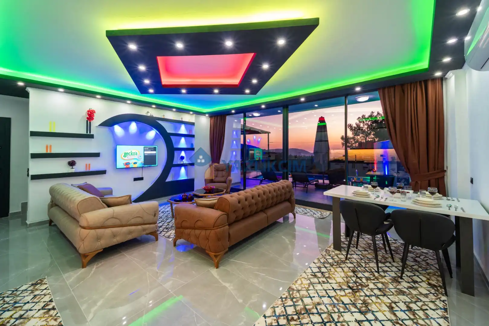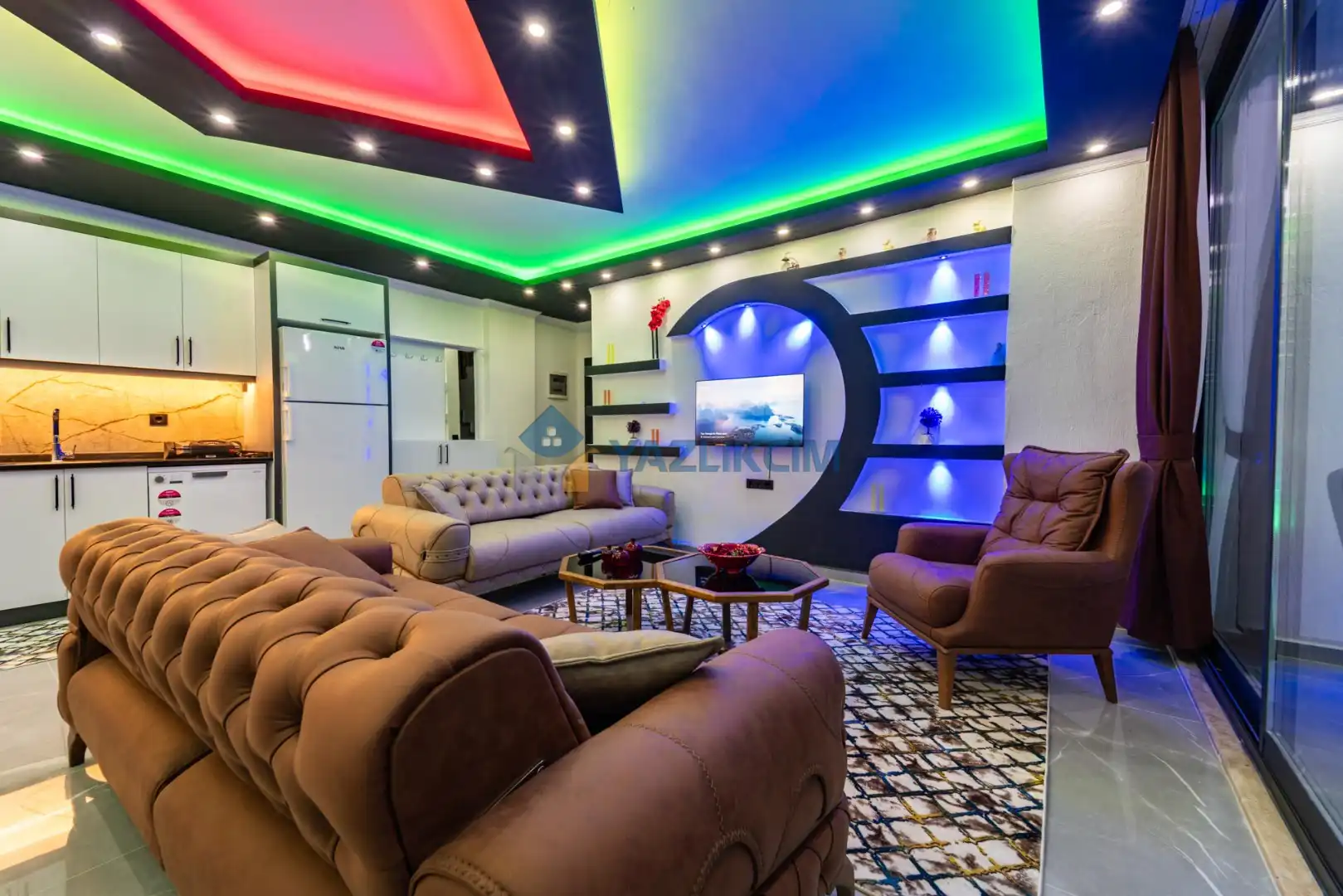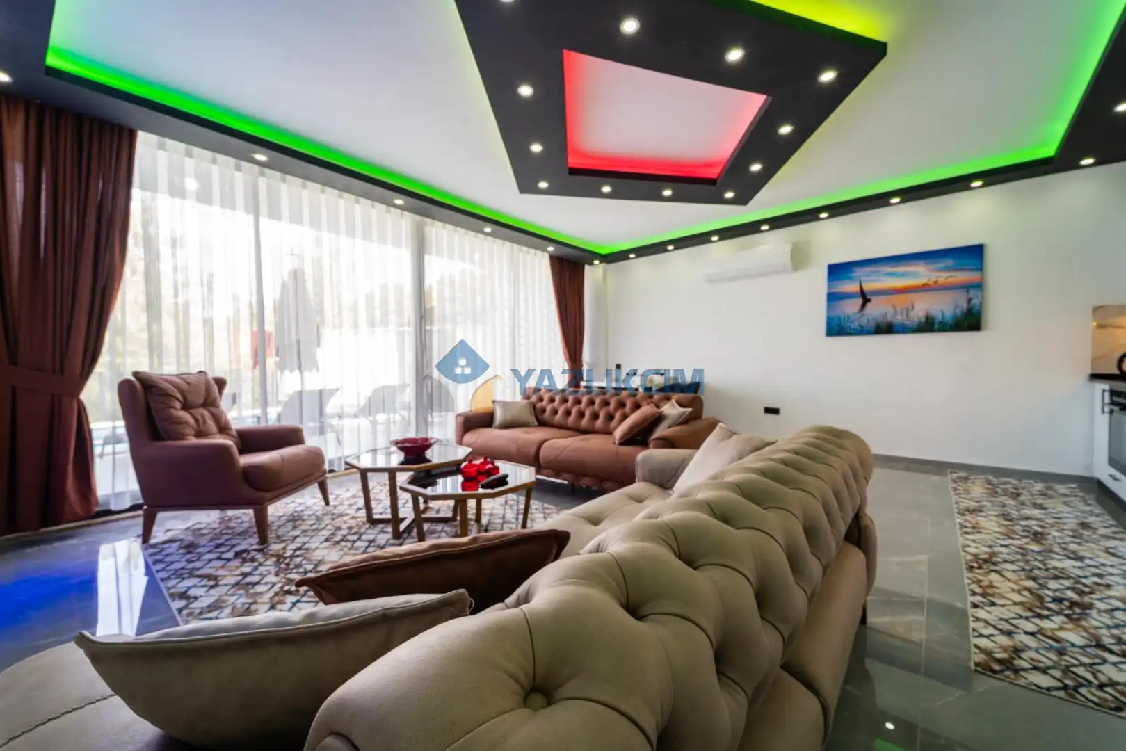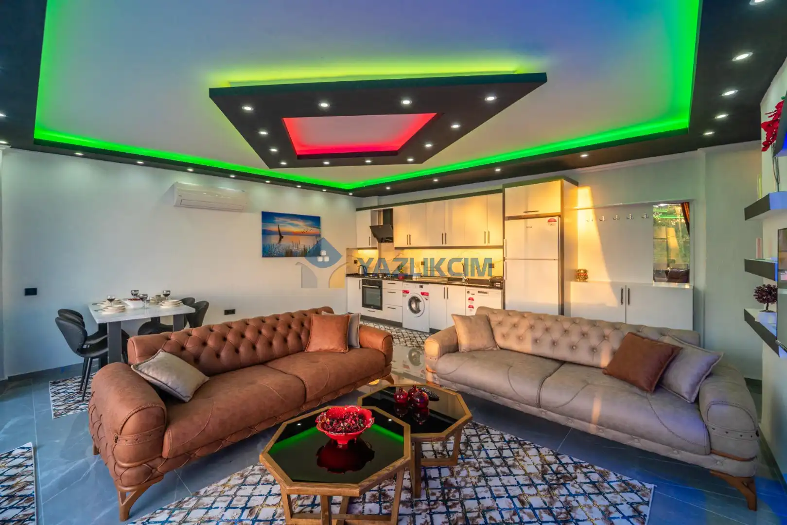 Salon Detayları: LCD TV, modern oturma grubu, yemek masası ve sandalyeler, kablosuz modem bulunmaktadır.