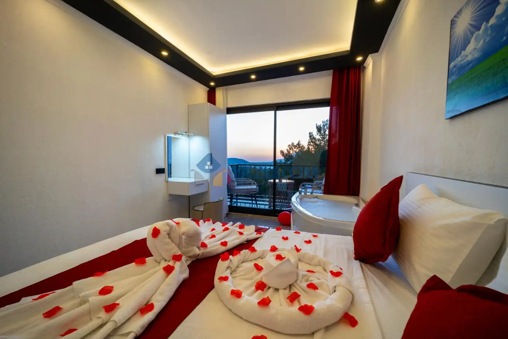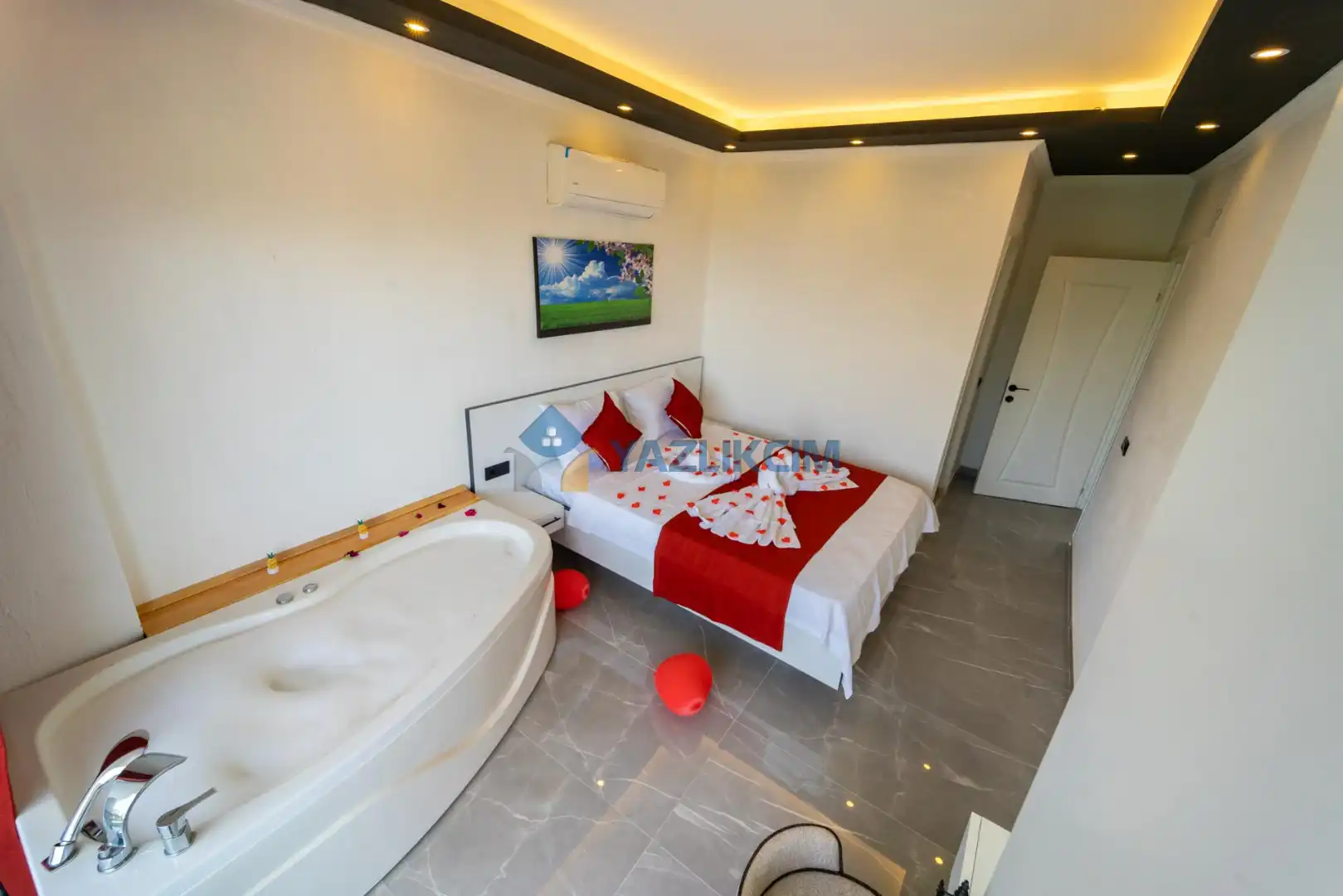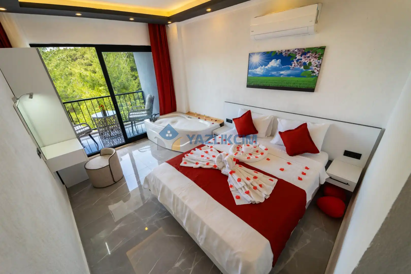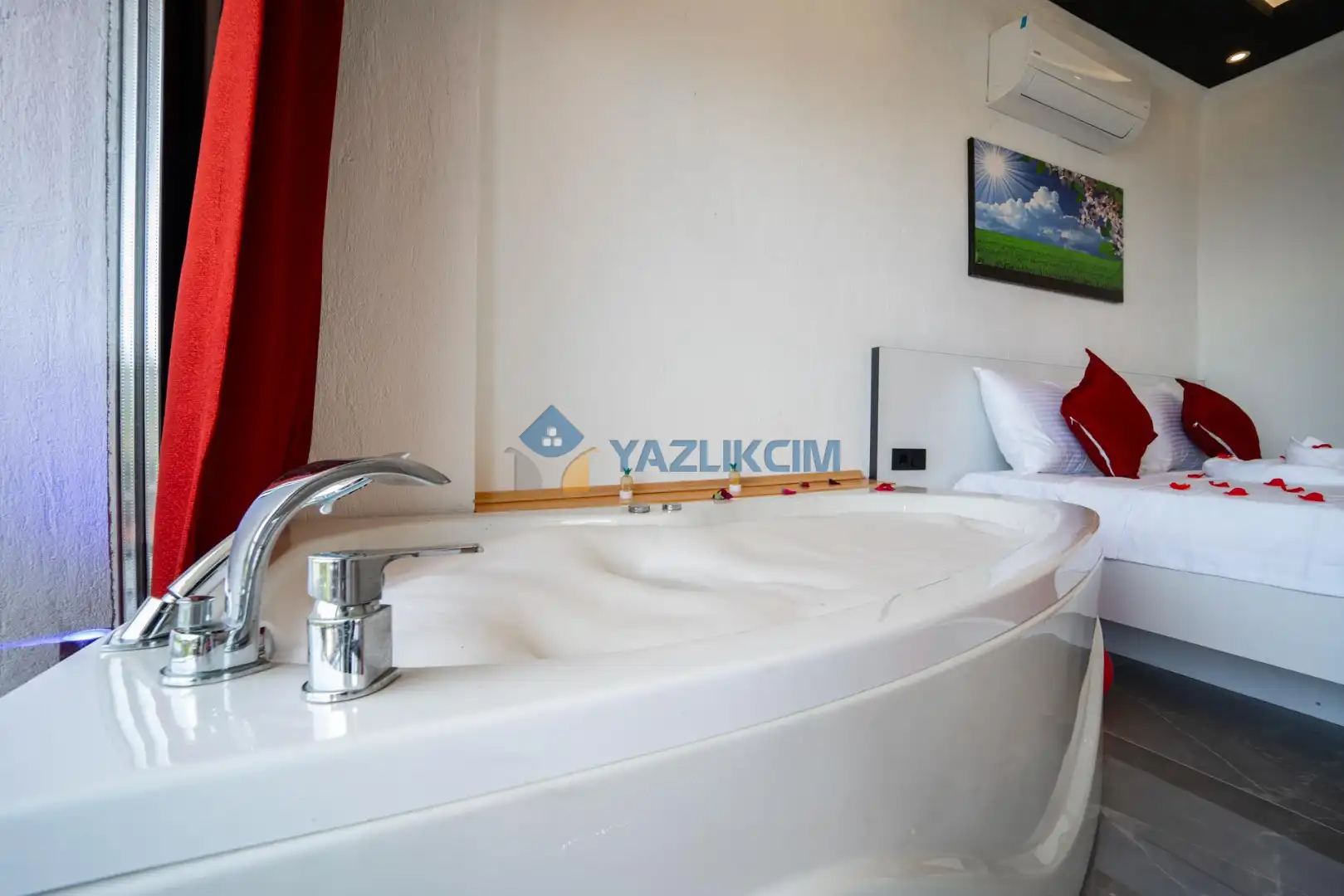 Detayları : Çift kişilik yatak, jakuzi, klima, komidin, elbise dolabı, makyaj masası, banyo ve lavabo bulunmaktadır.