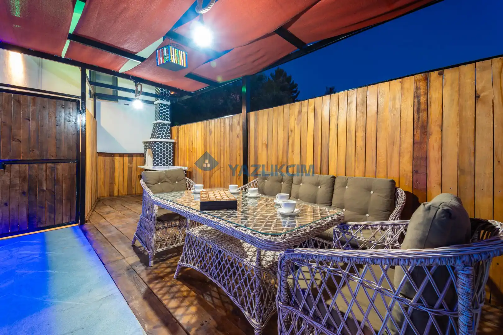 Detayları : Şezlong, güneşlenme şemsiyesi, salıncak, barbekü, masa tenisi, yemek masası ve sandalyeleri bulunmaktadır.