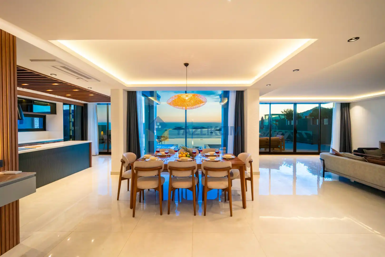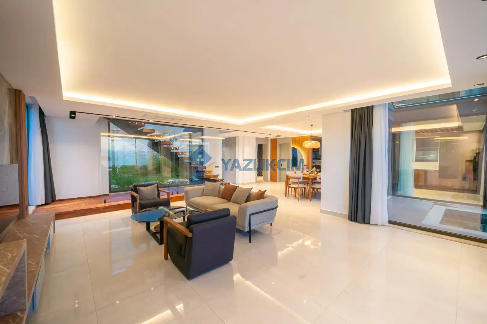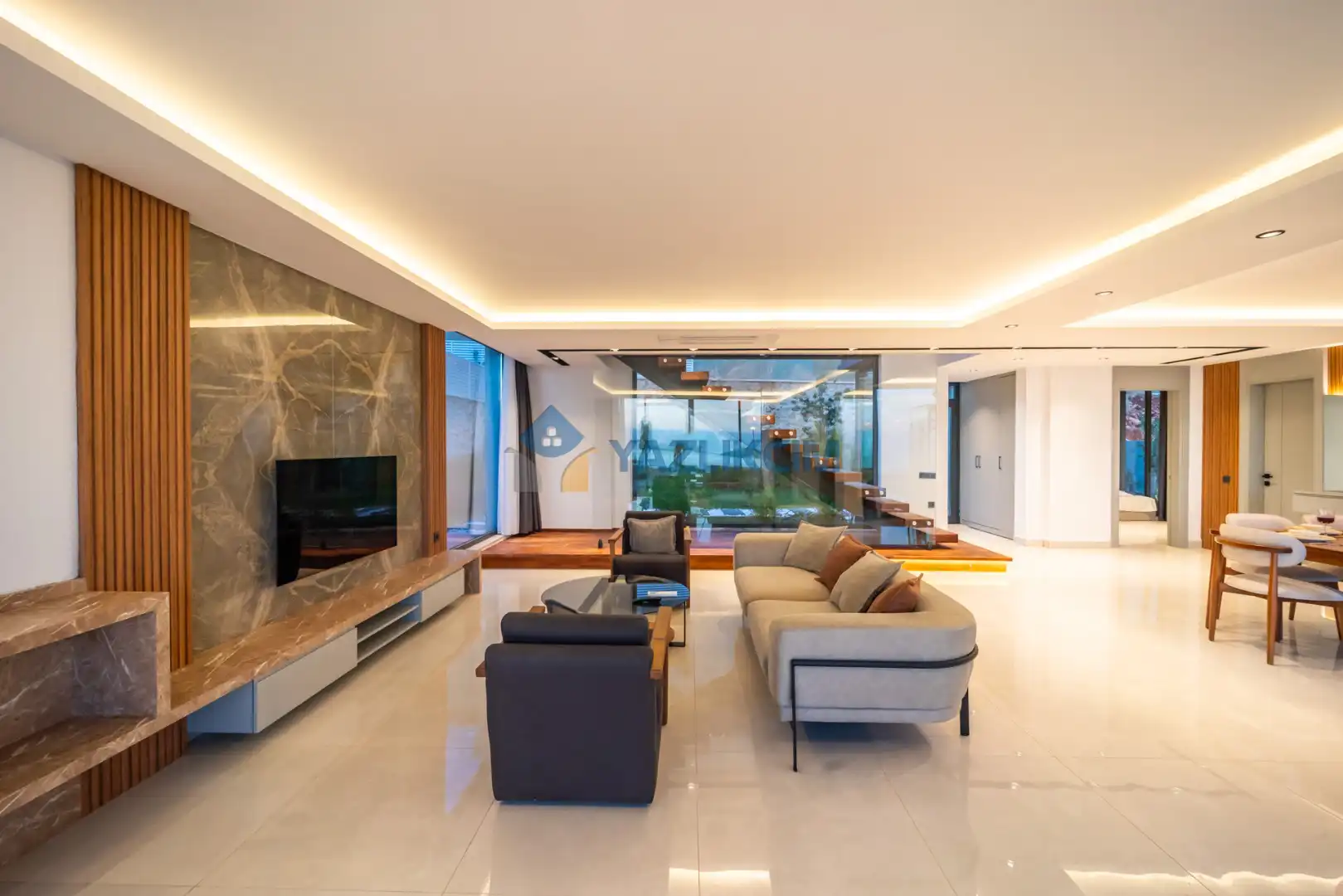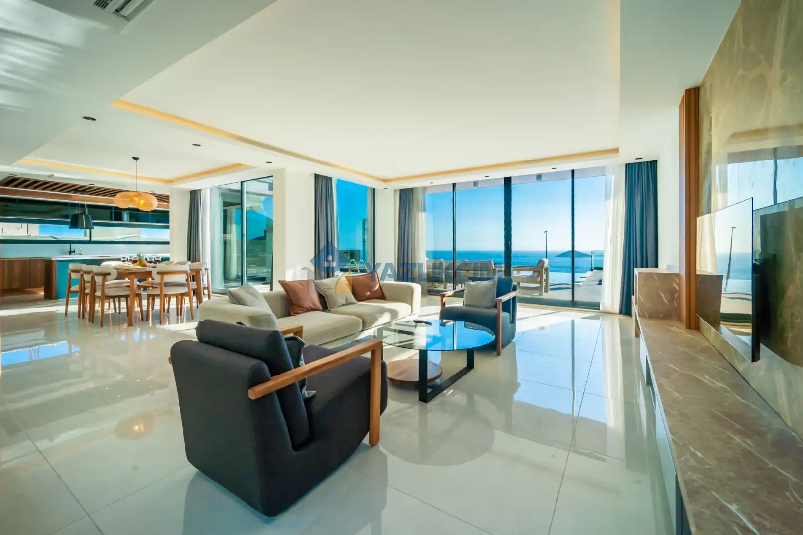 Salon Detayları: LCD TV, uydu alıcı, modern oturma grubu, yemek masası ve sandalyeler bulunmaktadır.