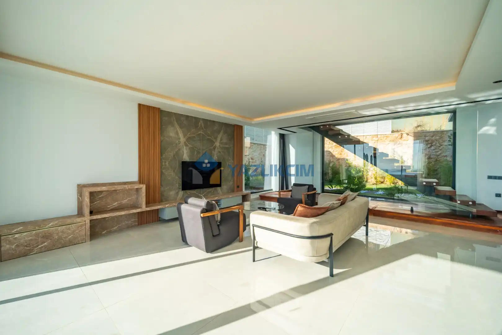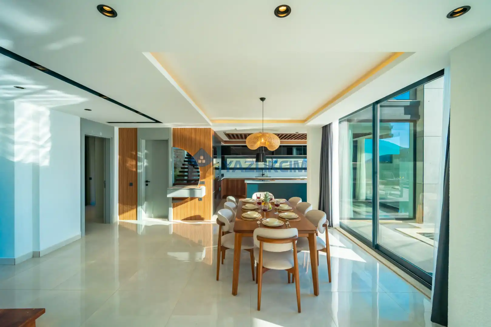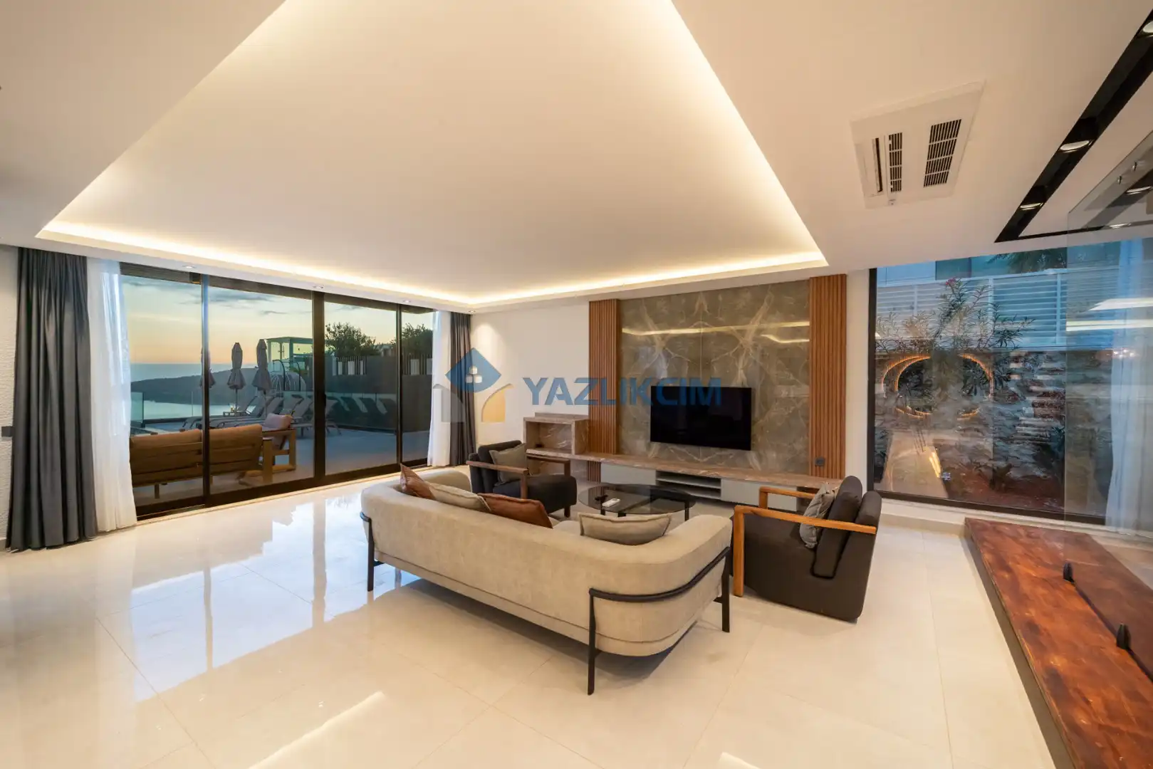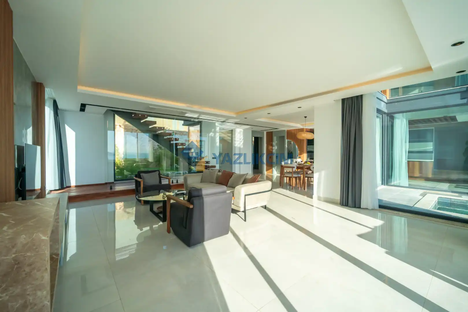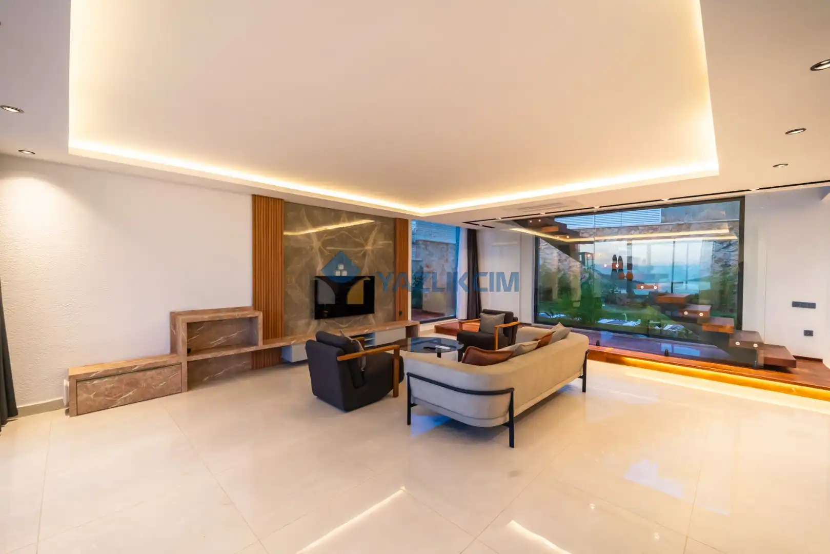 Salon Detayları: LCD TV, uydu alıcı, modern oturma grubu, yemek masası ve sandalyeler bulunmaktadır.