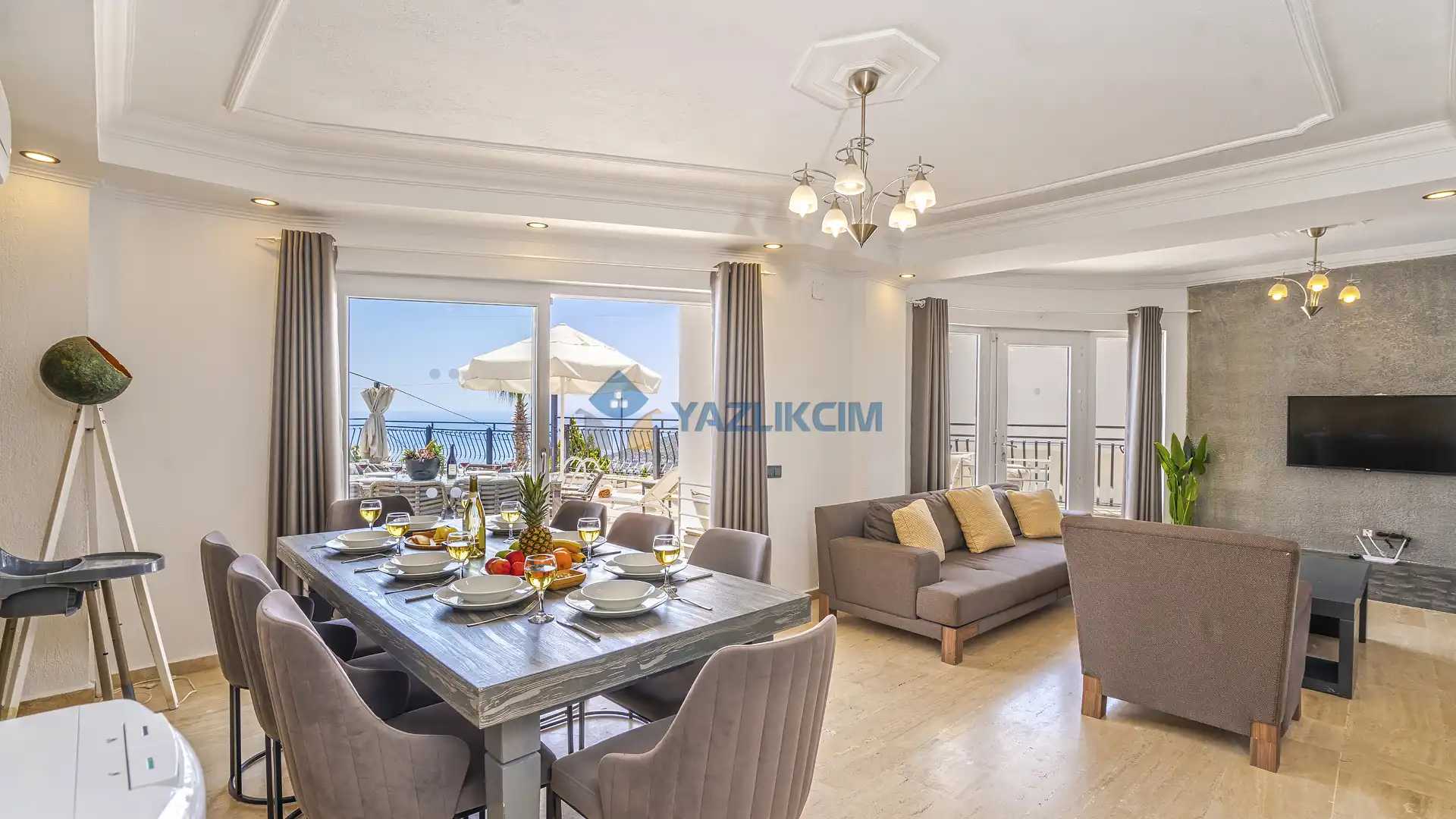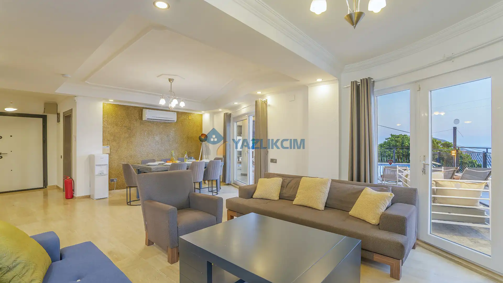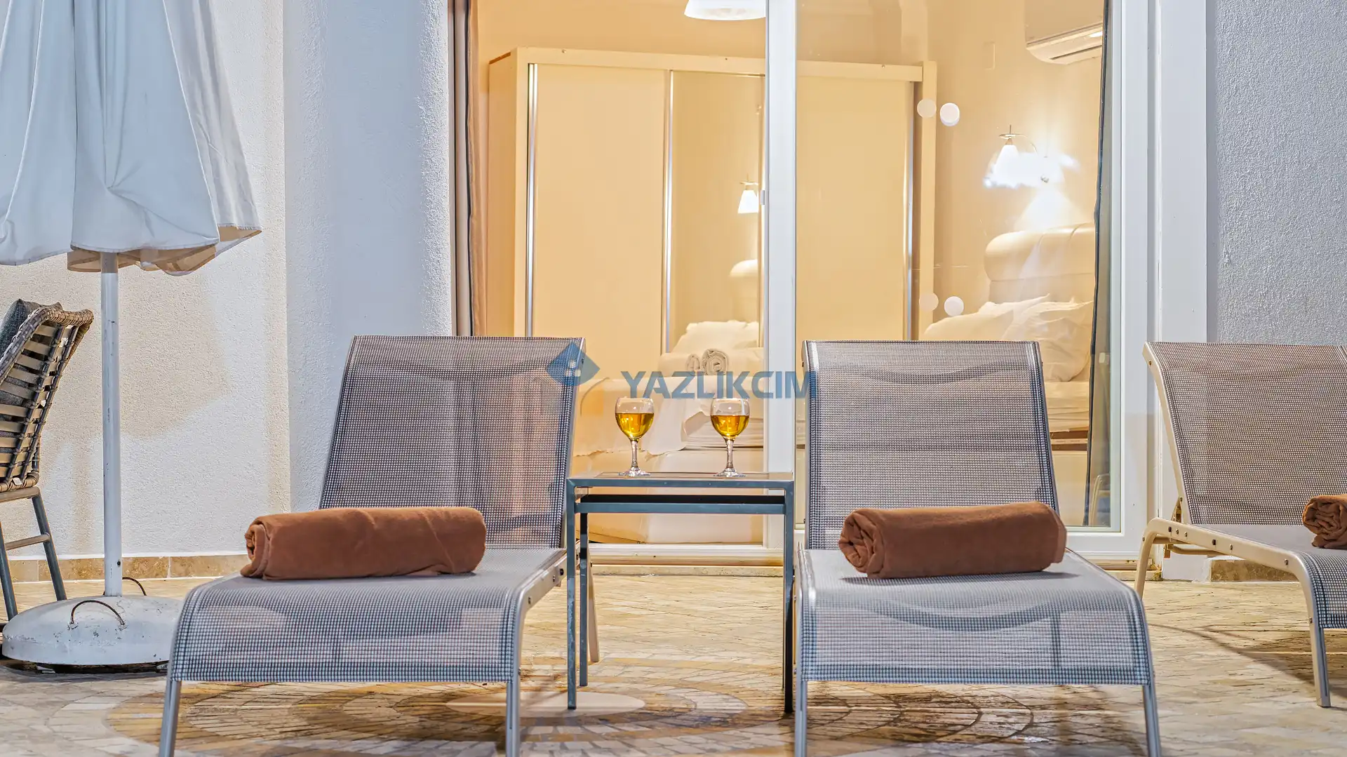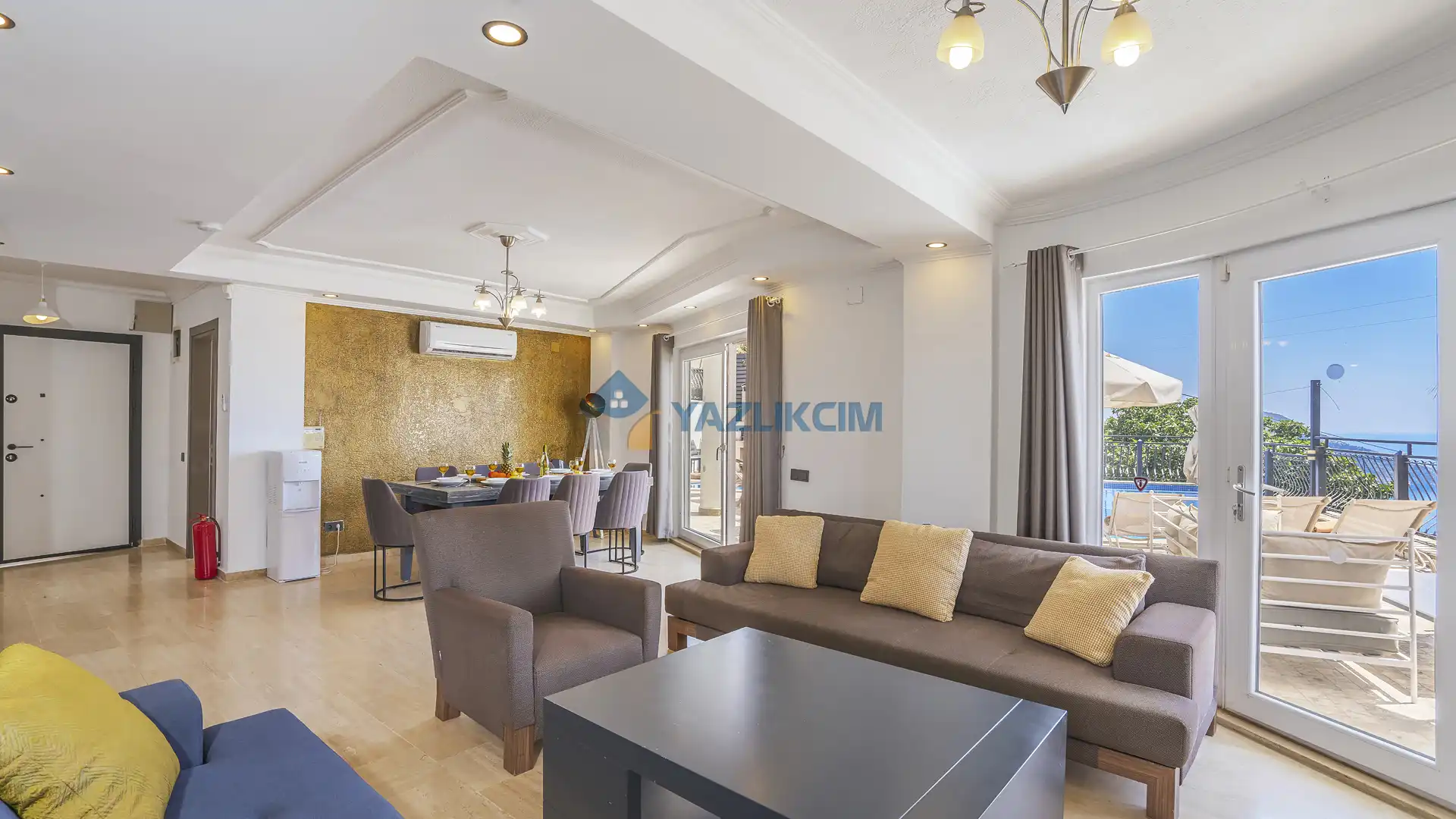 Salon Detayları: Uydu alıcı, TV, oturma grubu, ütü ve ütü masası, lavabo yer almaktadır ve havuz kenarına çıkış vardır.