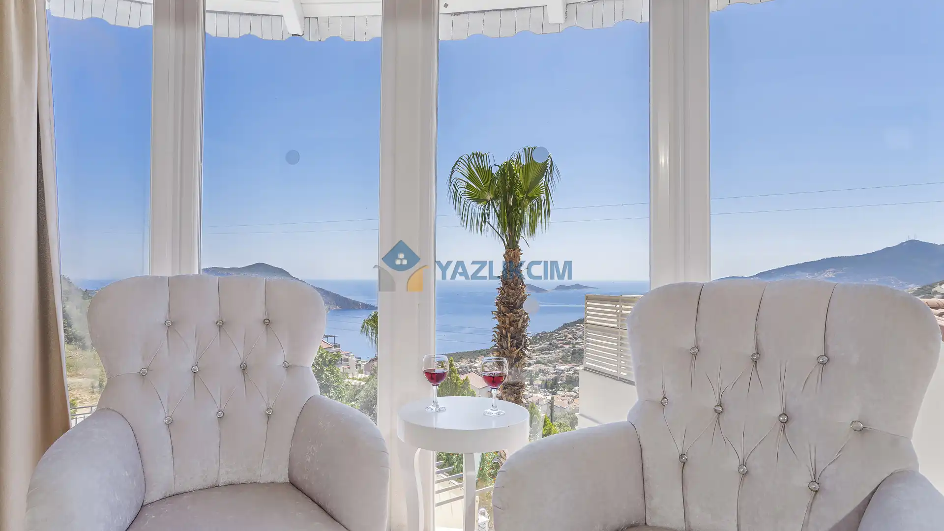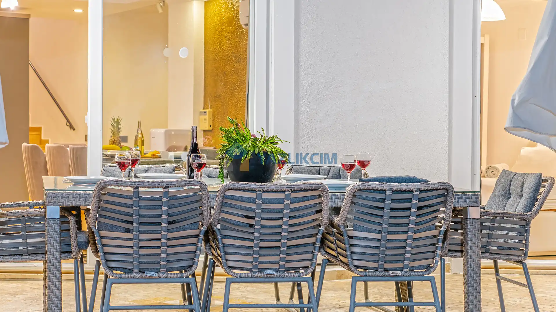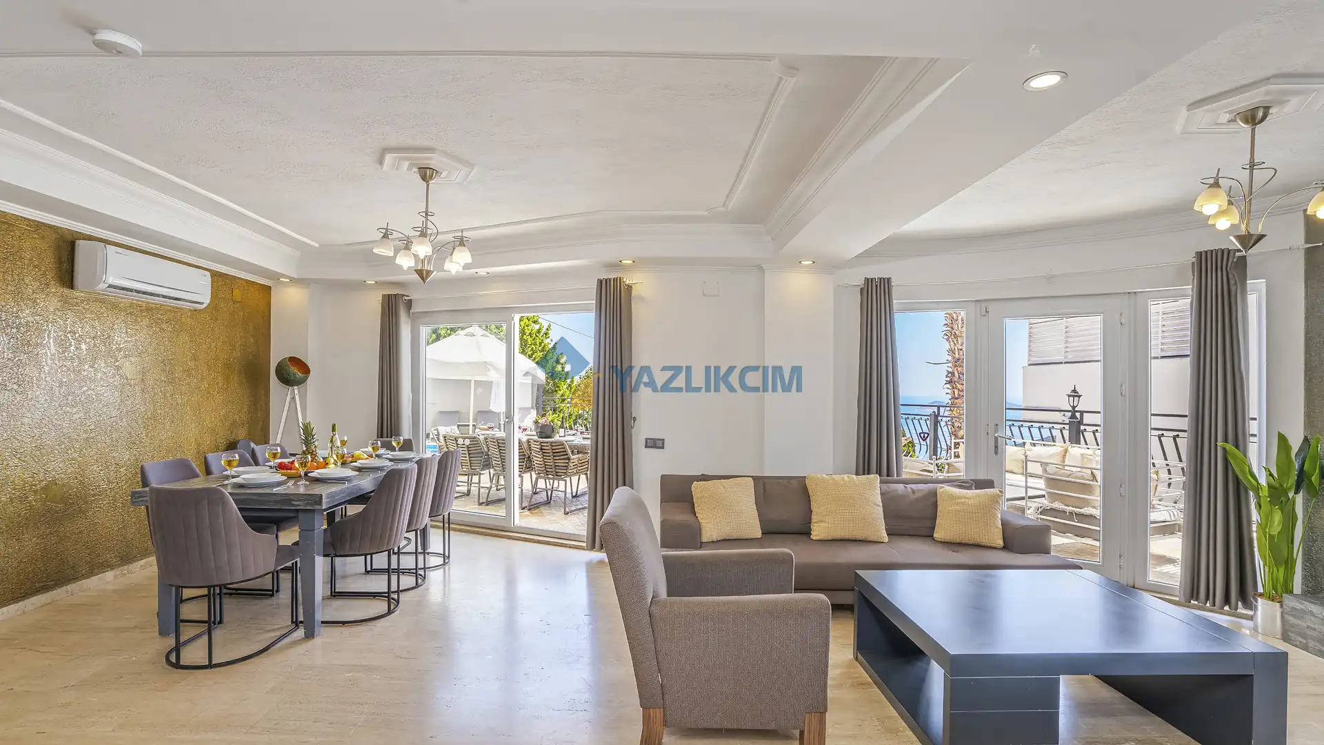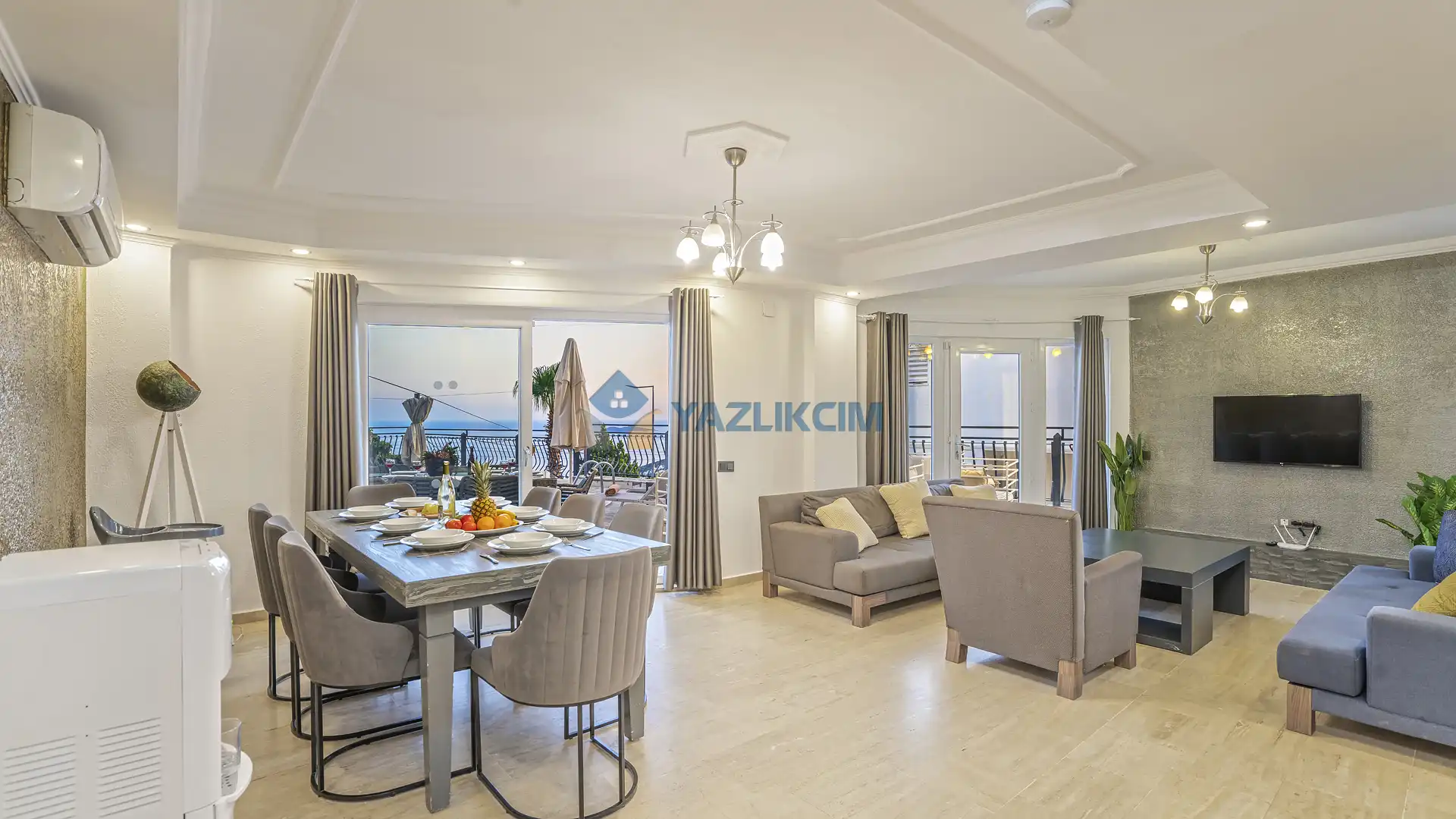 Salon Detayları: Uydu alıcı, TV, oturma grubu, ütü ve ütü masası, lavabo yer almaktadır ve havuz kenarına çıkış vardır.