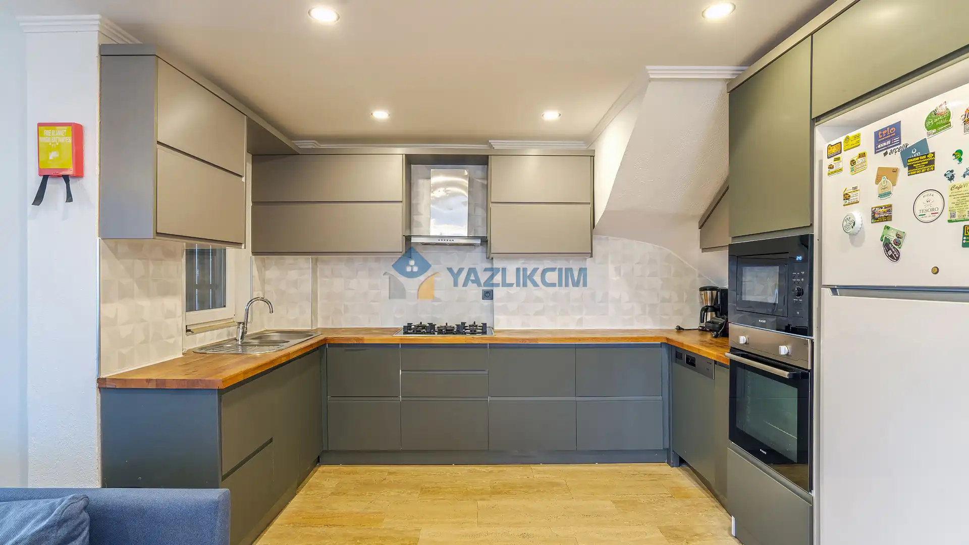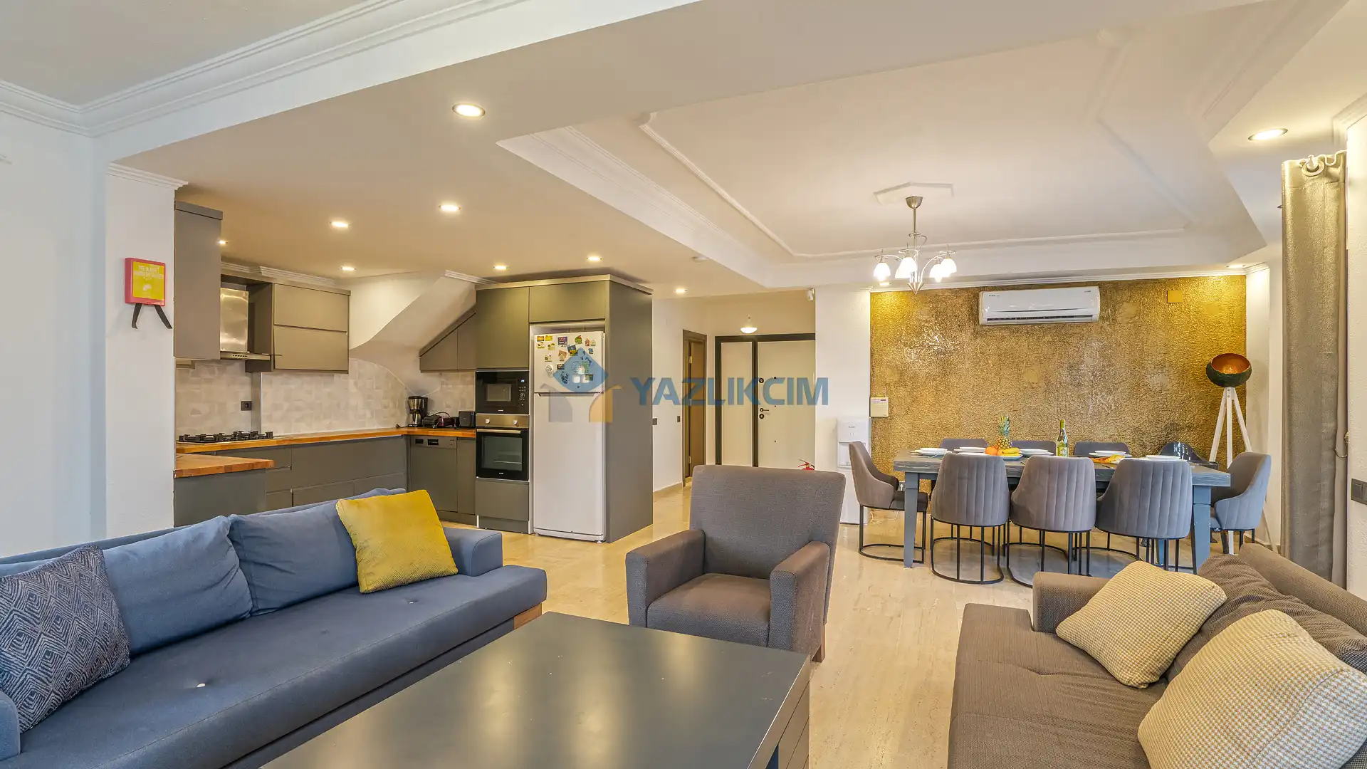 Mutfak Detayları: Bulaşık makinası, ankastre fırın, buzdolabı, çamaşır makinası, ankastre 4’lü ocak, elektrikli su ısıtıcı kettle, tencere ve tava takımı, 12 kişilik yemek takımı, kaşık ve çatal seti ve bardaklar bulunmaktadır.