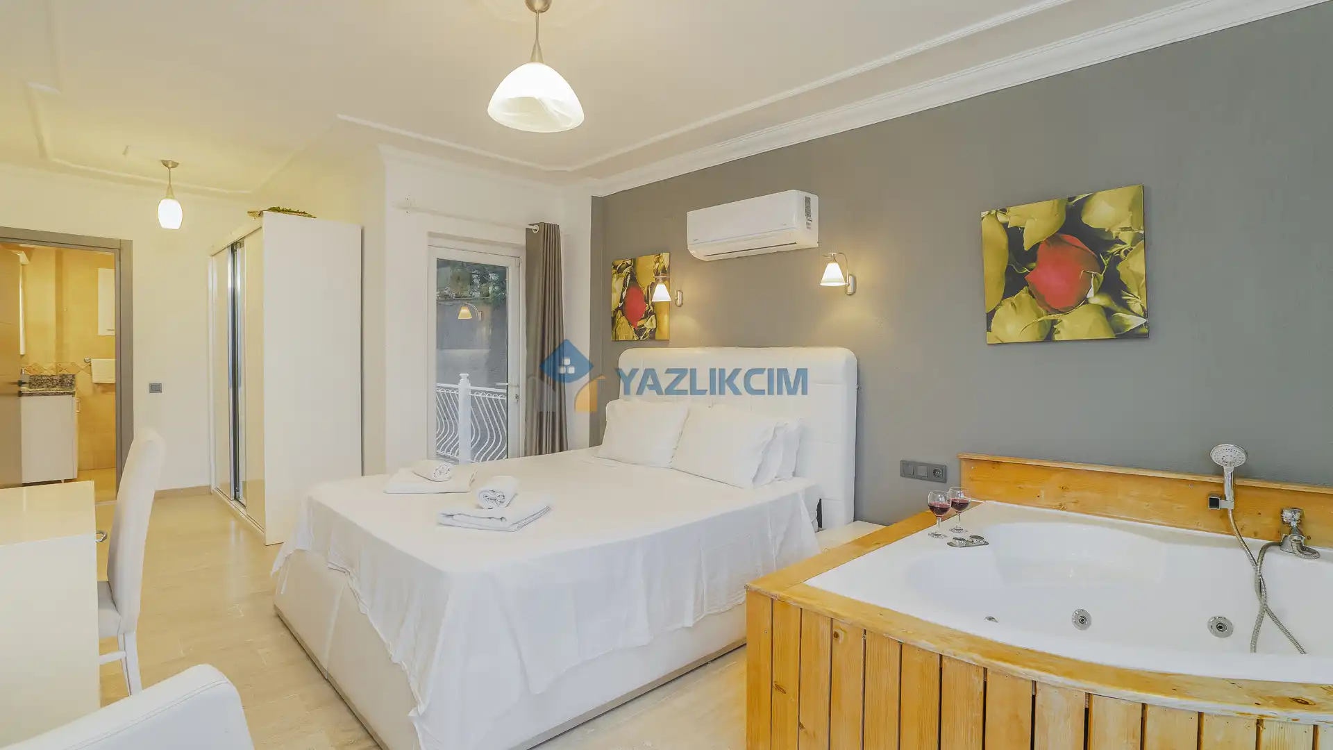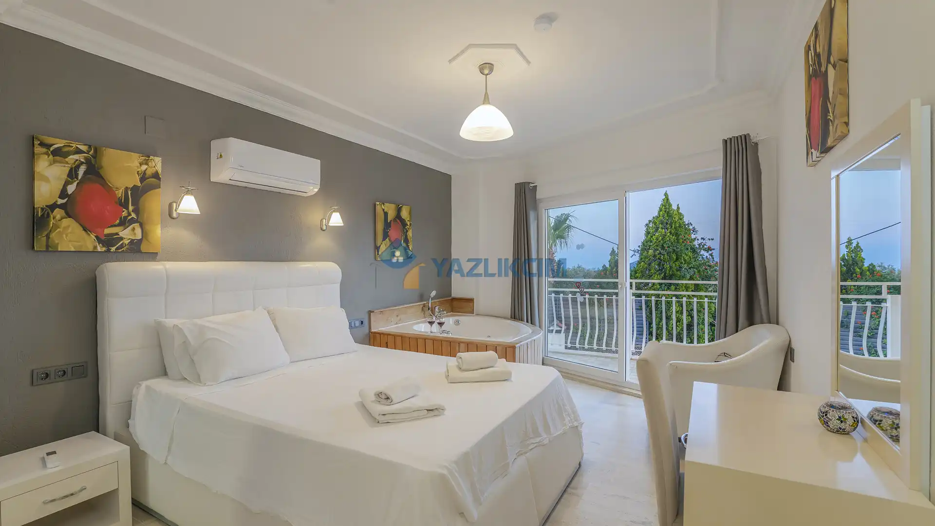 Detayları : 1 adet çift kişilik yatak, elbise dolabı, klima, jakuzi, komodin, makyaj masası, banyo ve lavabo bulunmaktadır.