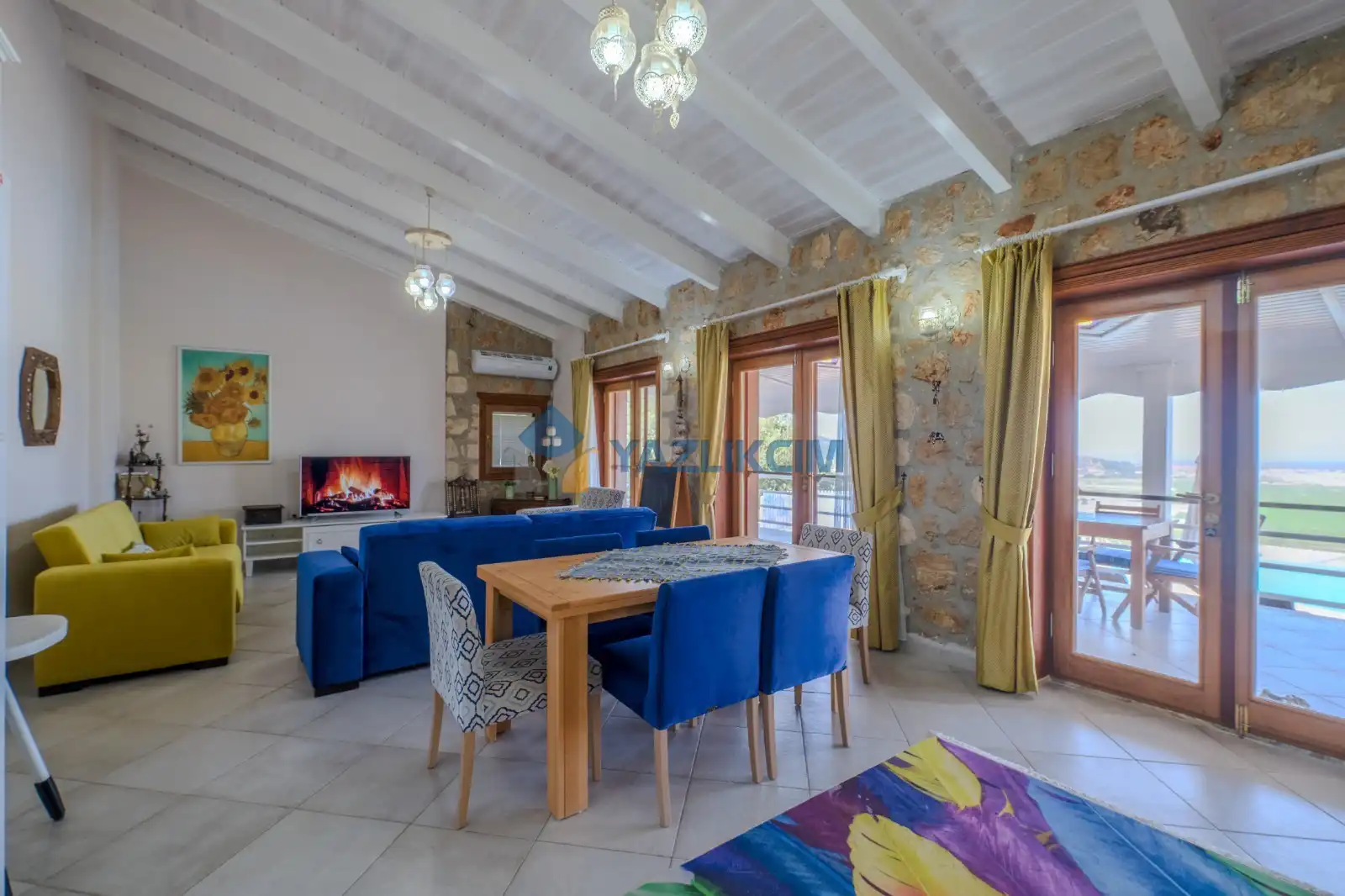 Salon Detayları: LCD TV, modern oturma grubu, yemek masası ve sandalyeler, kablosuz modem bulunmaktadır.