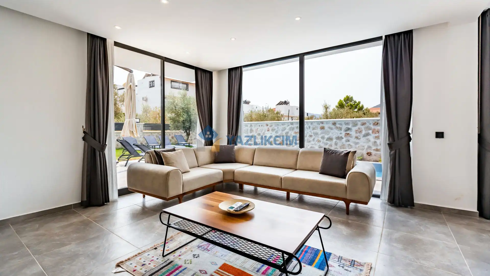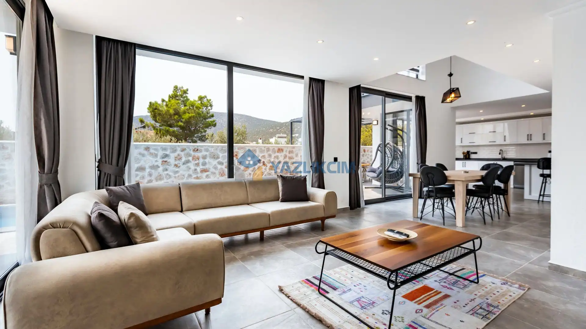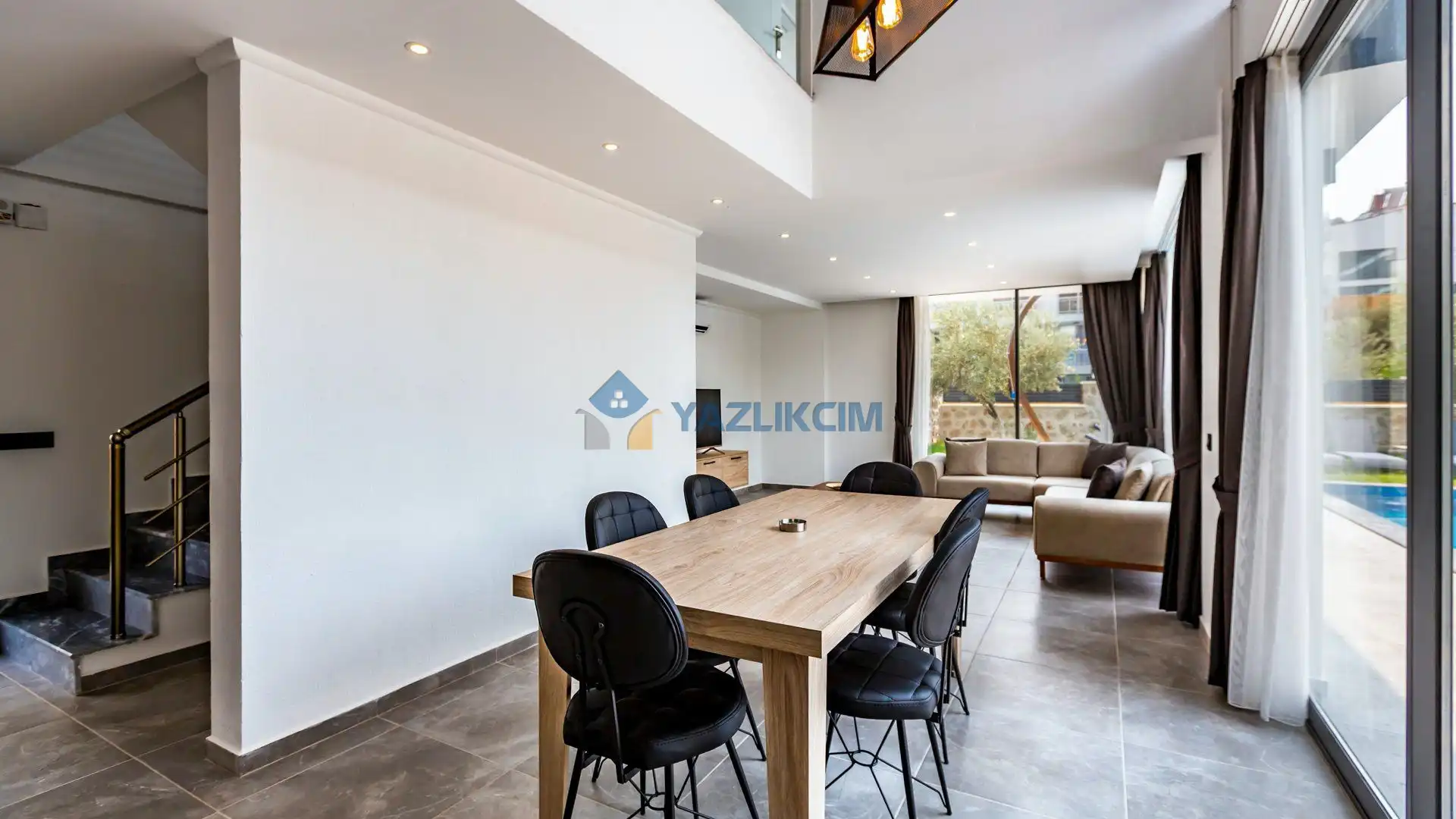 Salon Detayları: LCD TV, modern oturma grubu, yemek masası ve sandalyeler, kablosuz modem bulunmaktadır.