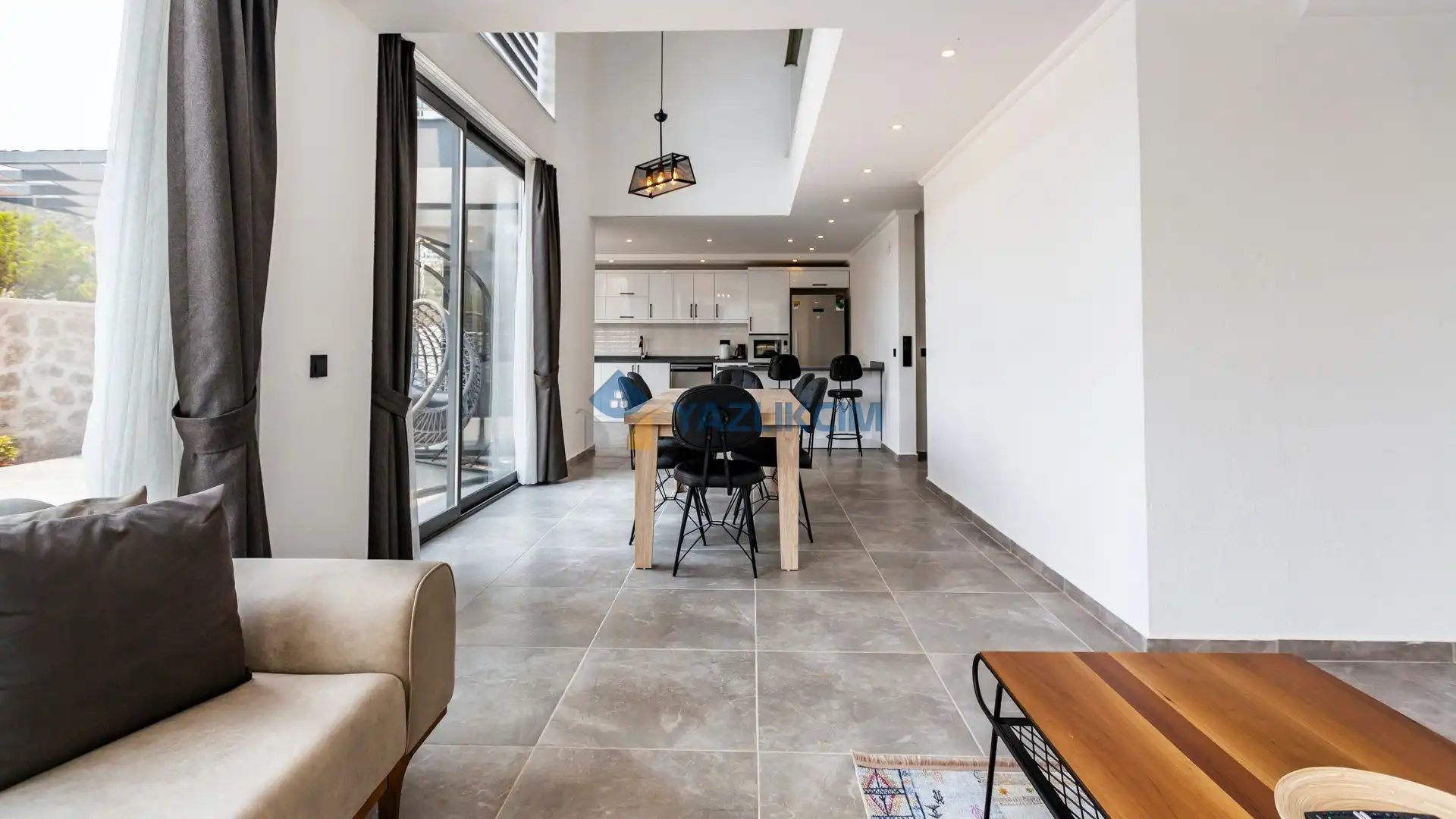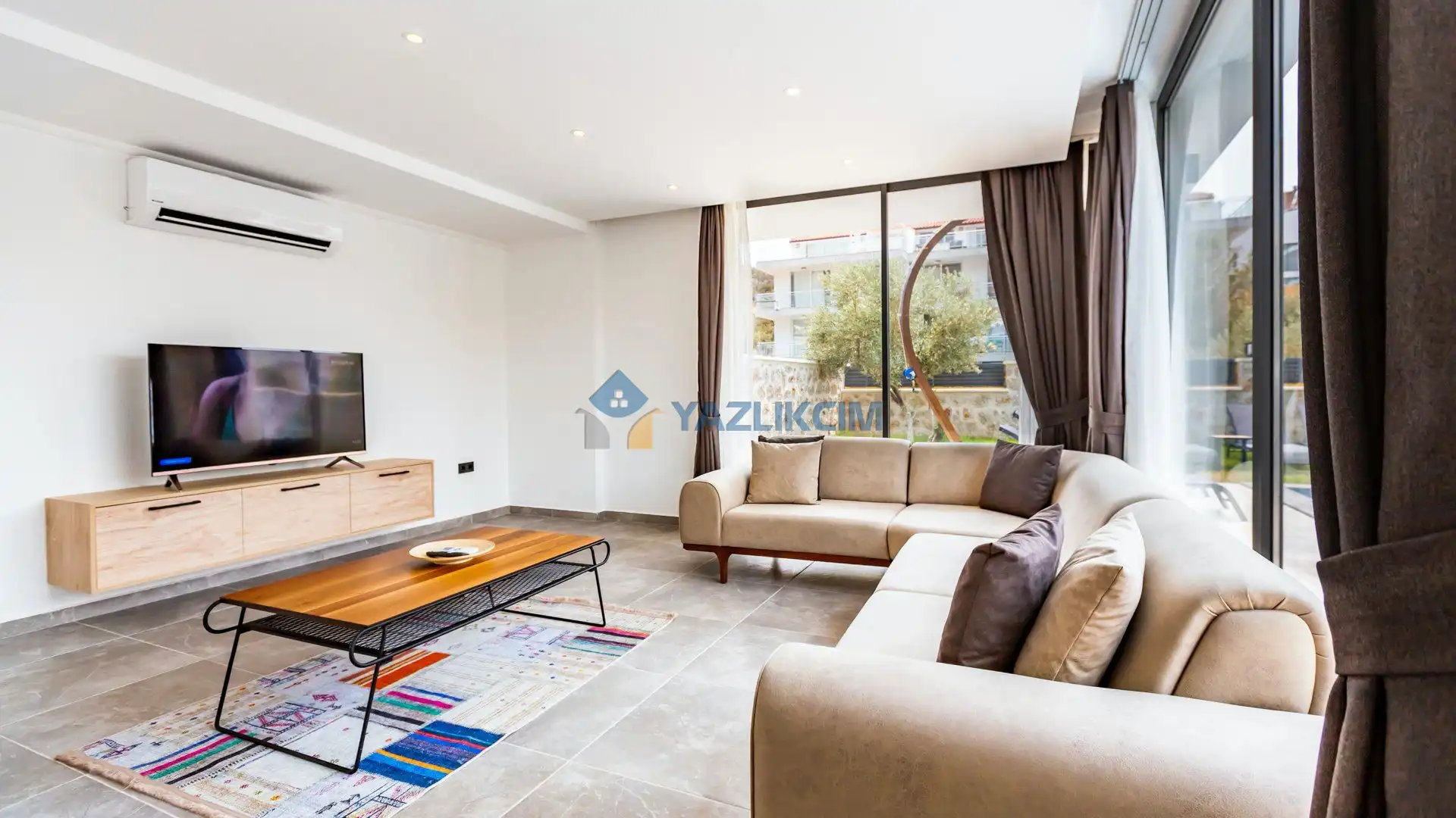 Salon Detayları: LCD TV, modern oturma grubu, yemek masası ve sandalyeler, kablosuz modem bulunmaktadır.