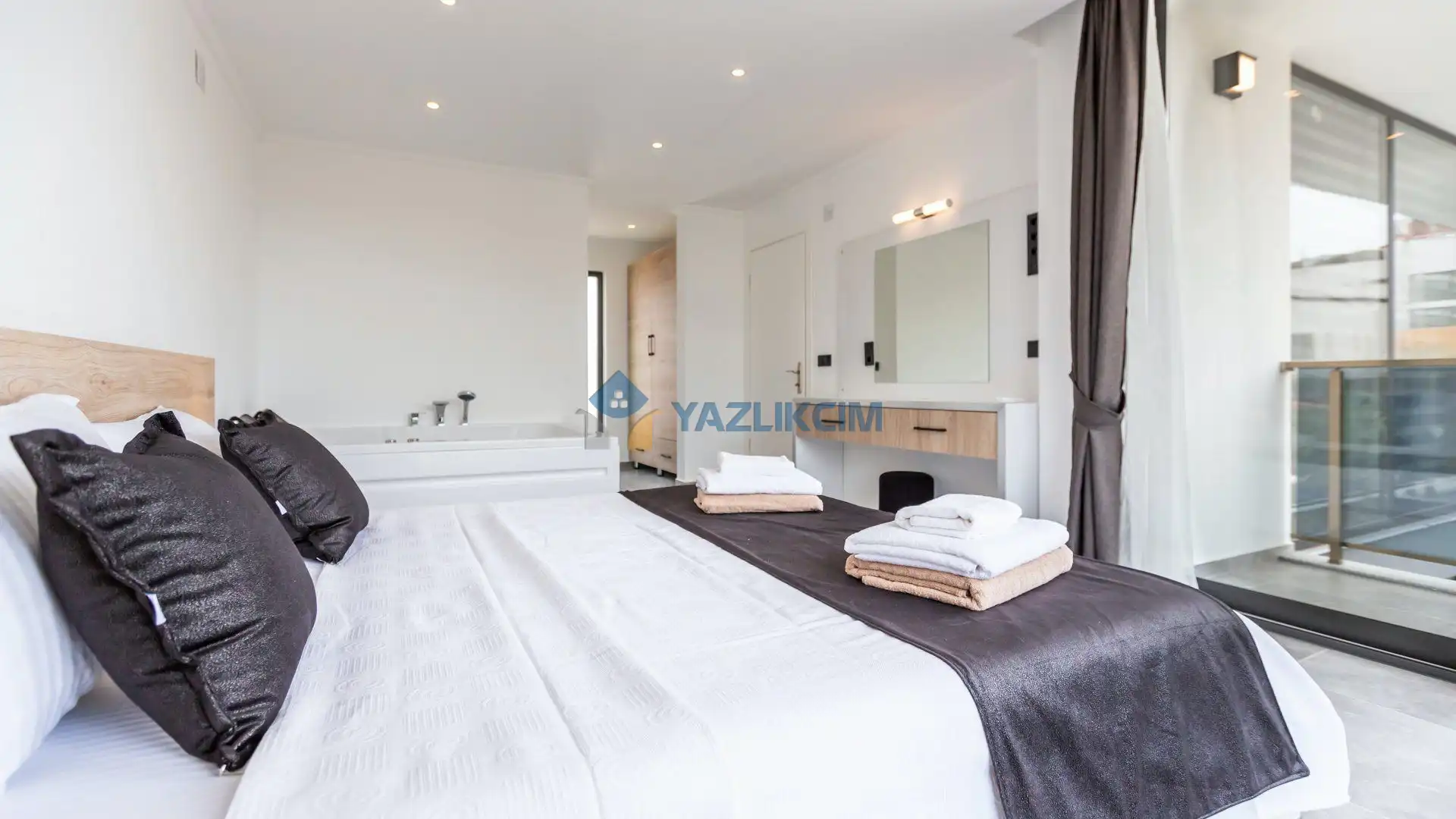 Detayları : Çift kişilik yatak, klima, komodin, jakuzi ,elbise dolabı, makyaj masası, banyo ve lavabo ,Balkonda jakuzi bulunmaktadır.