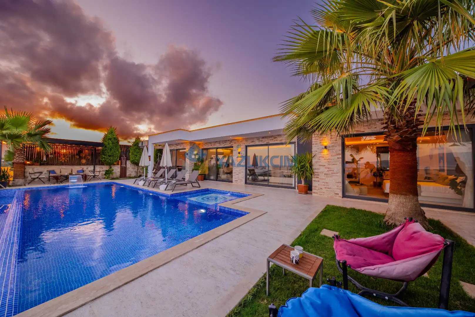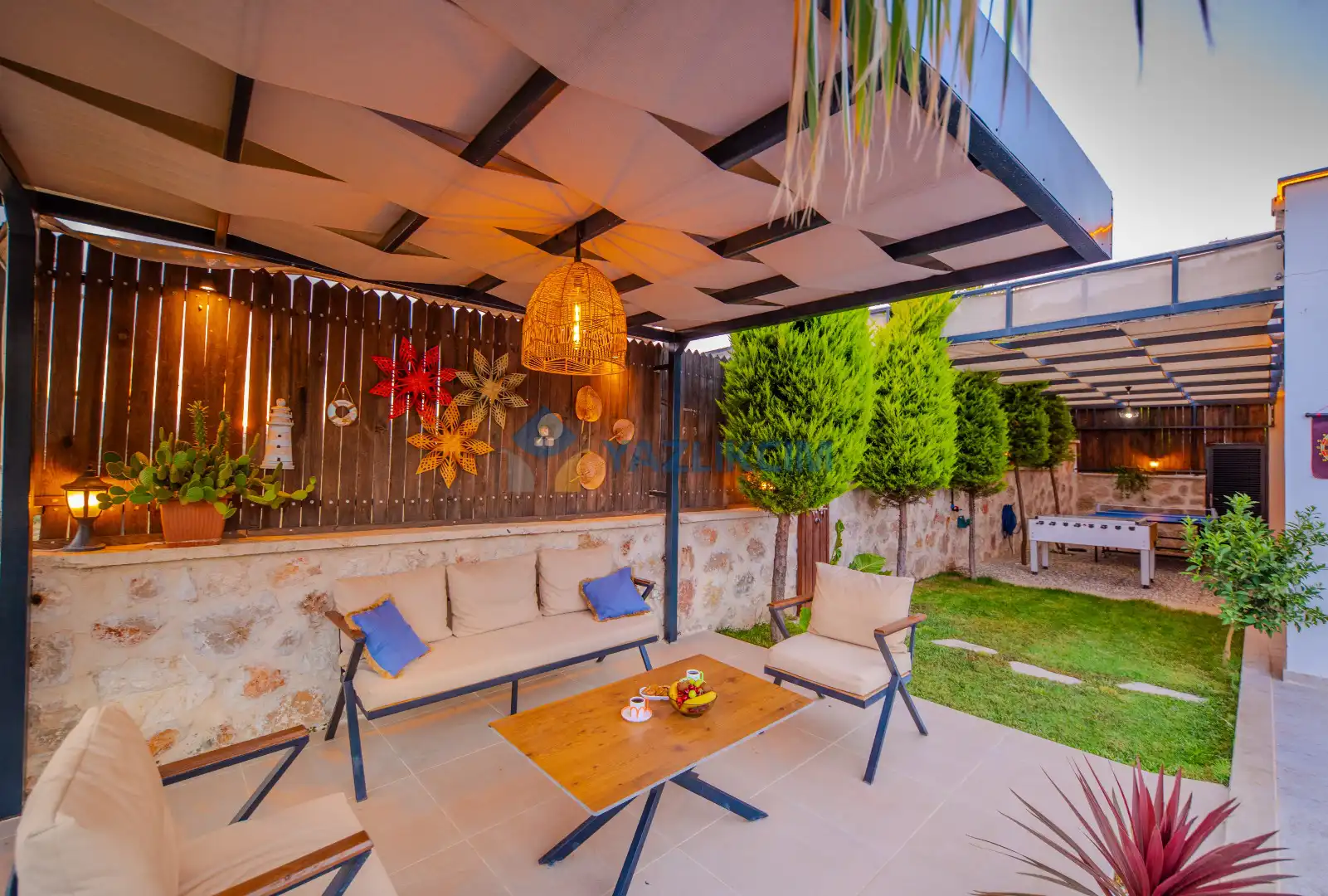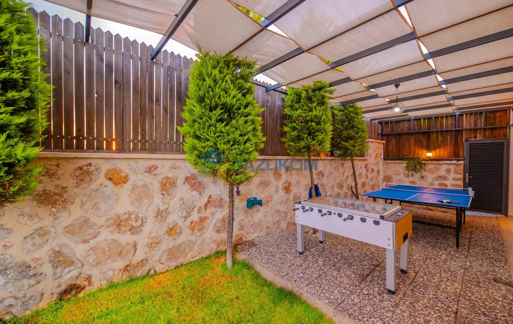 Detayları : Şezlong, güneşlenme şemşiyesi, park yatak,langırt , masa tenisi , sauna, barbekü, yemek masası ve sandalyeleri bulunmaktadır.
