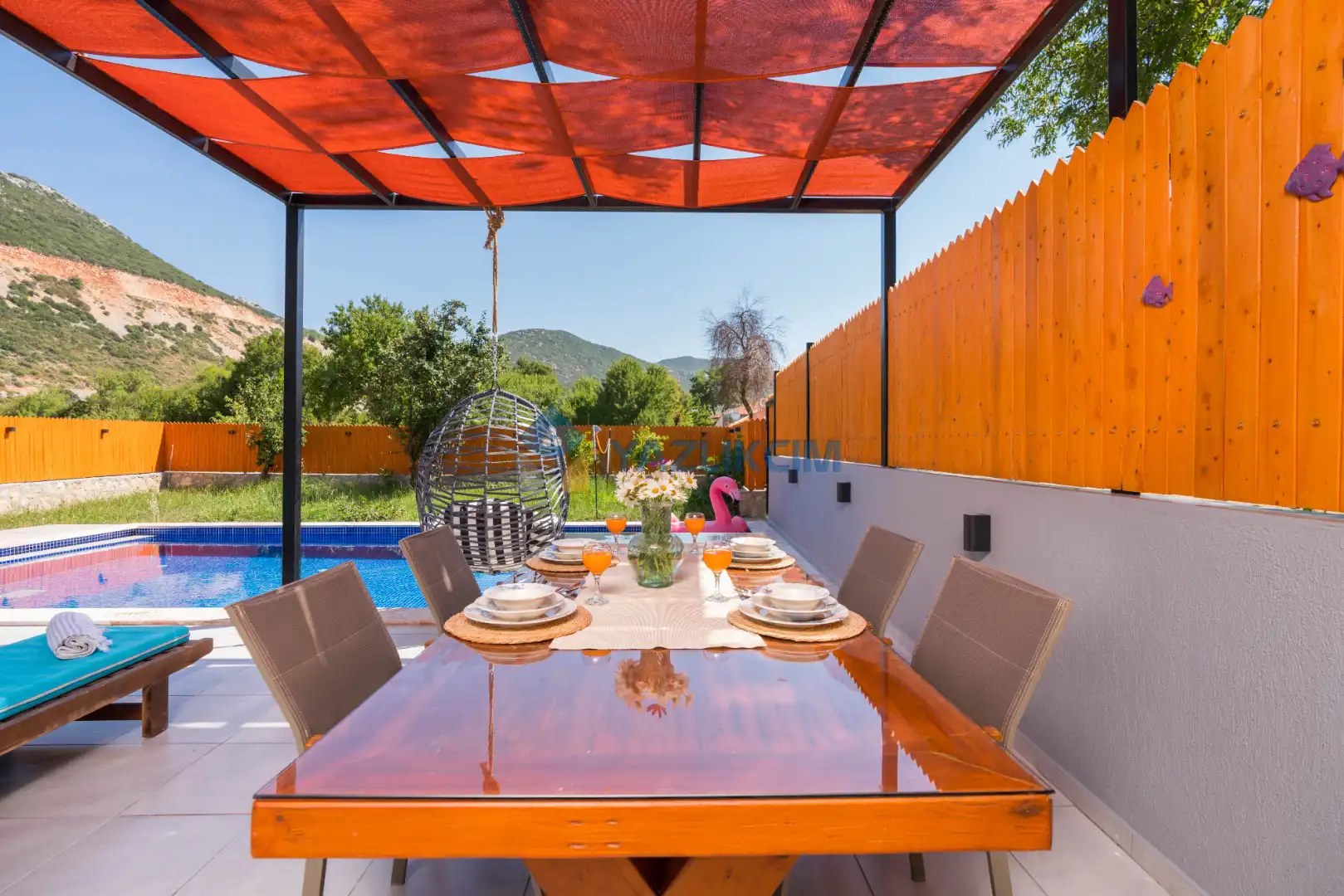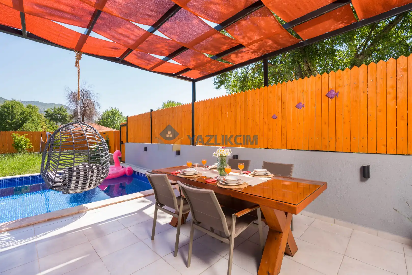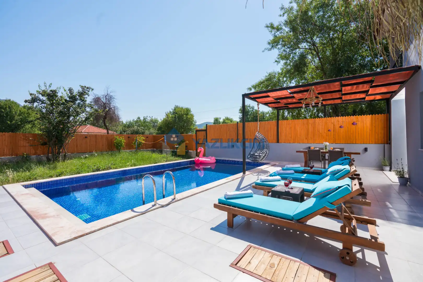 Detayları: Şezlong, güneşlenme şemsiyesi, barbekü, salıncak, yemek masası ve sandalyeleri bulunmaktadır.