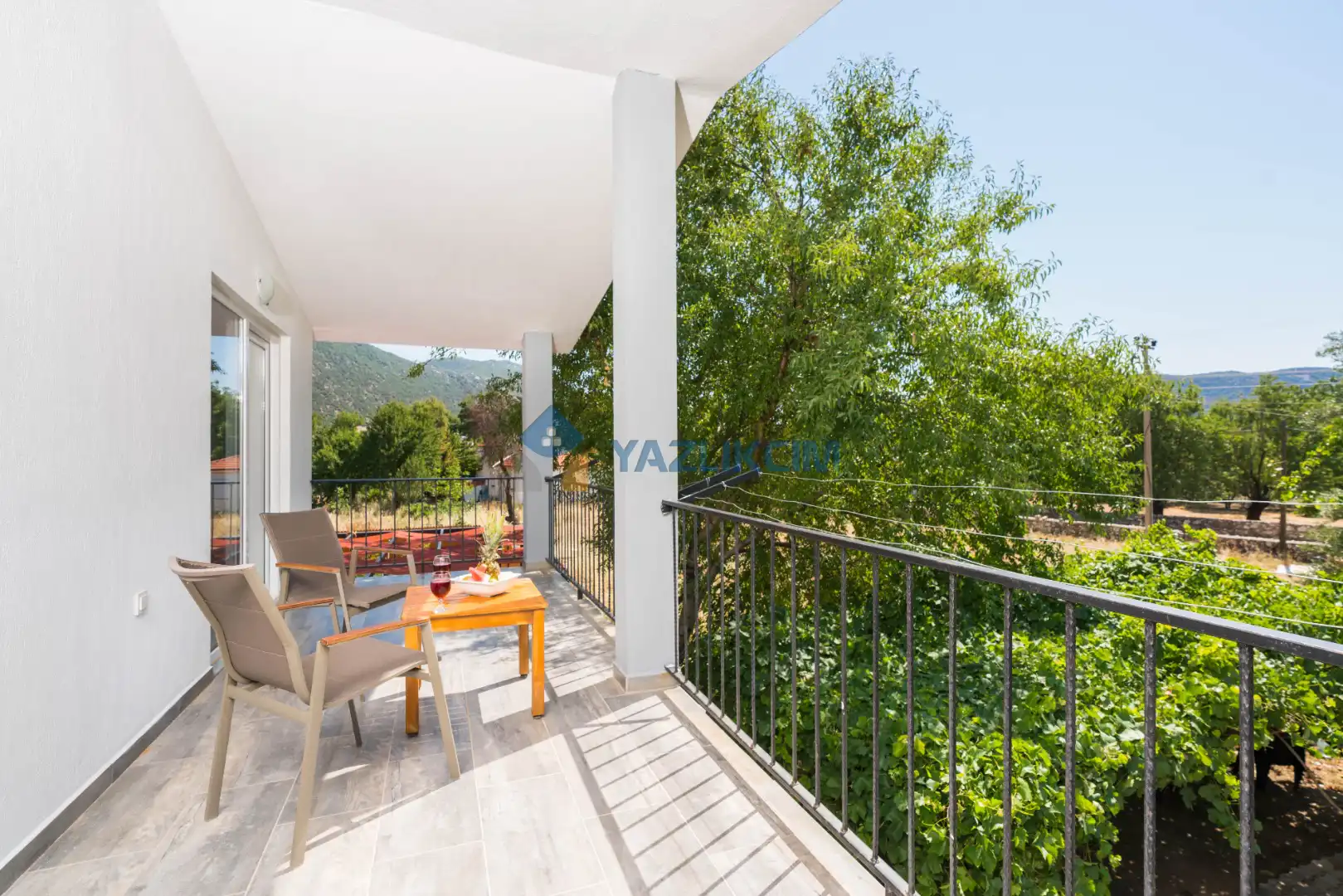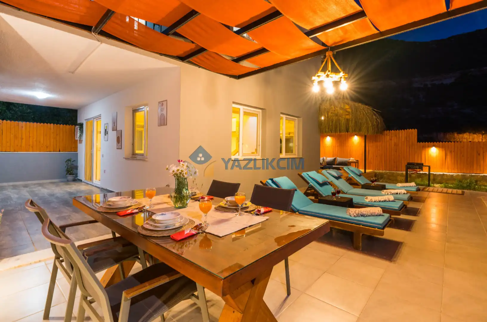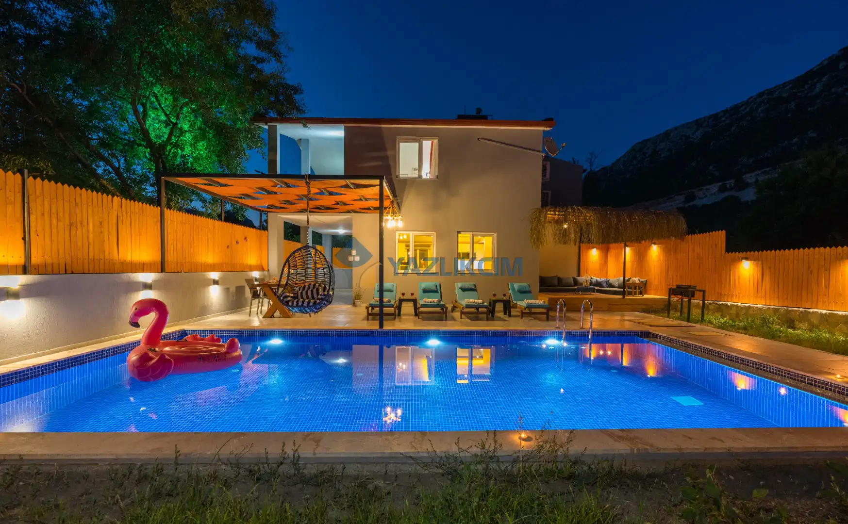 Detayları: Şezlong, güneşlenme şemsiyesi, barbekü, salıncak, yemek masası ve sandalyeleri bulunmaktadır.