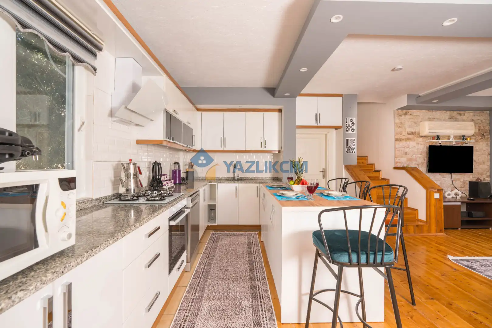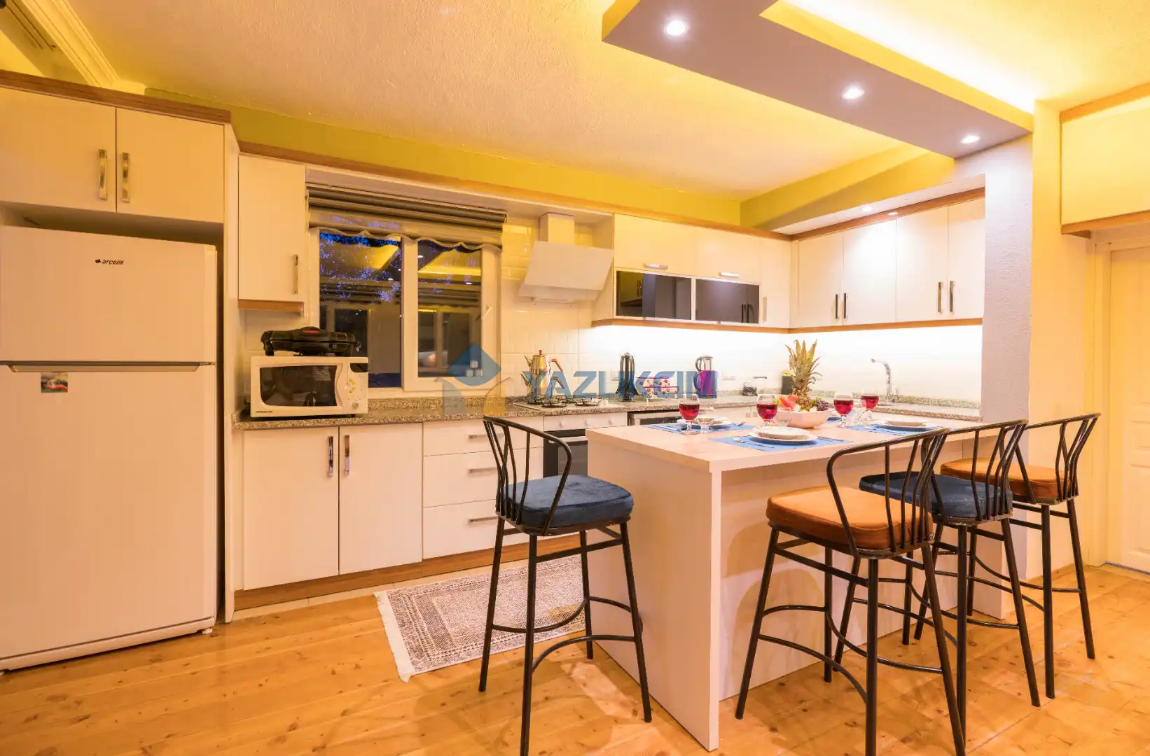 Mutfak Detayları:  Buzdolabı, bulaşık makinesi, fırın, çamaşır makinesi, yemek takımı, tava-tencere, çatal-bıçak seti bulunmaktadır.