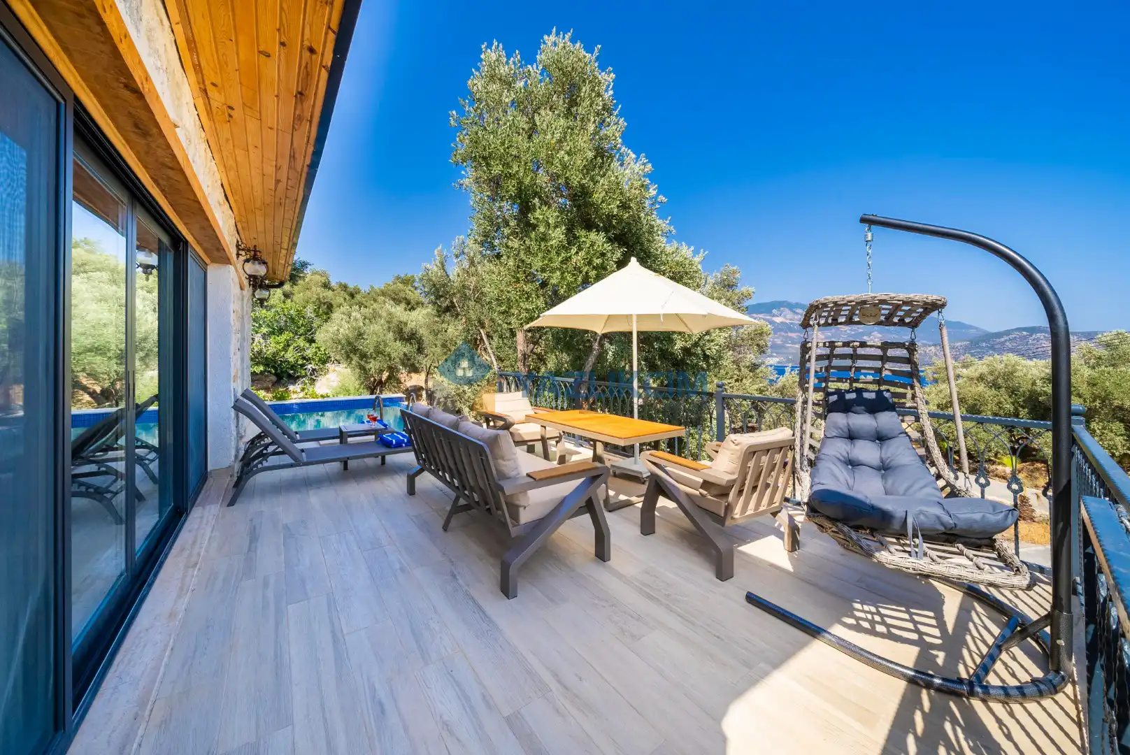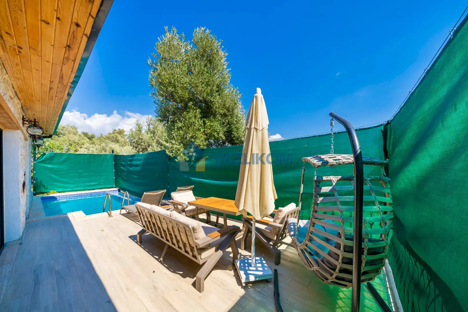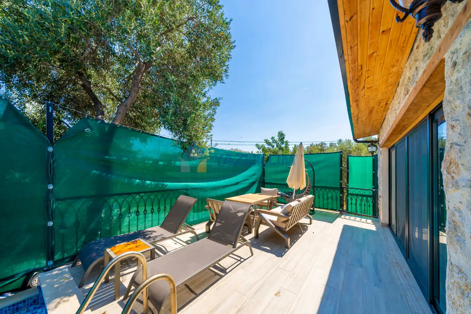 Detayları : Şezlong, güneşlenme şemsiyesi, barbekü, salıncak,  yemek masası ve sandalyeleri bulunmaktadır.