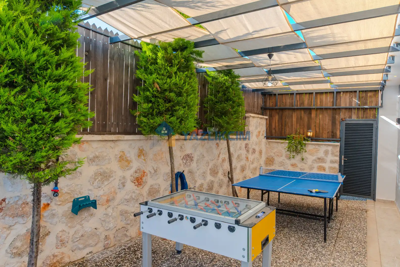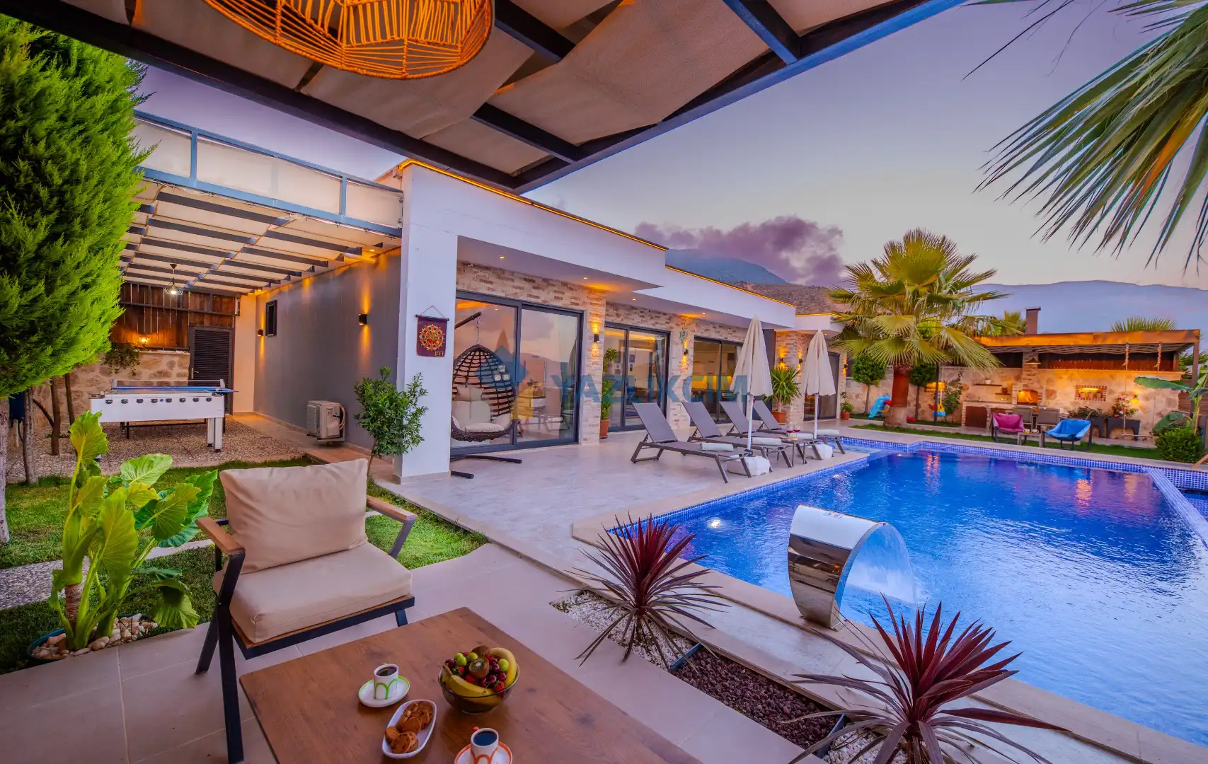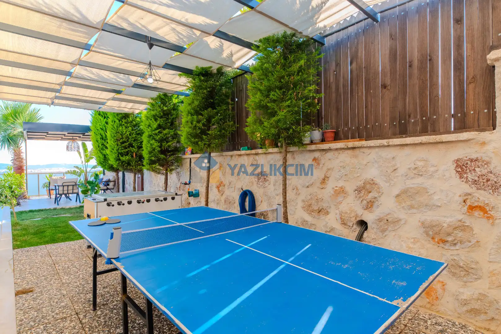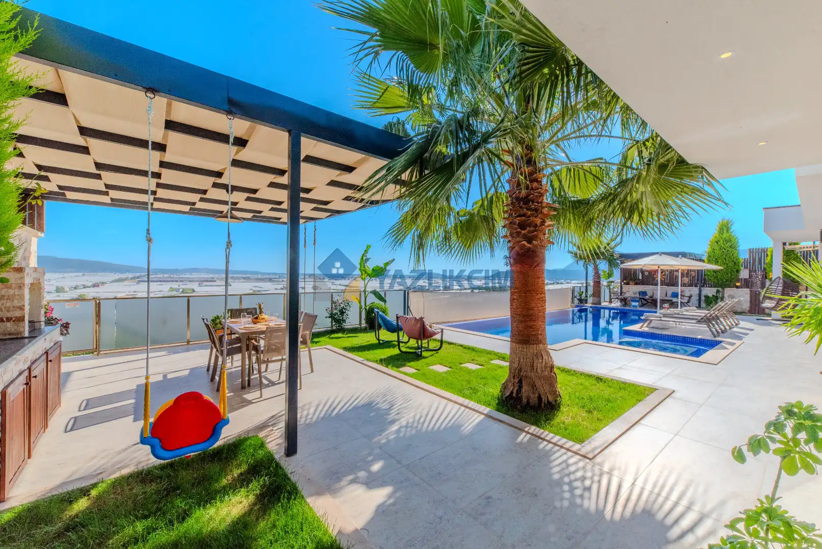Detayları : Şezlong , güneşlenme şemşiyesi , oyun parkı , salıncak, barbekü, yemek masası ve sandalyeleri bulunmaktadır.