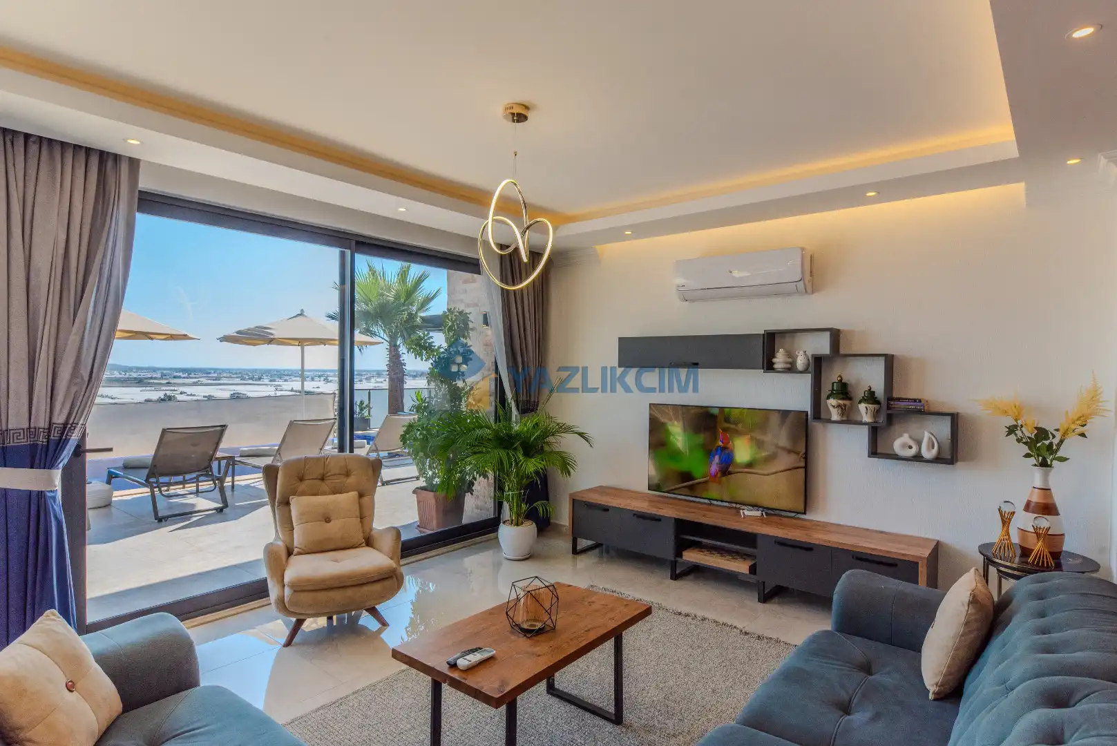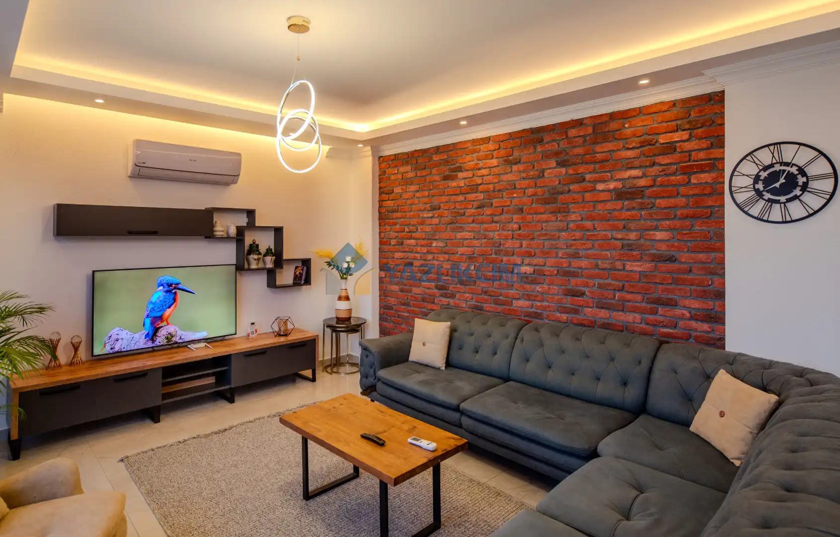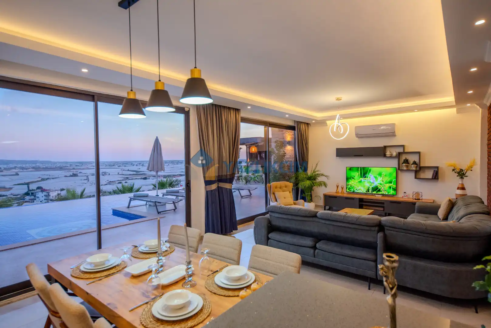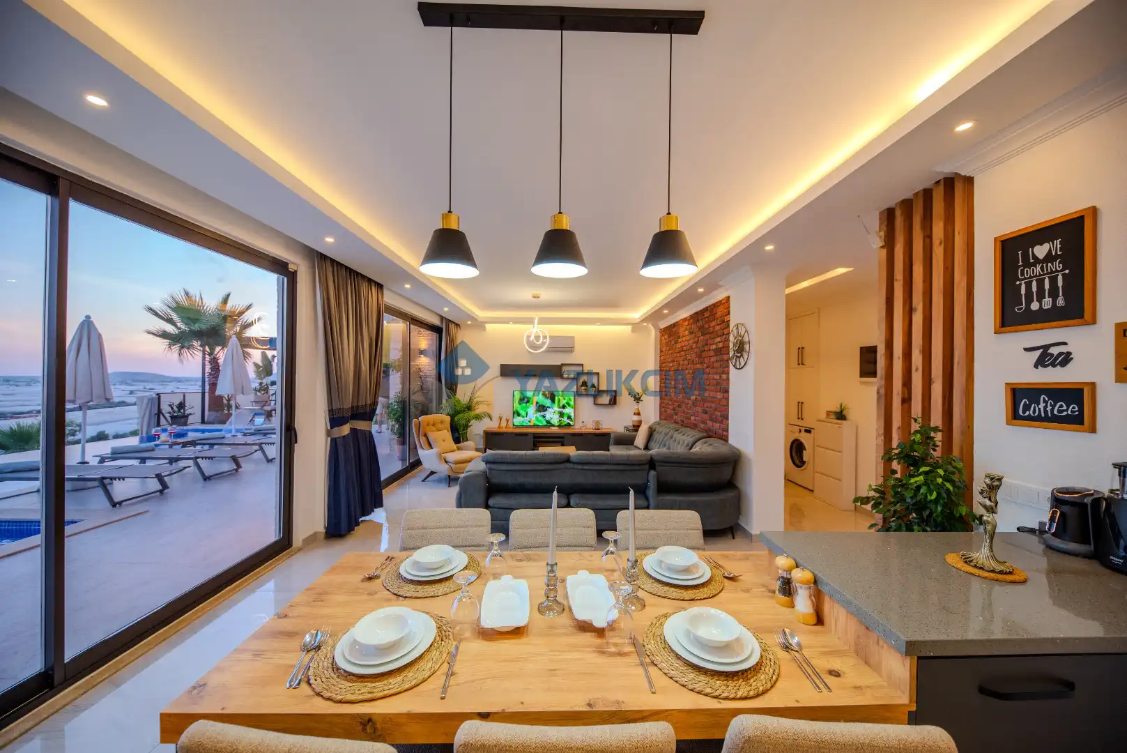 Salon Detayları: LCD TV, modern oturma grubu, yemek masası ve sandalyeler, kablosuz modem bulunmaktadır.