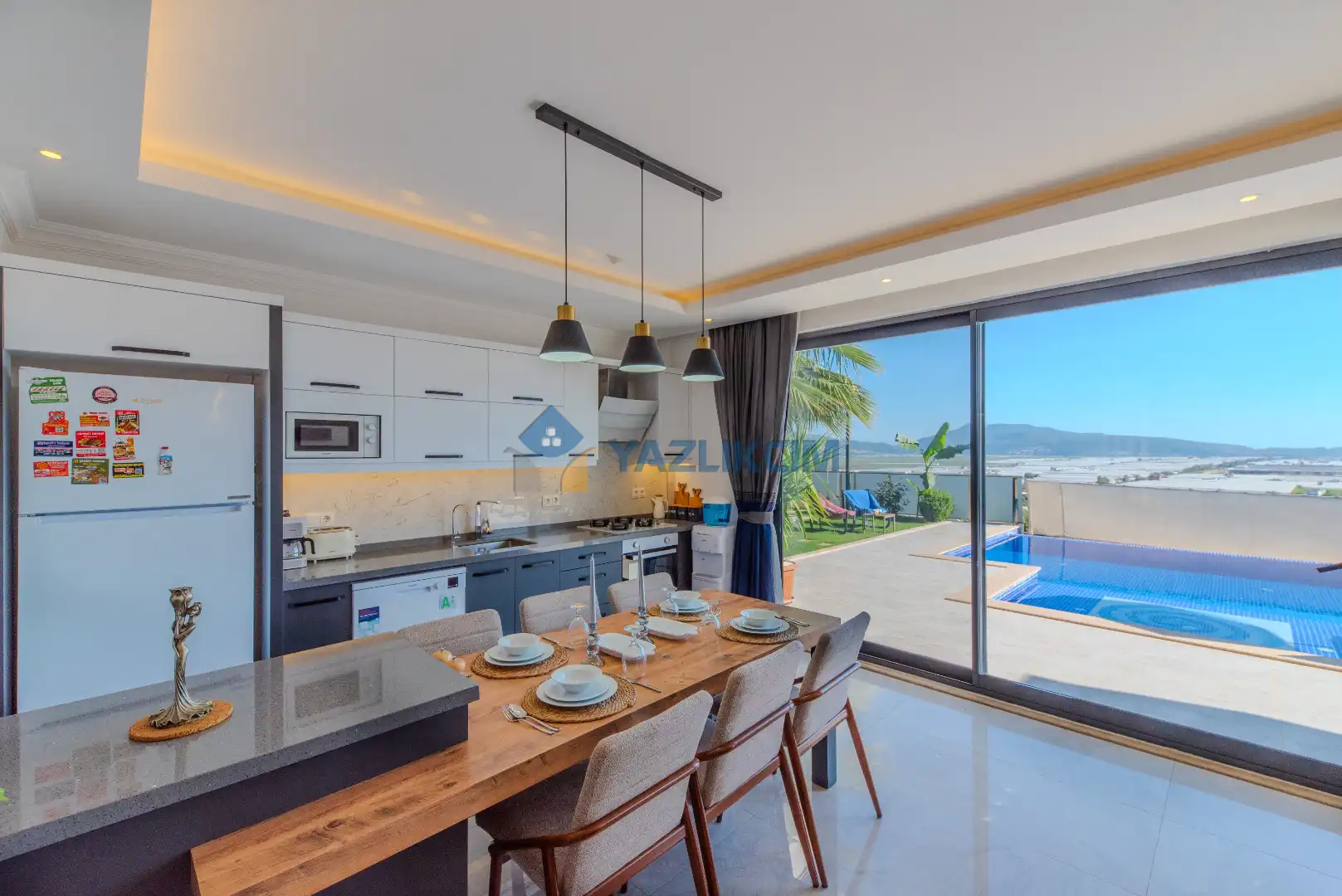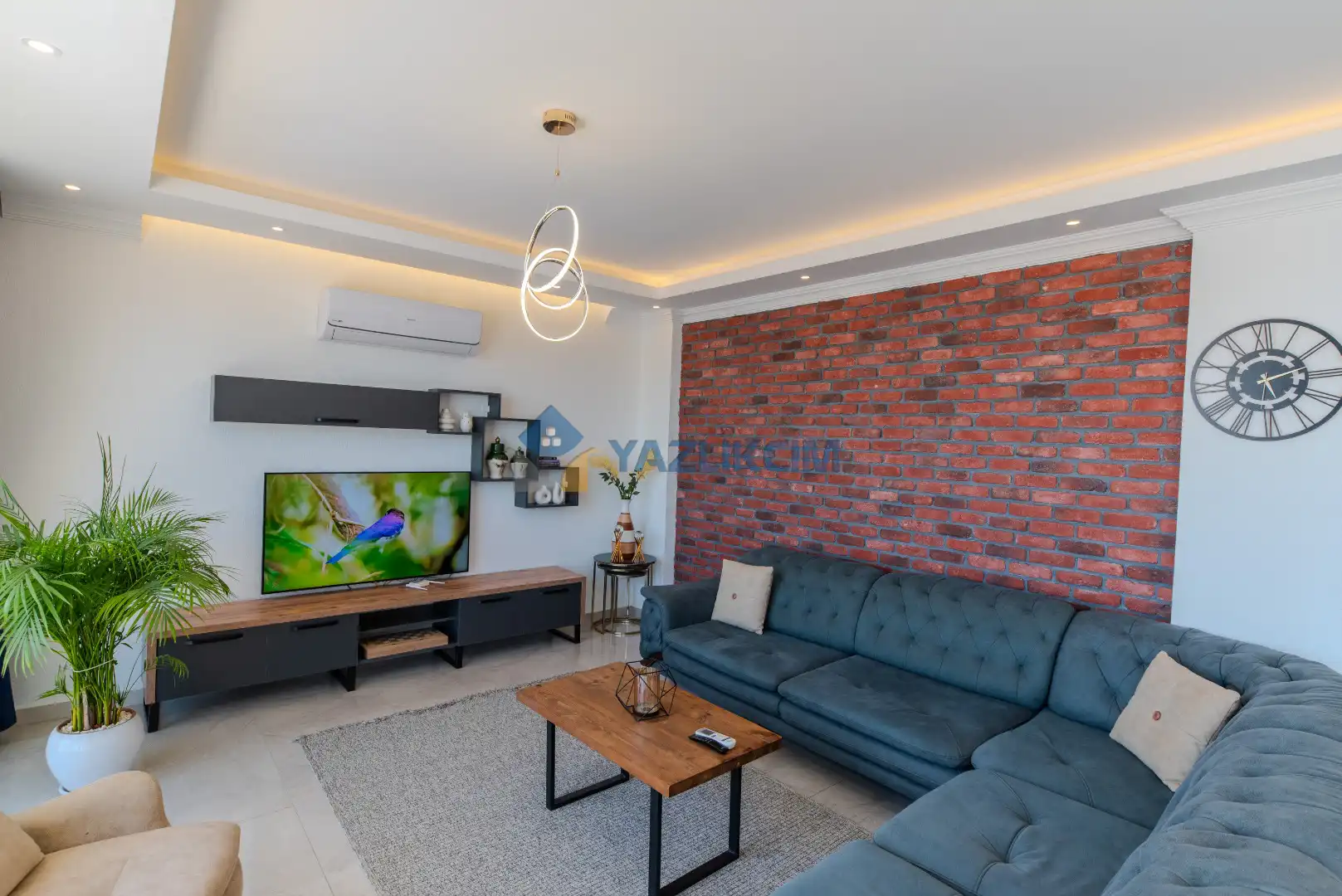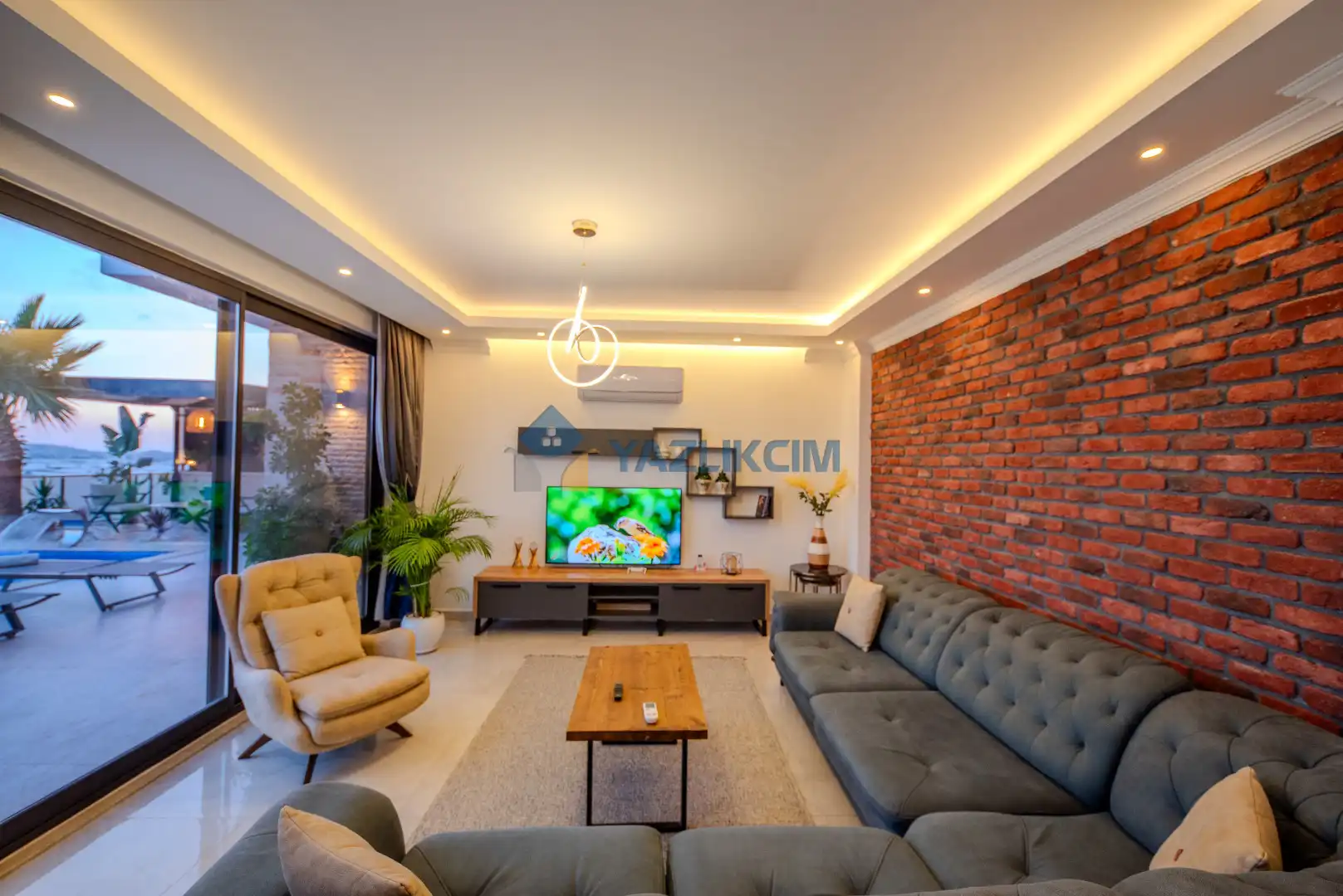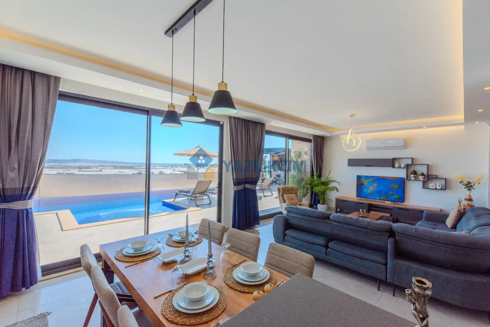 Salon Detayları: LCD TV, modern oturma grubu, yemek masası ve sandalyeler, kablosuz modem bulunmaktadır.