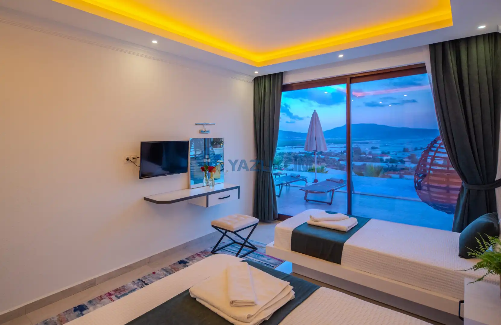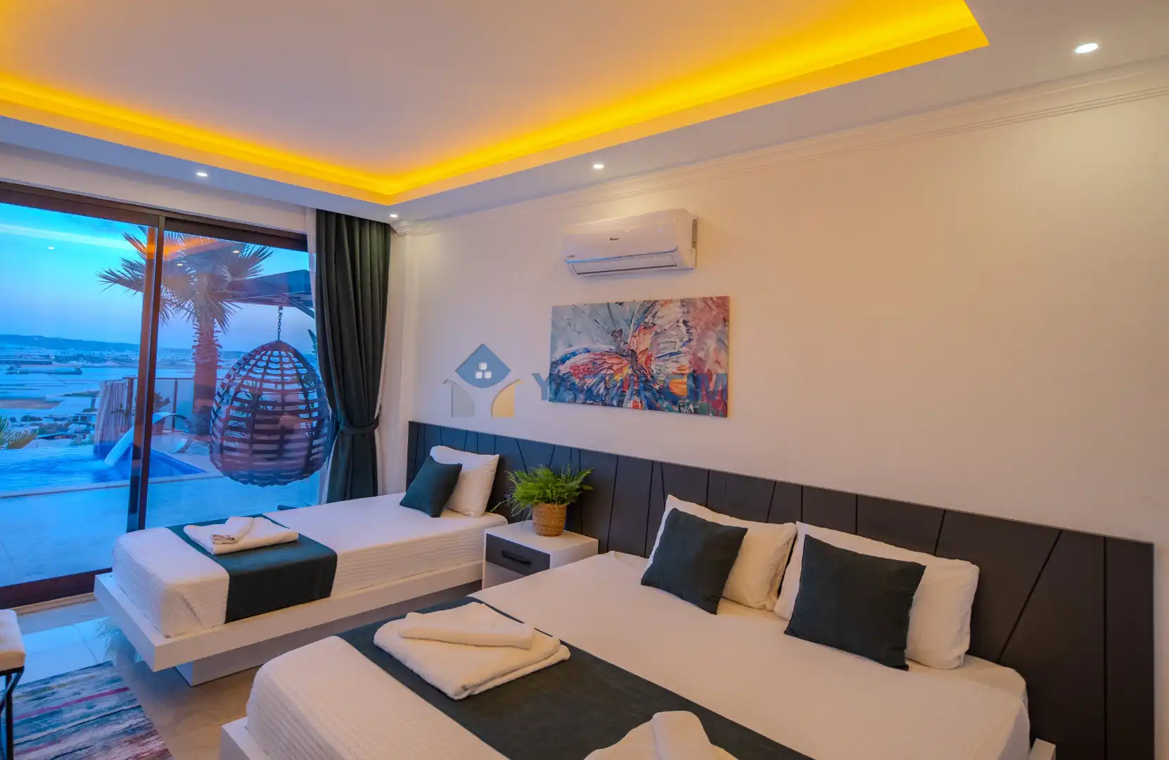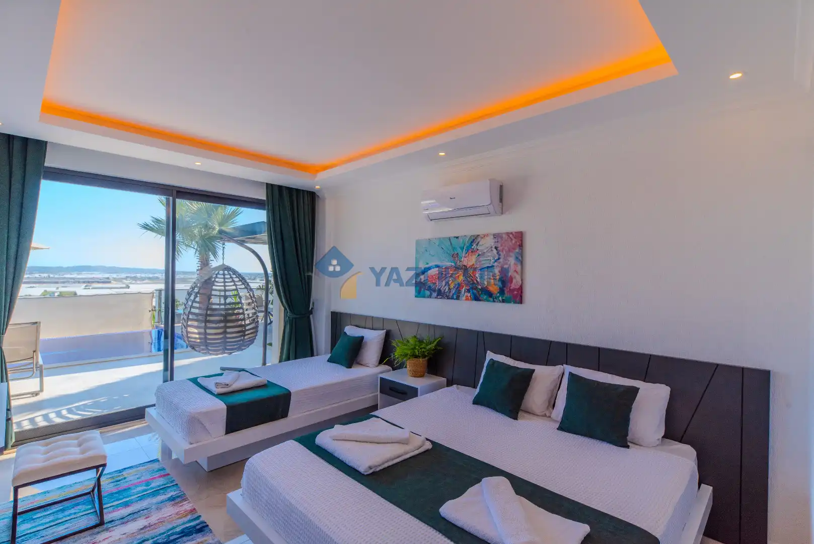 Detayları : Çift kişilik yatak, 1 adet tek kişilik yatak, klima, komidin, elbise dolabı ,makyaj masası, banyo ve lavabo bulunmaktadır.