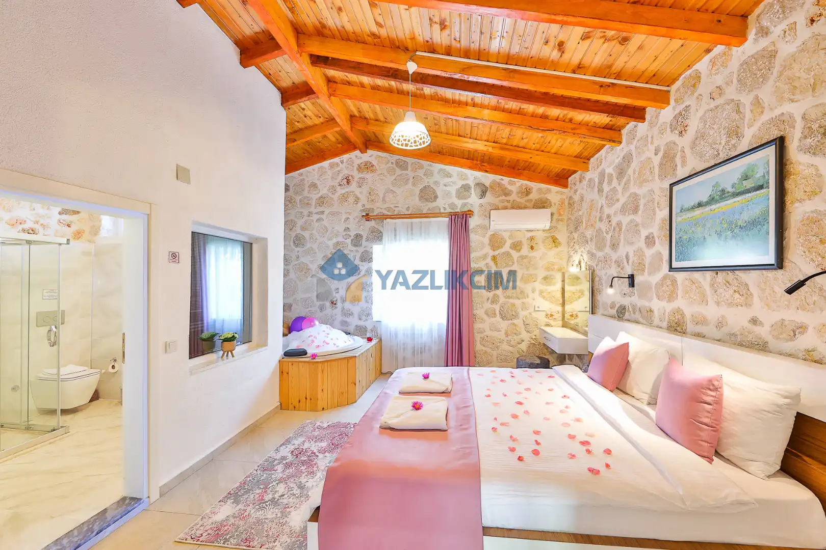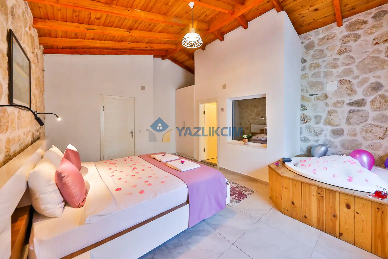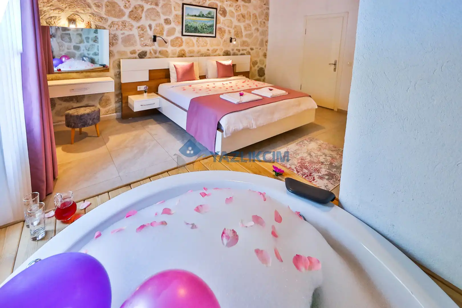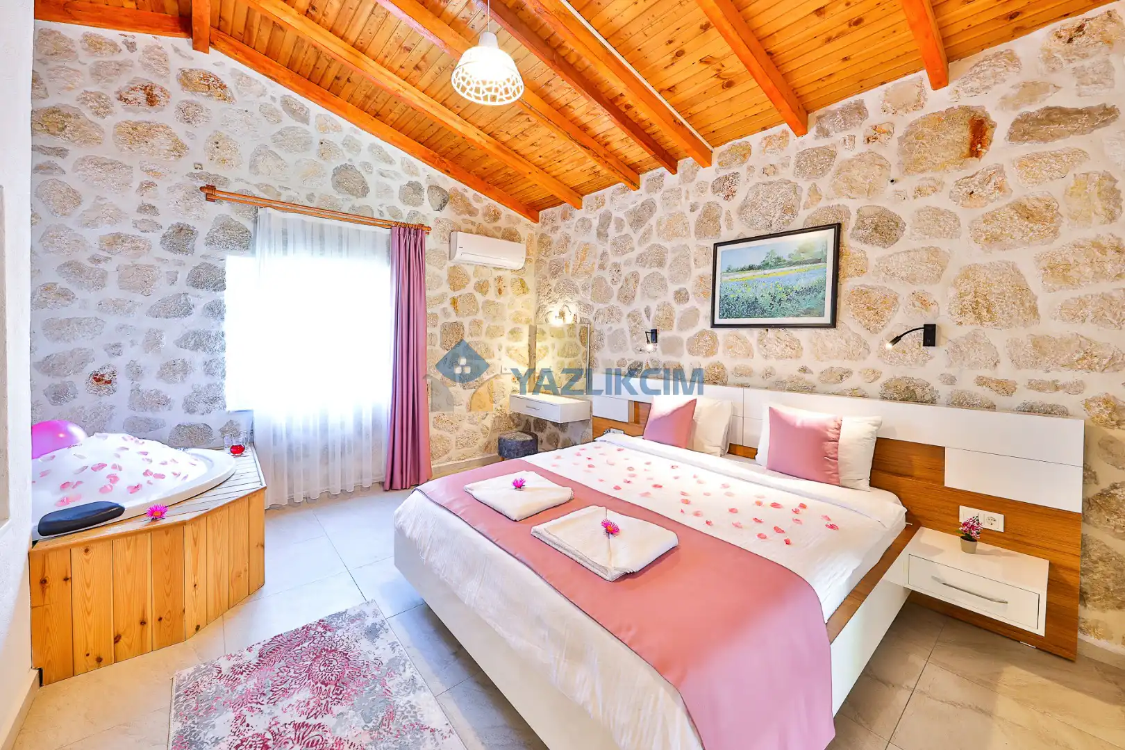 Detayları : Çift kişilik yatak, jakuzi, klima, komidin, elbise dolabı, makyaj masası, banyo ve lavabo bulunmaktadır.