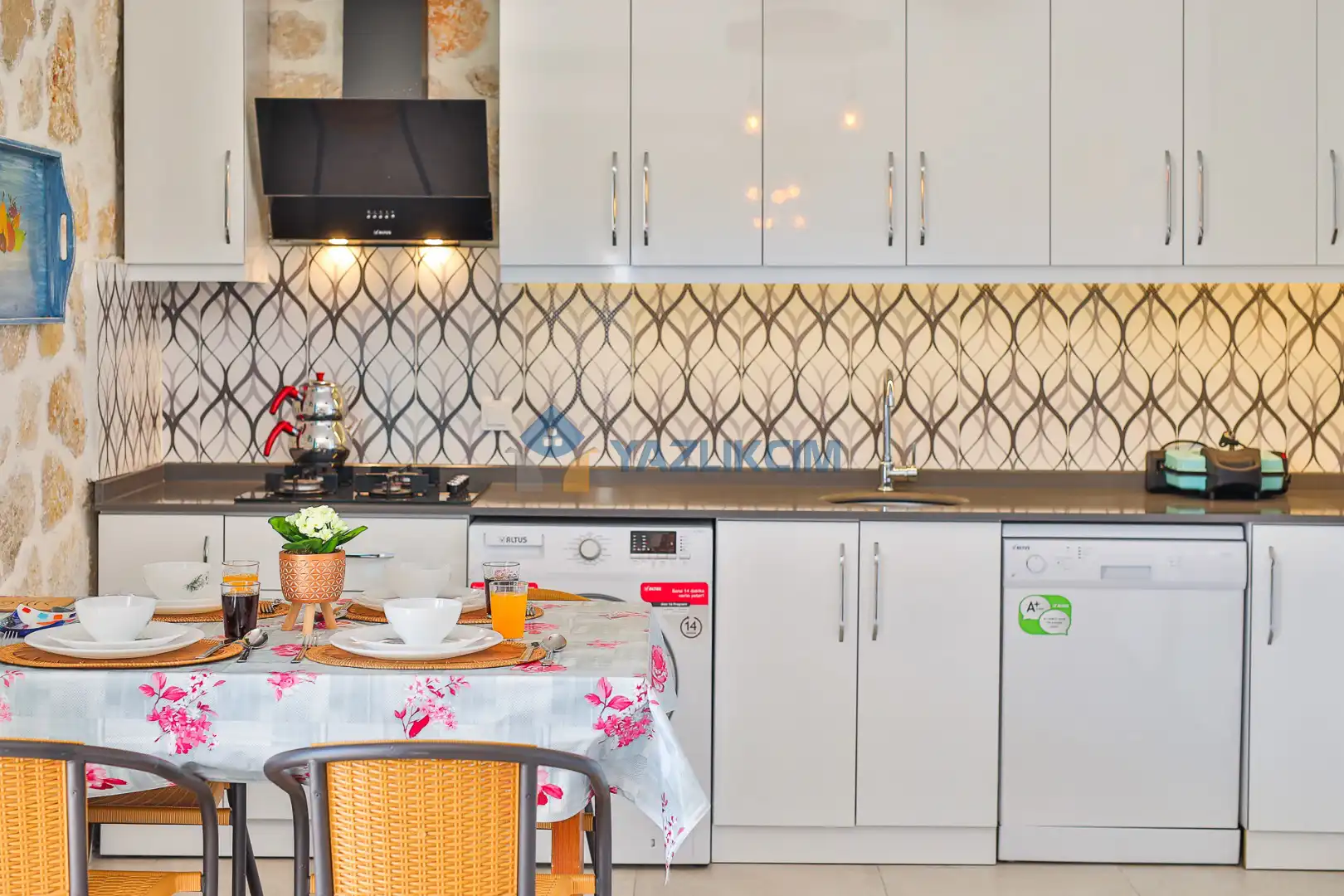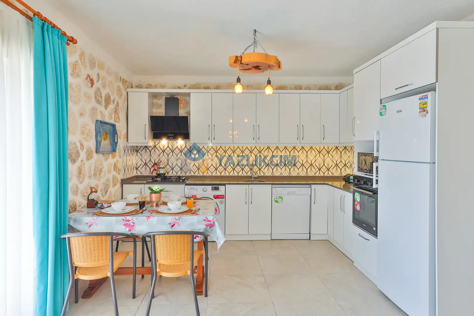 Mutfak Detayları:  Buzdolabı, bulaşık makinesi, fırın, çamaşır makinesi, yemek takımı, tava-tencere, çatal-bıçak seti bulunmaktadır.
