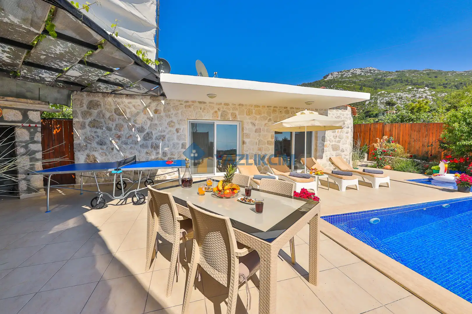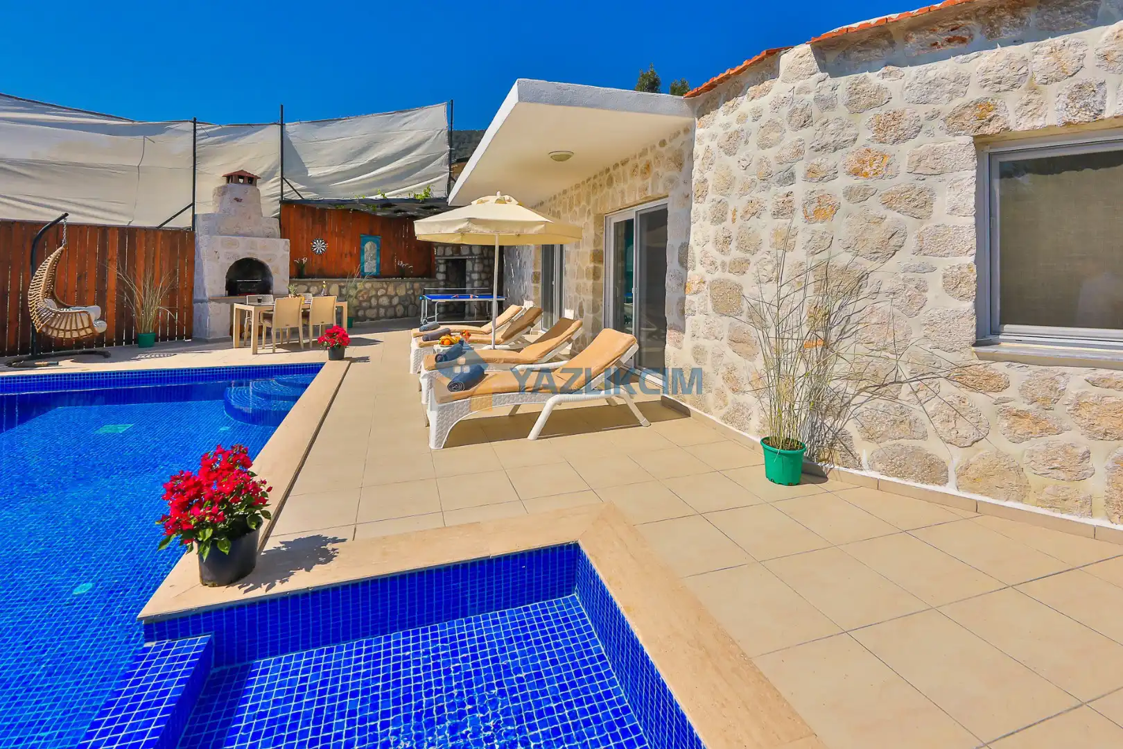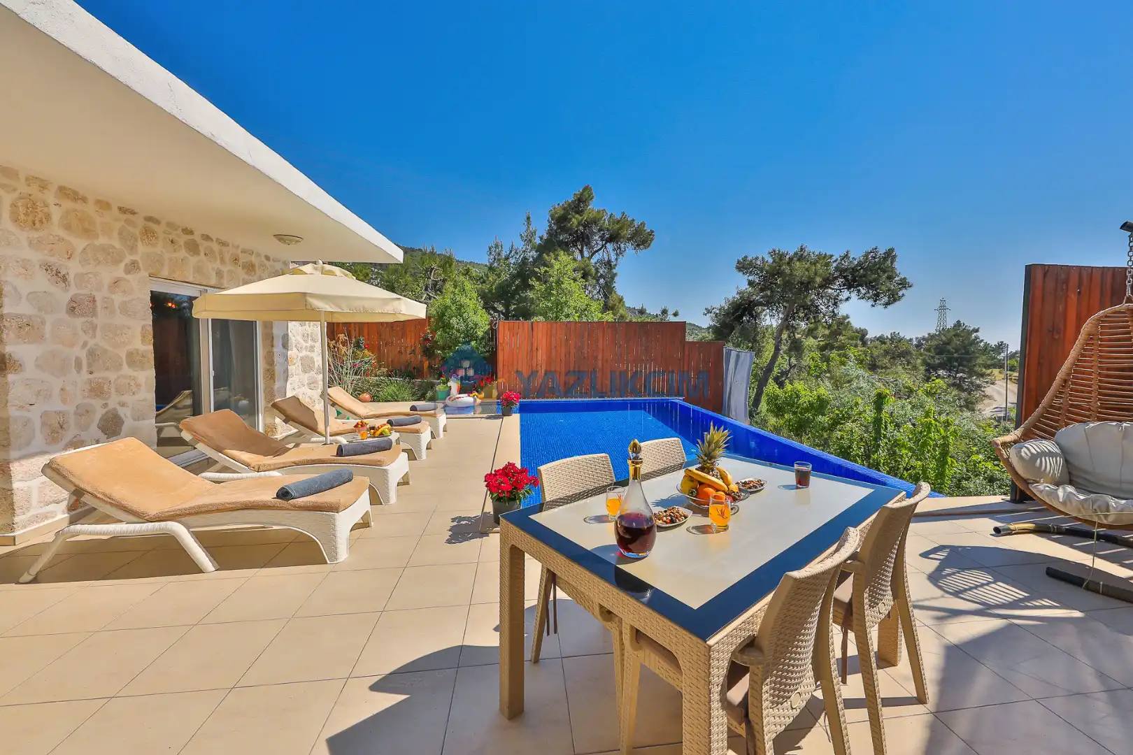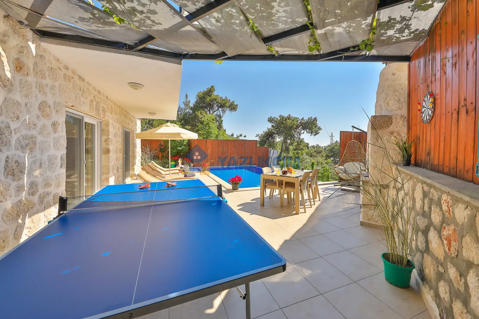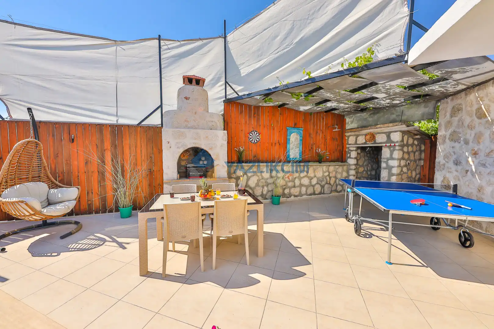 Detayları : Şezlong, güneşlenme şemsiyesi, salıncak, barbekü, masa tenisi, yemek masası ve sandalyeleri bulunmaktadır.