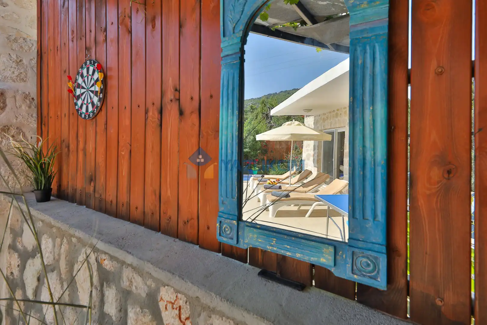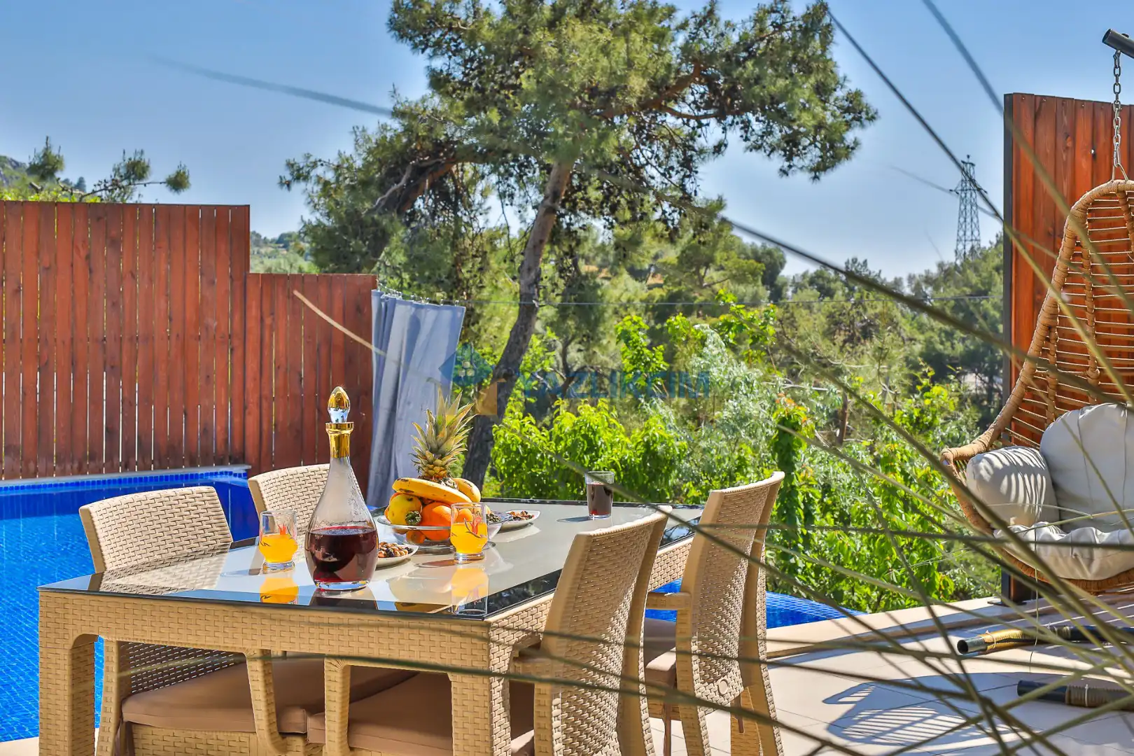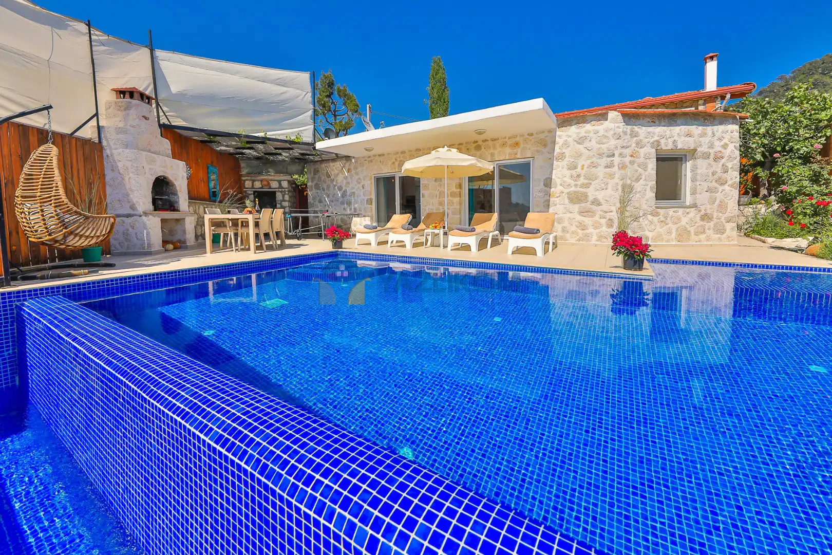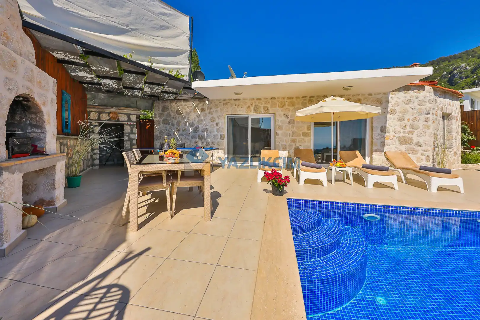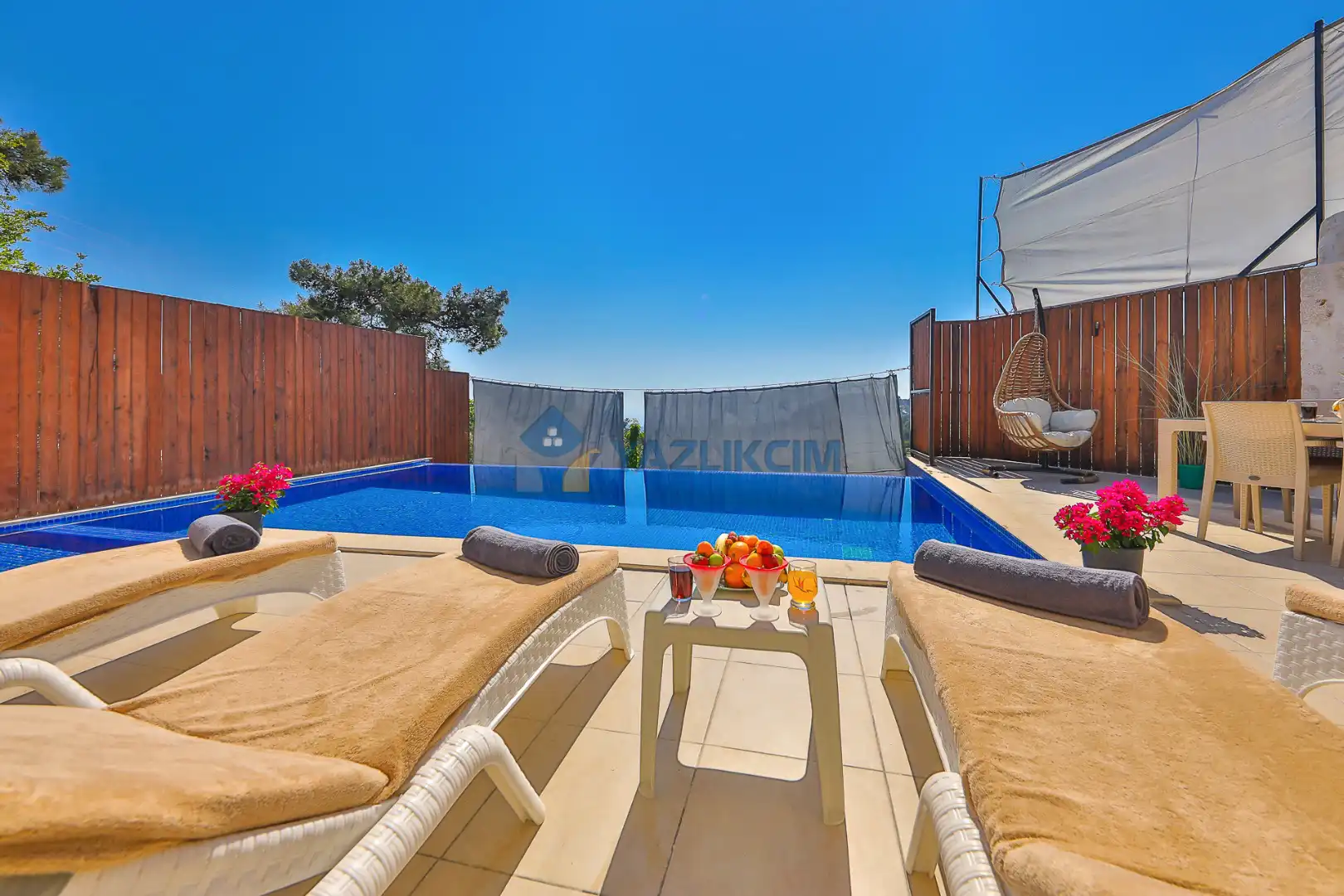 Detayları : Şezlong, güneşlenme şemsiyesi, salıncak, barbekü, masa tenisi, yemek masası ve sandalyeleri bulunmaktadır.