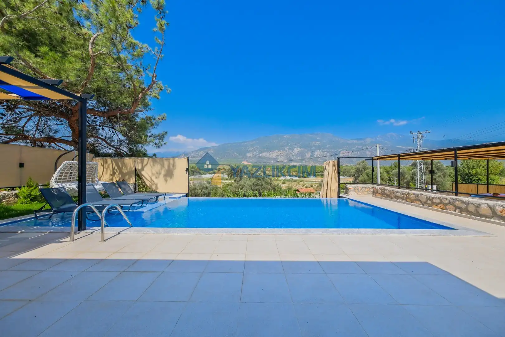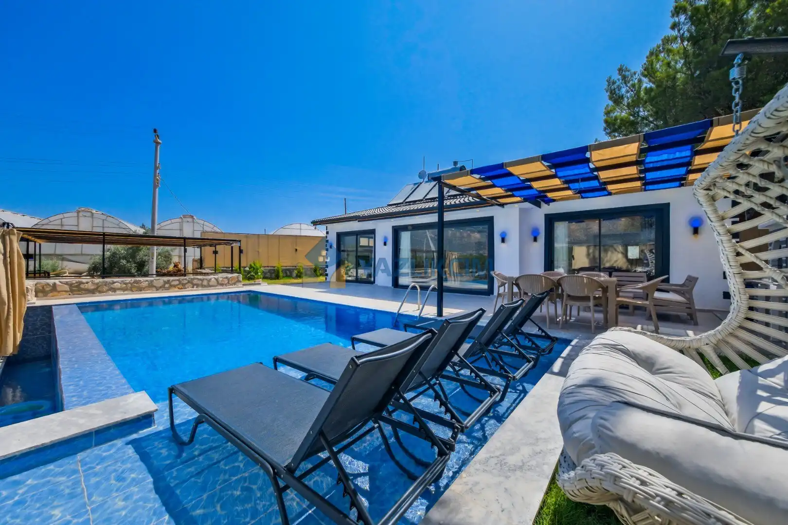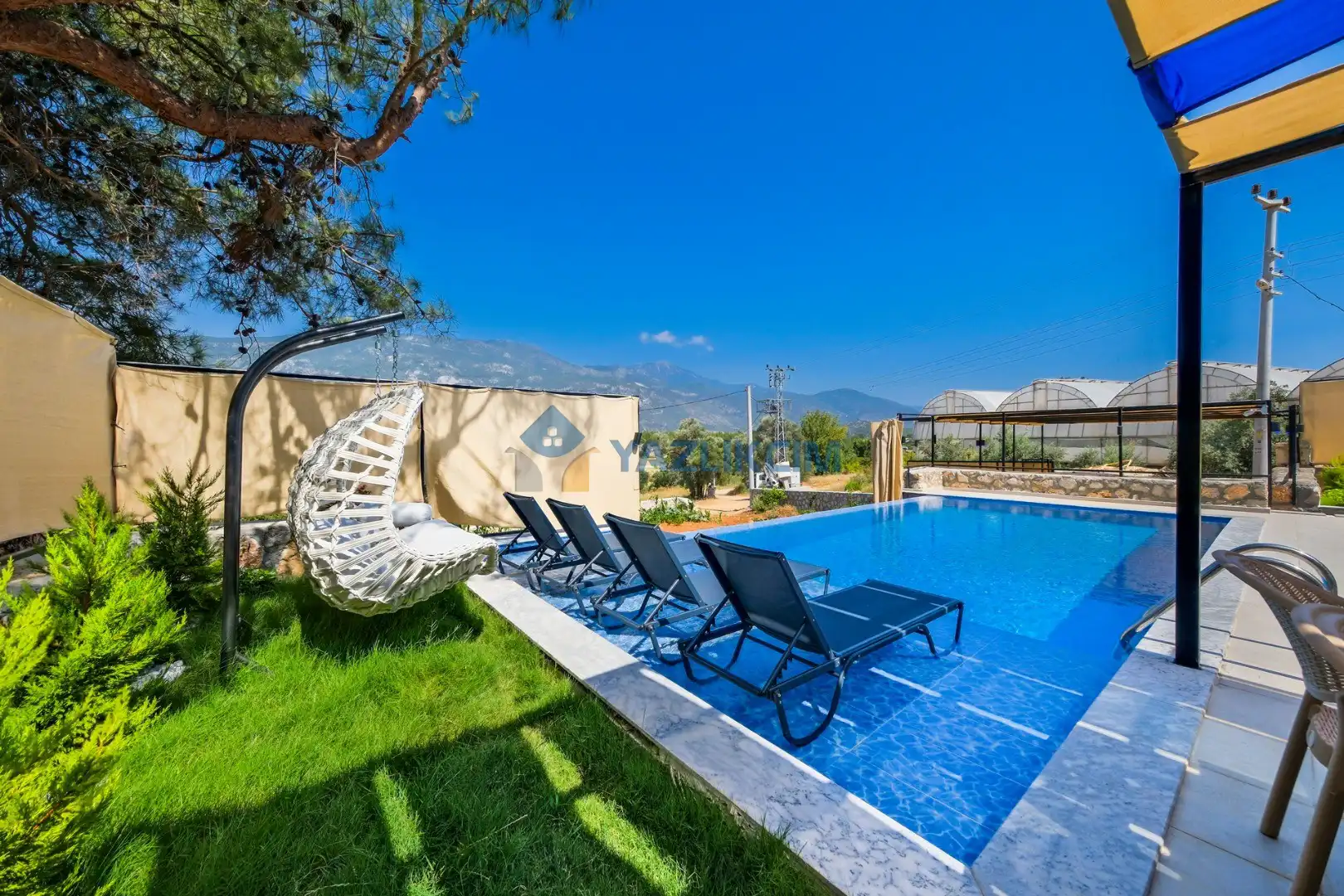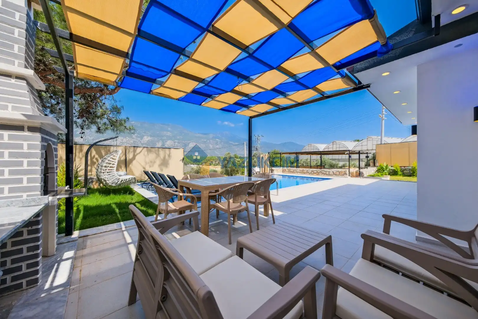 Detayları: Şezlonglar, salıncak ve yemek masası ve pergole bulunmaktadır.