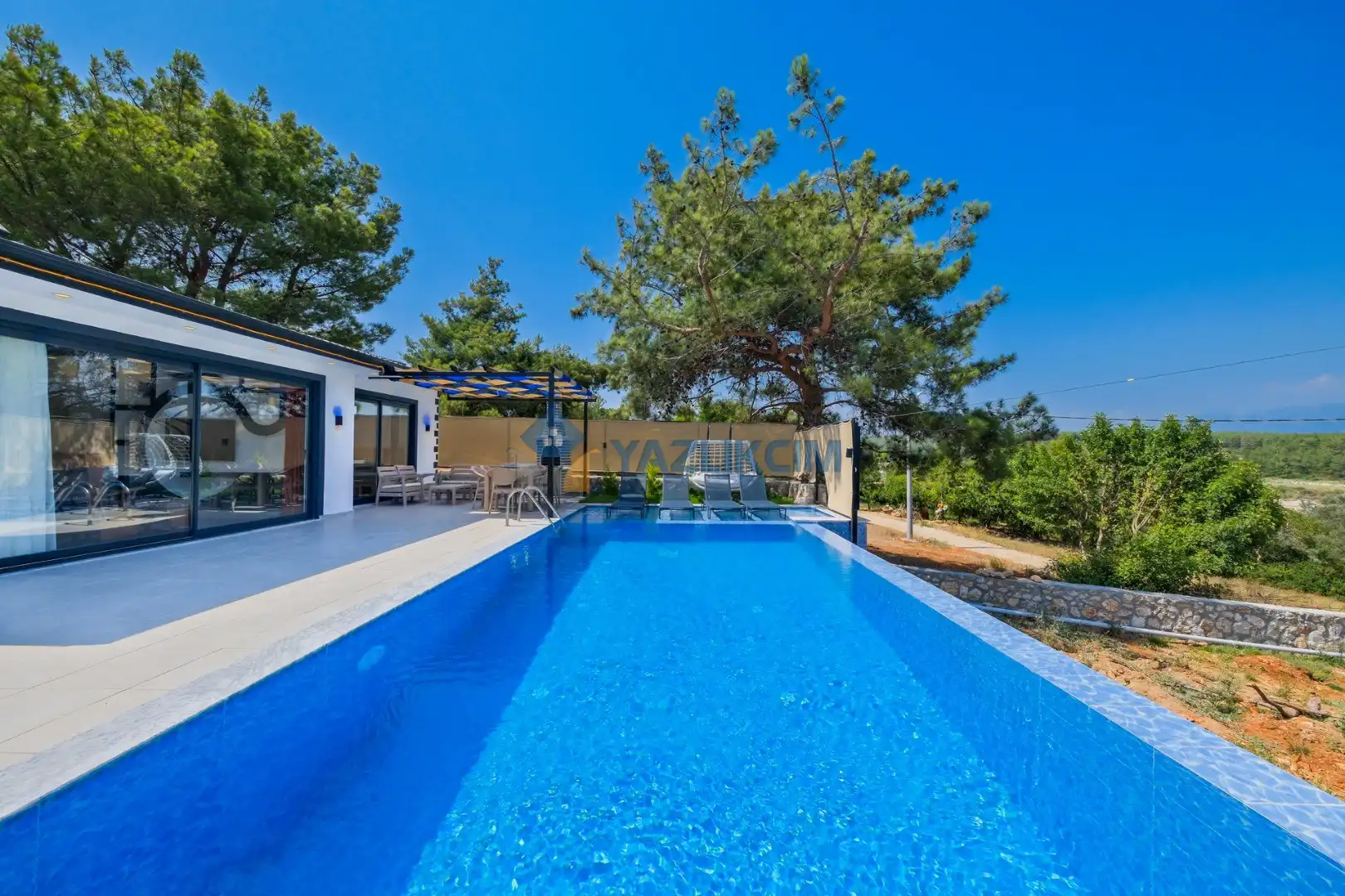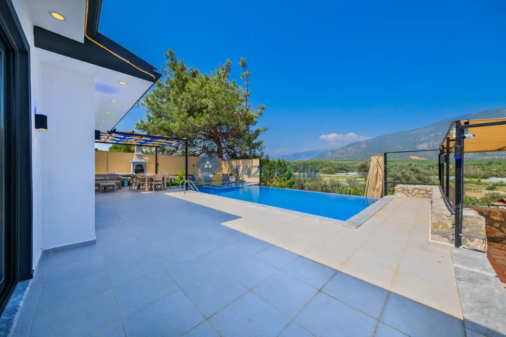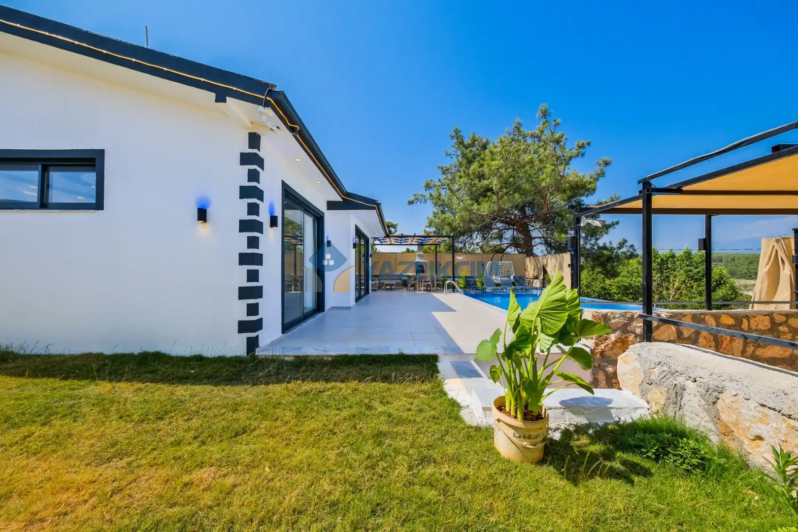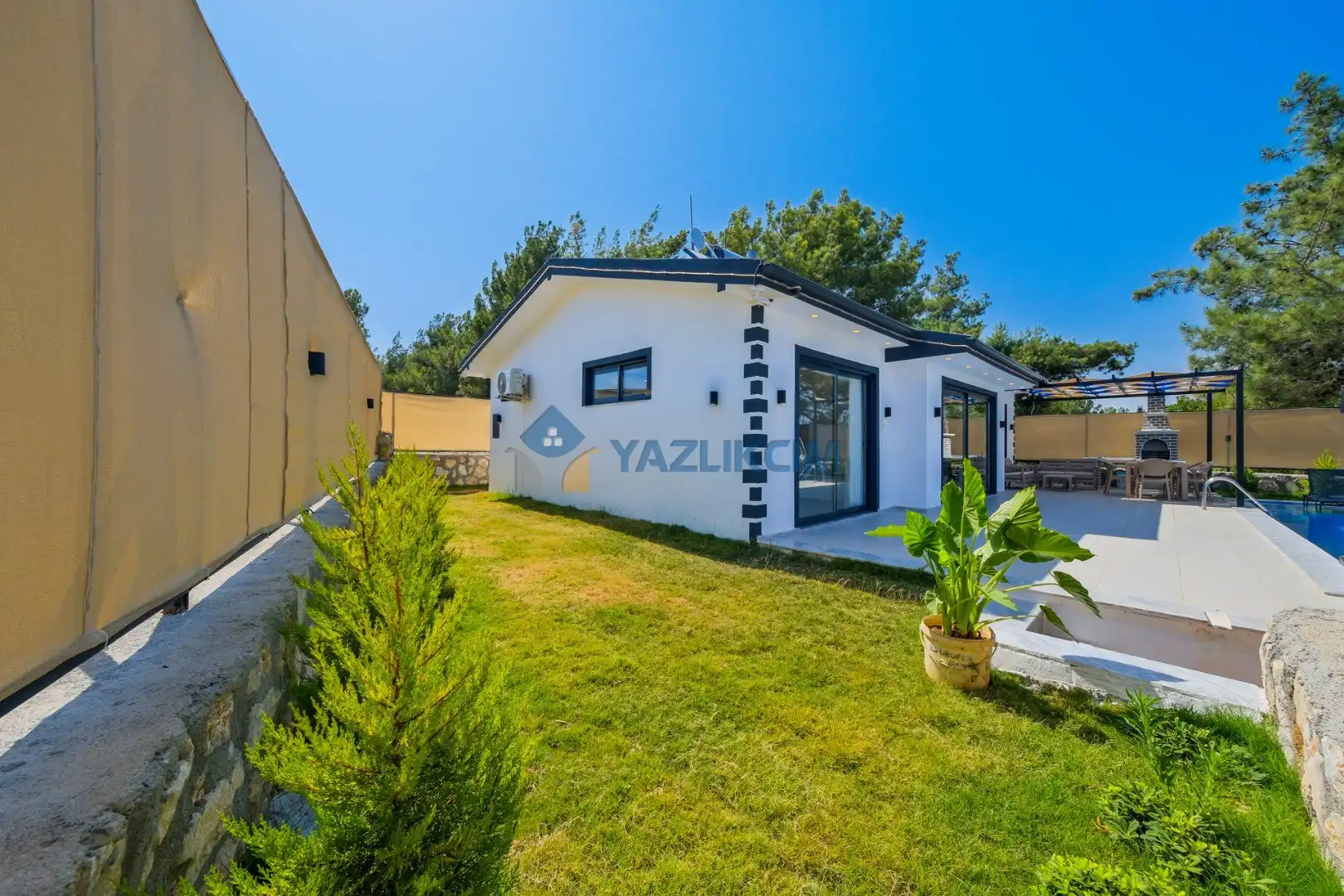 Detayları: Şezlonglar, salıncak ve yemek masası ve pergole bulunmaktadır.
