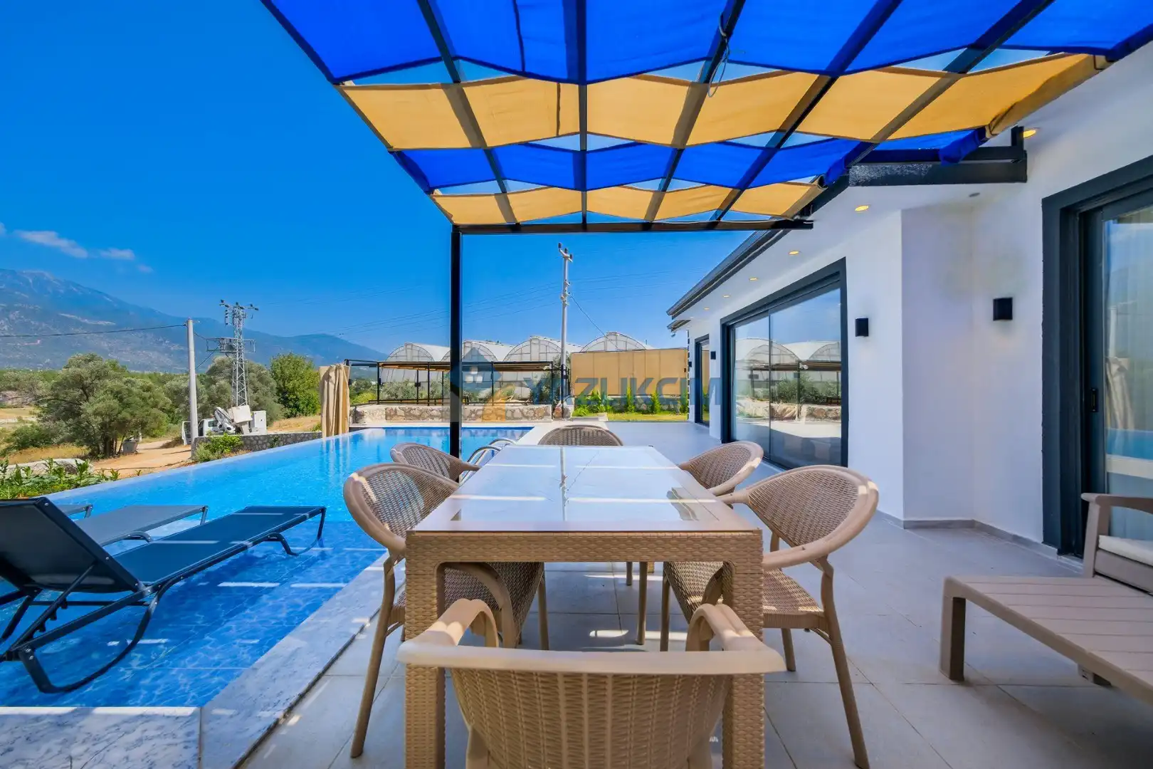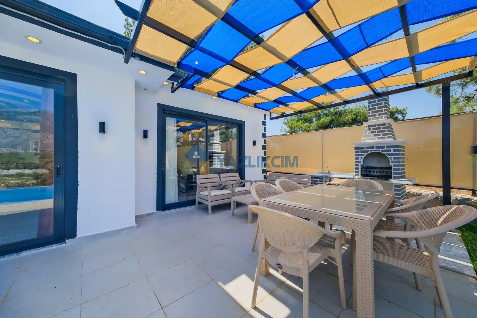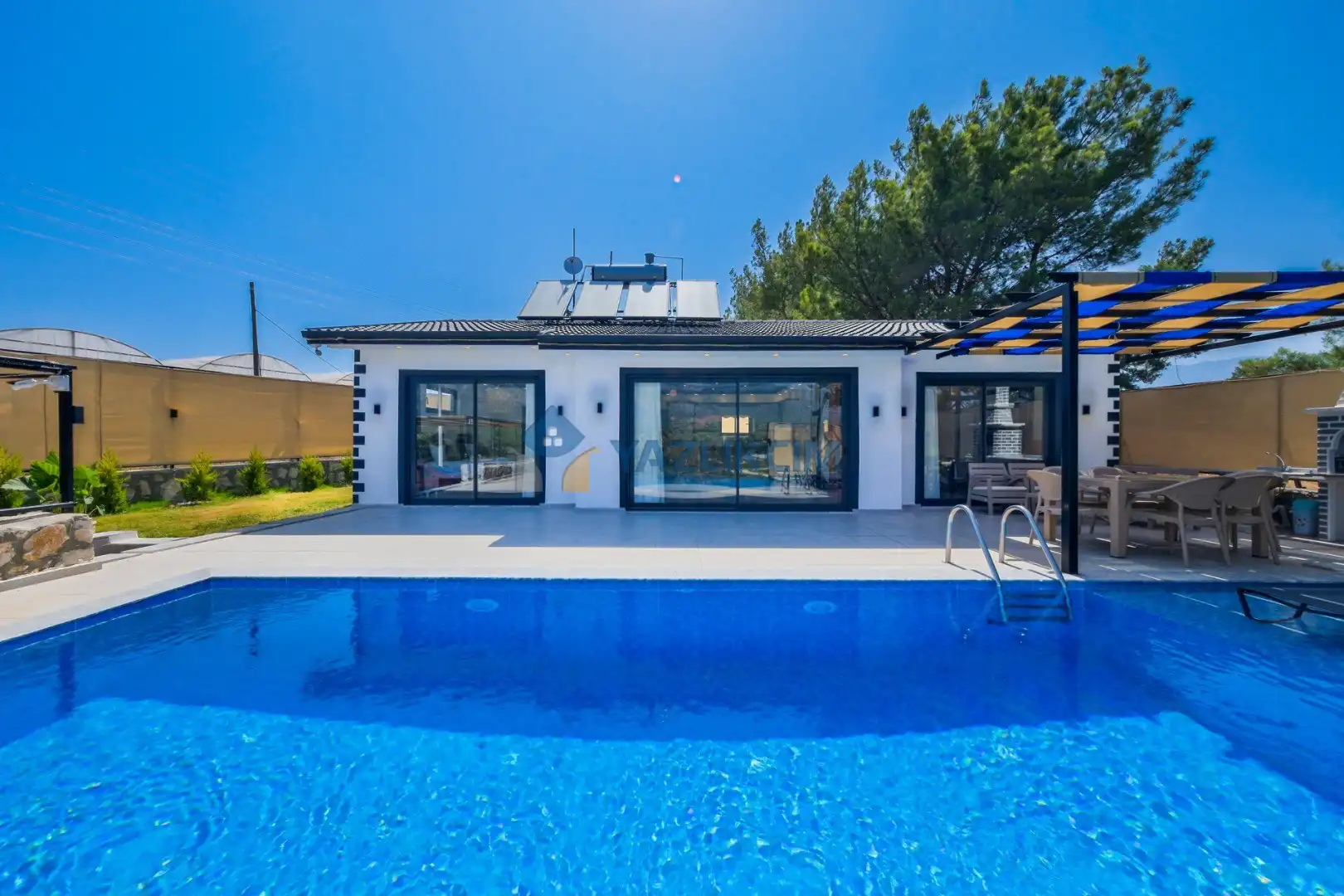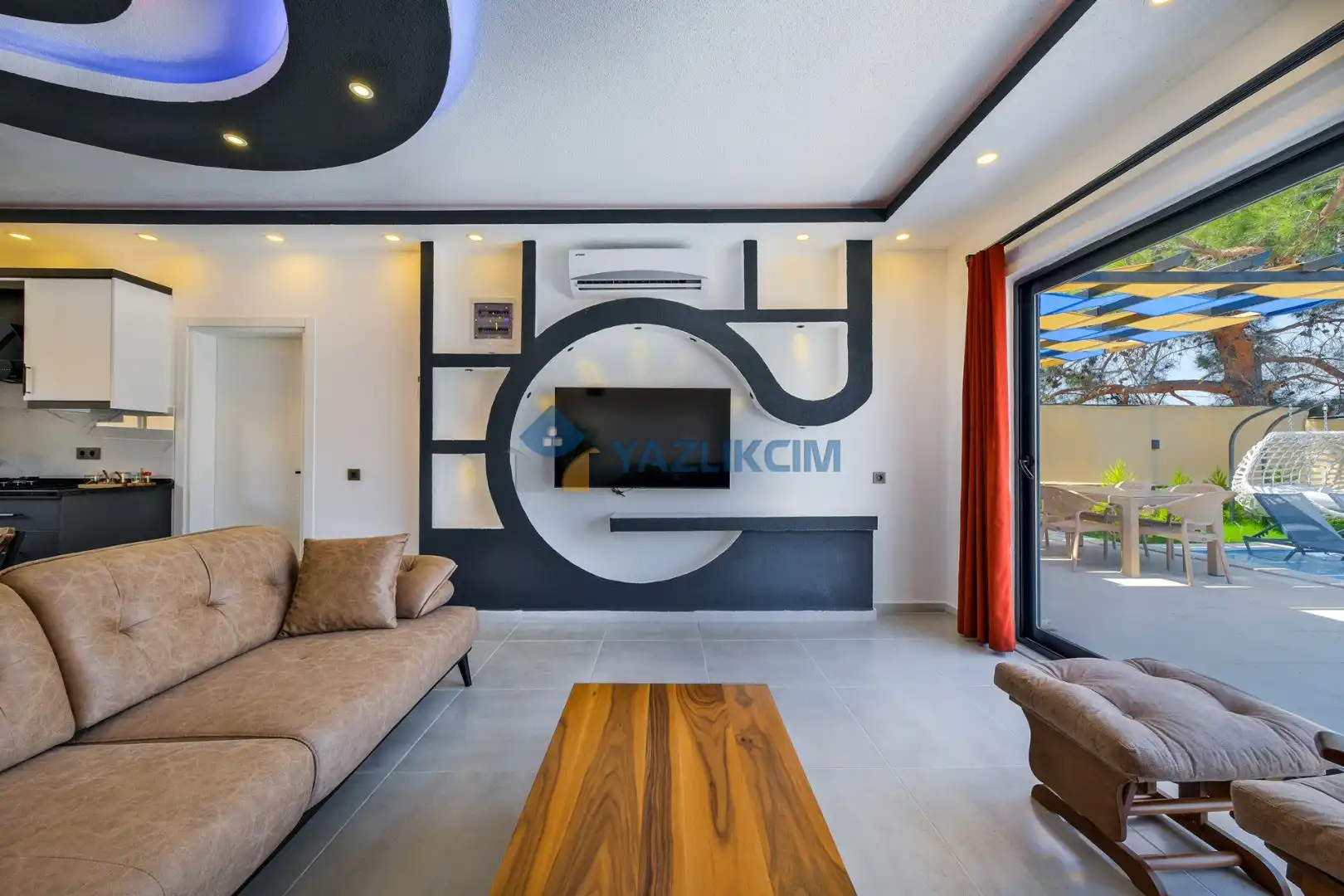 Detayları: Şezlonglar, salıncak ve yemek masası ve pergole bulunmaktadır.