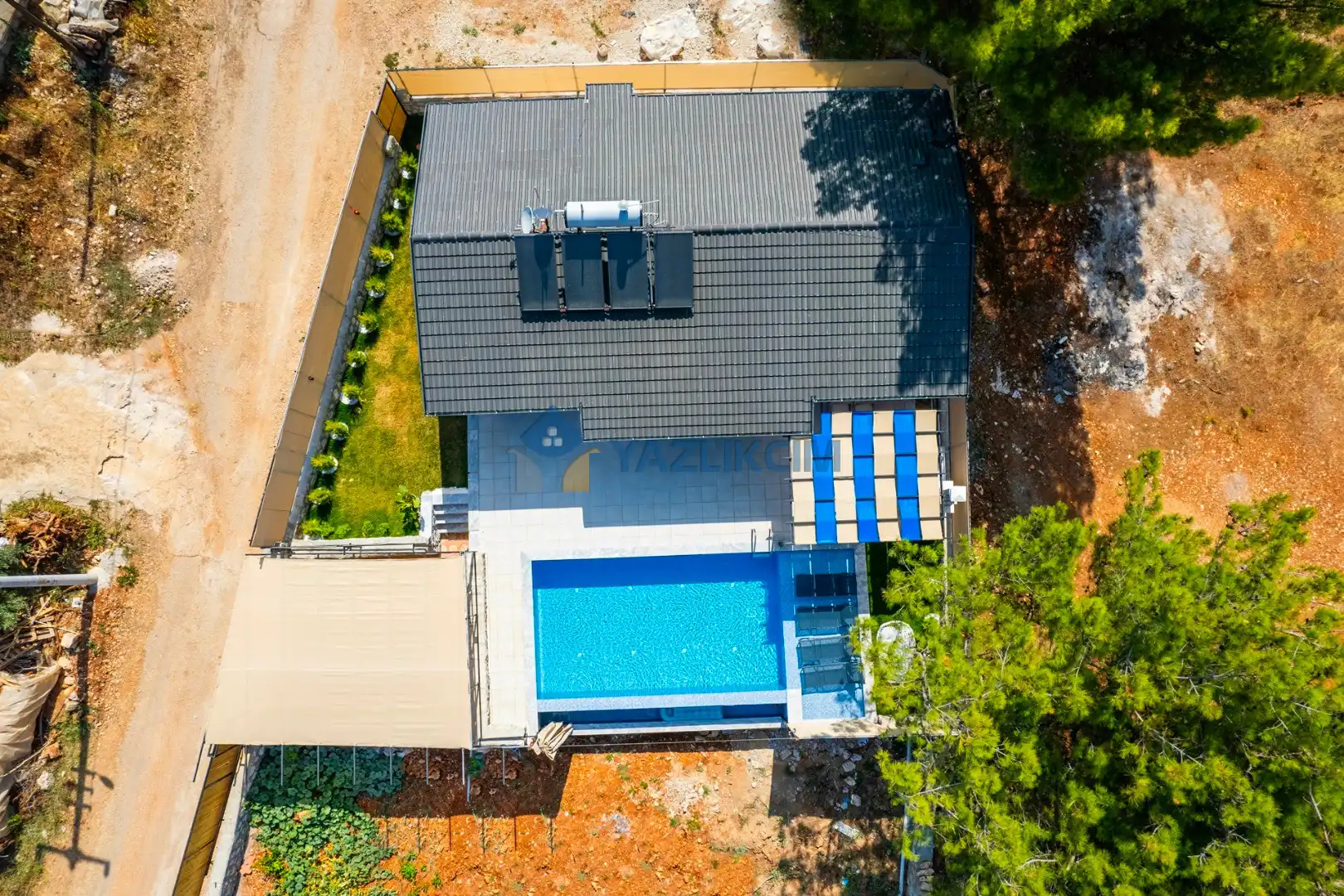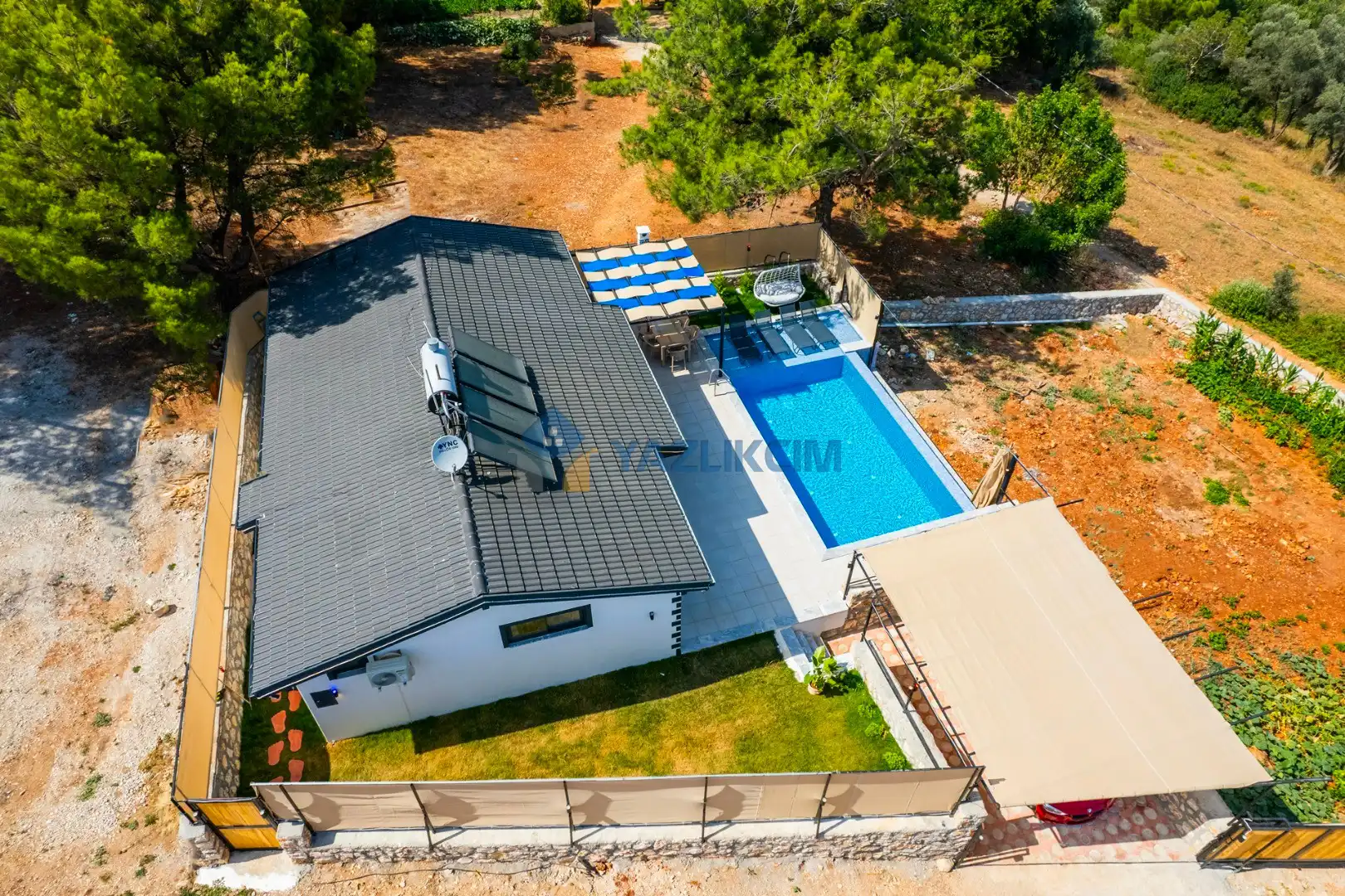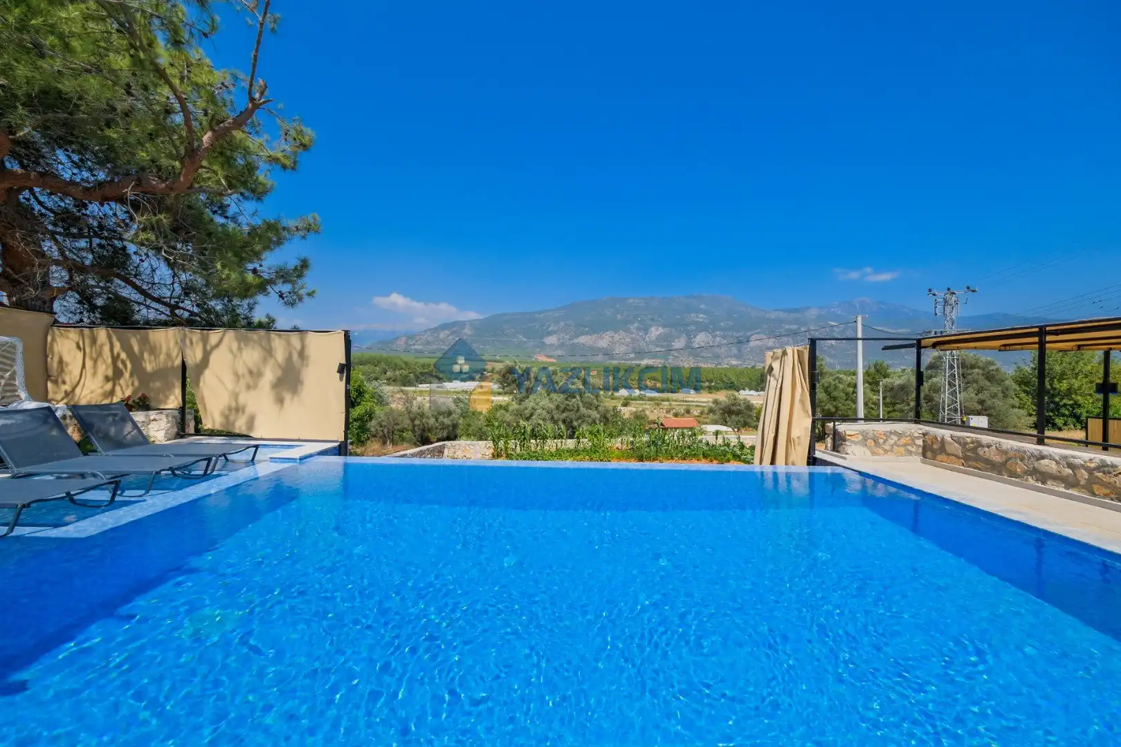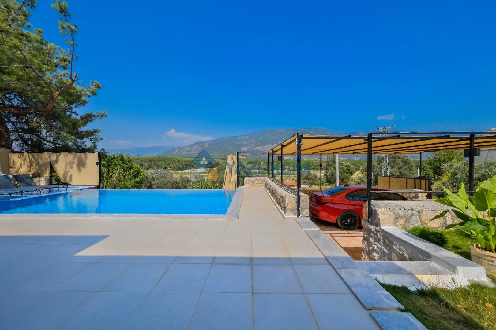 Detayları: Şezlonglar, salıncak ve yemek masası ve pergole bulunmaktadır.