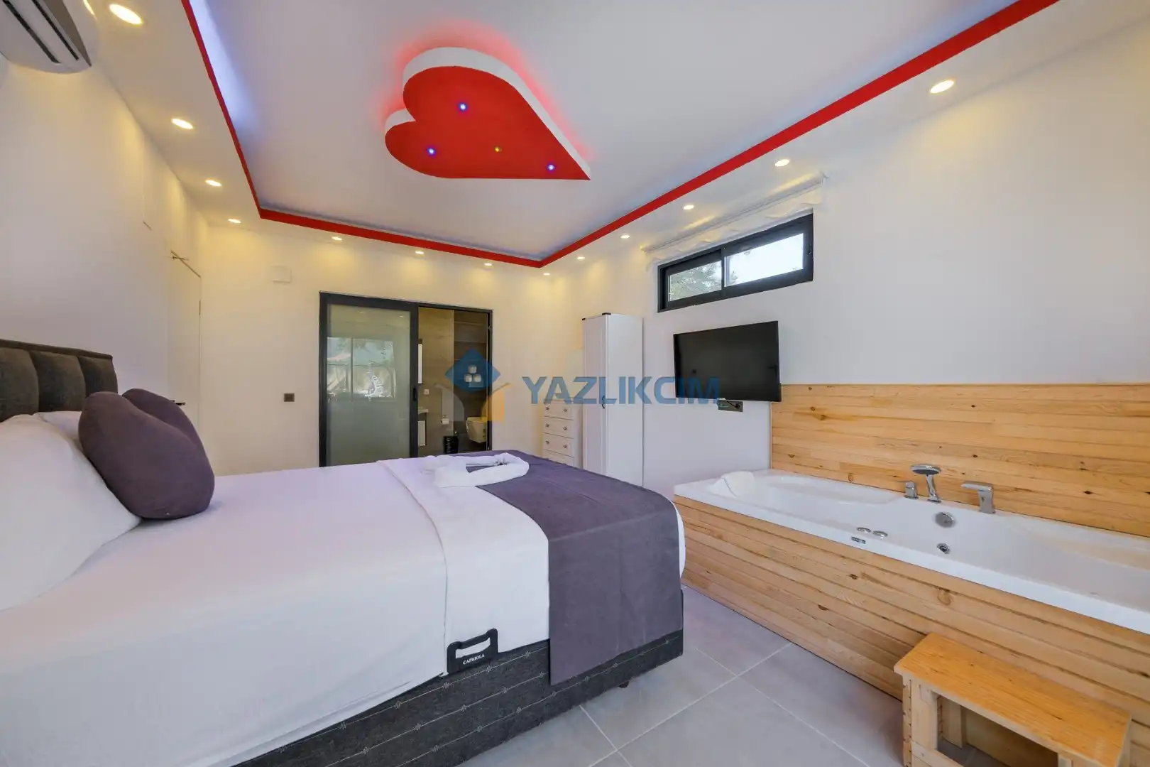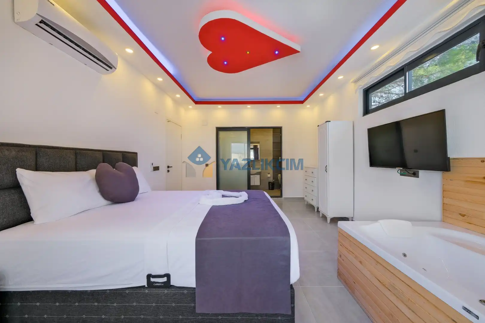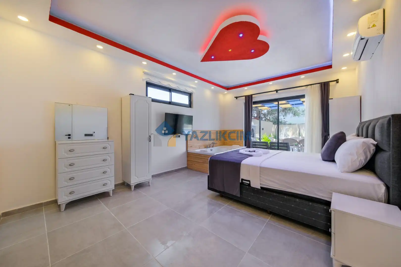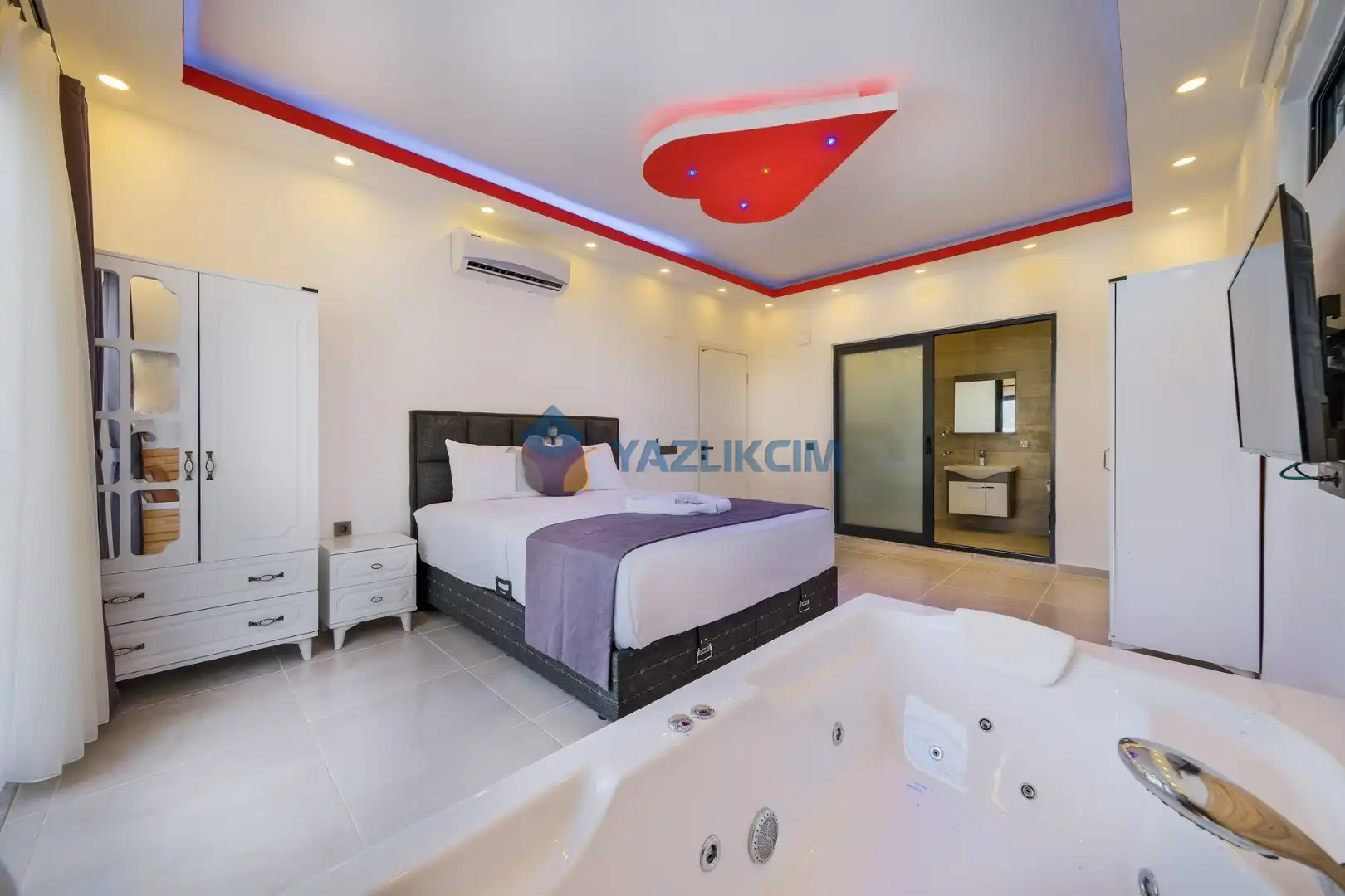 Detayları: Çift kişilik yatak, klima, jakuzi , elbise dolabı, makyaj masası, komodin, lavabo ve banyo bulunmaktadır.