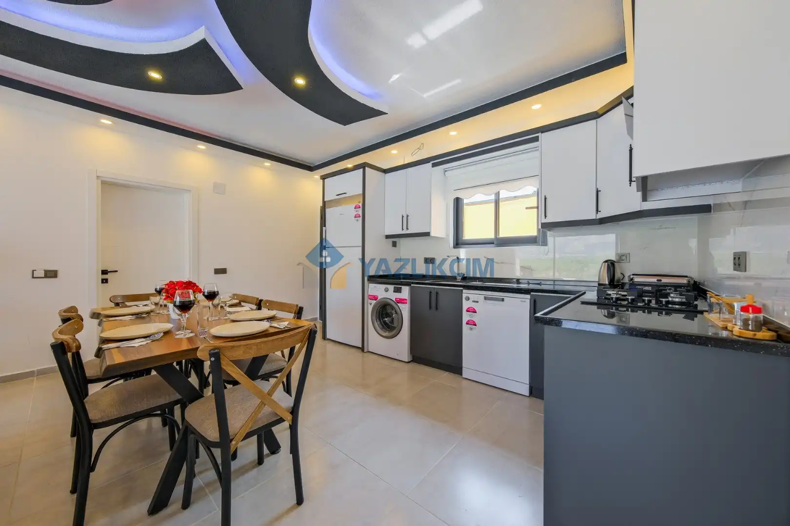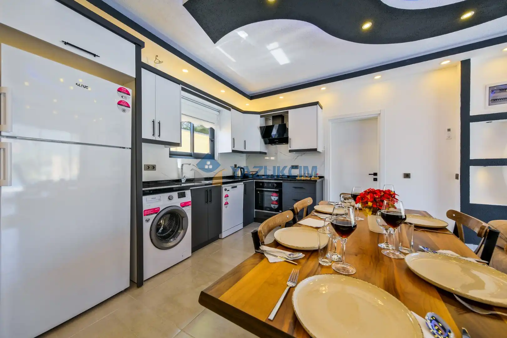 Mutfak Detayları: Buzdolabı, bulaşık makinesi, fırın, çamaşır makinesi, yemek takımı, tava-tencere, çatal-bıçak seti bulunmaktadır.