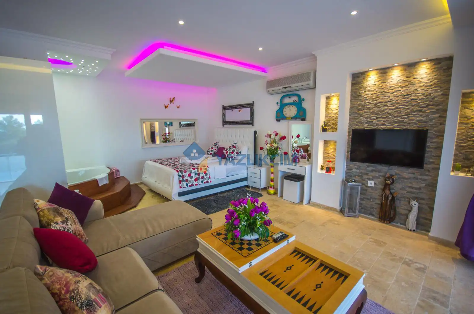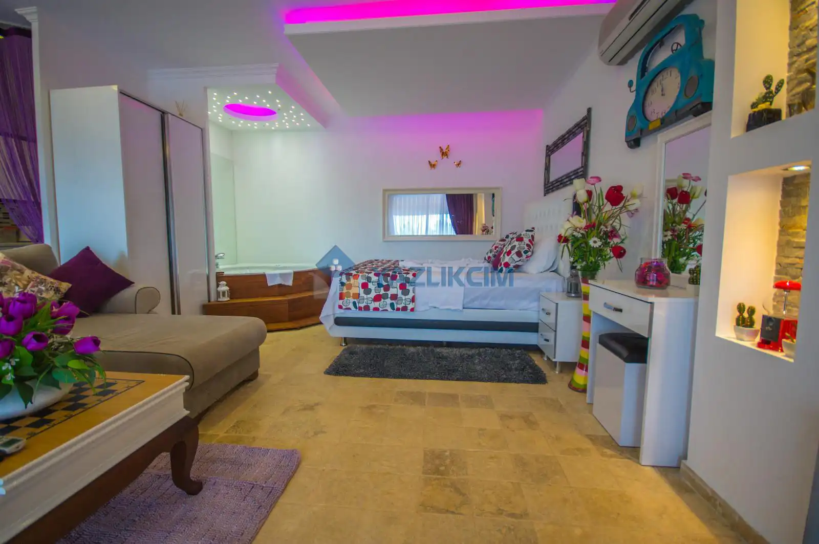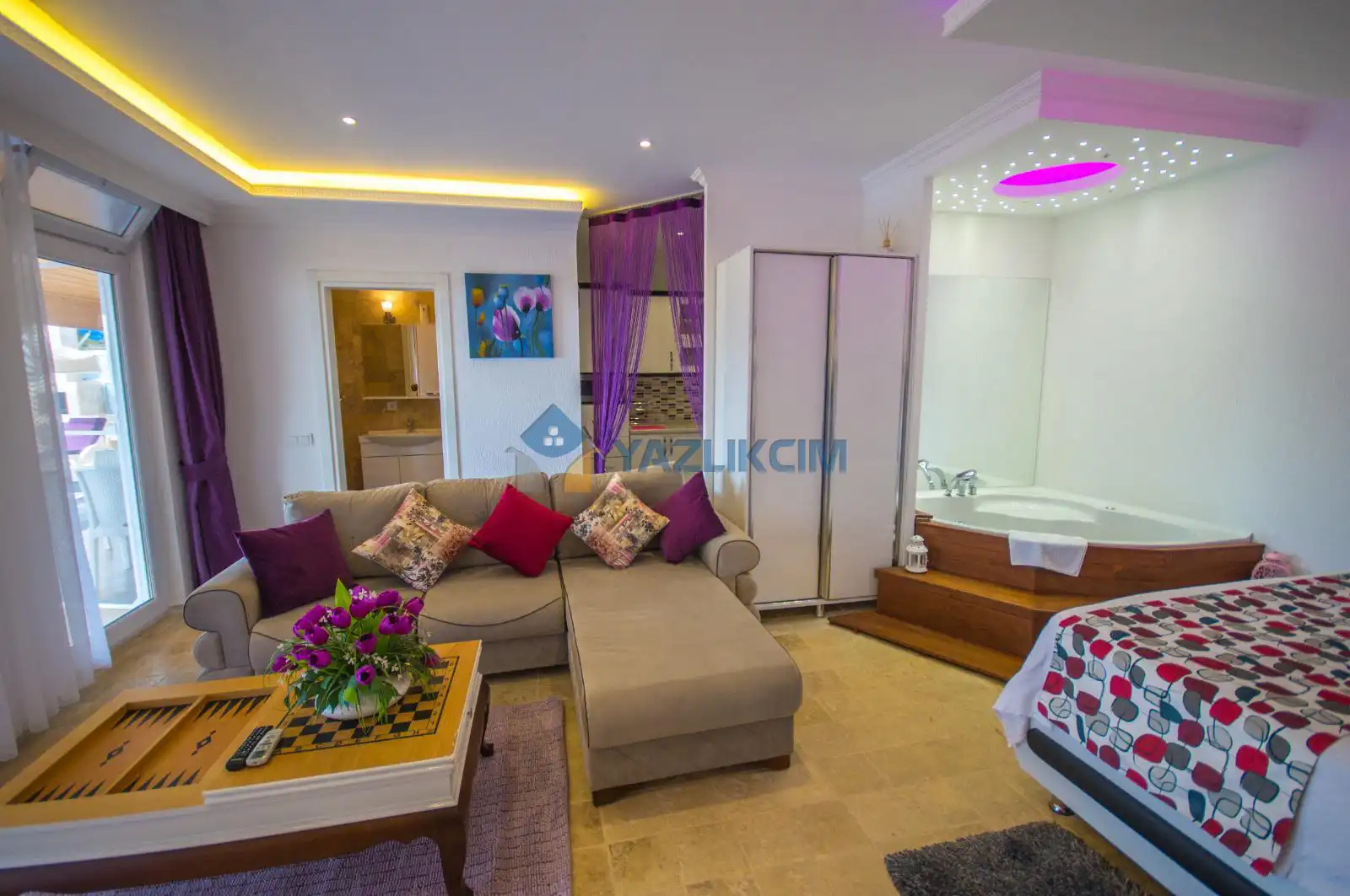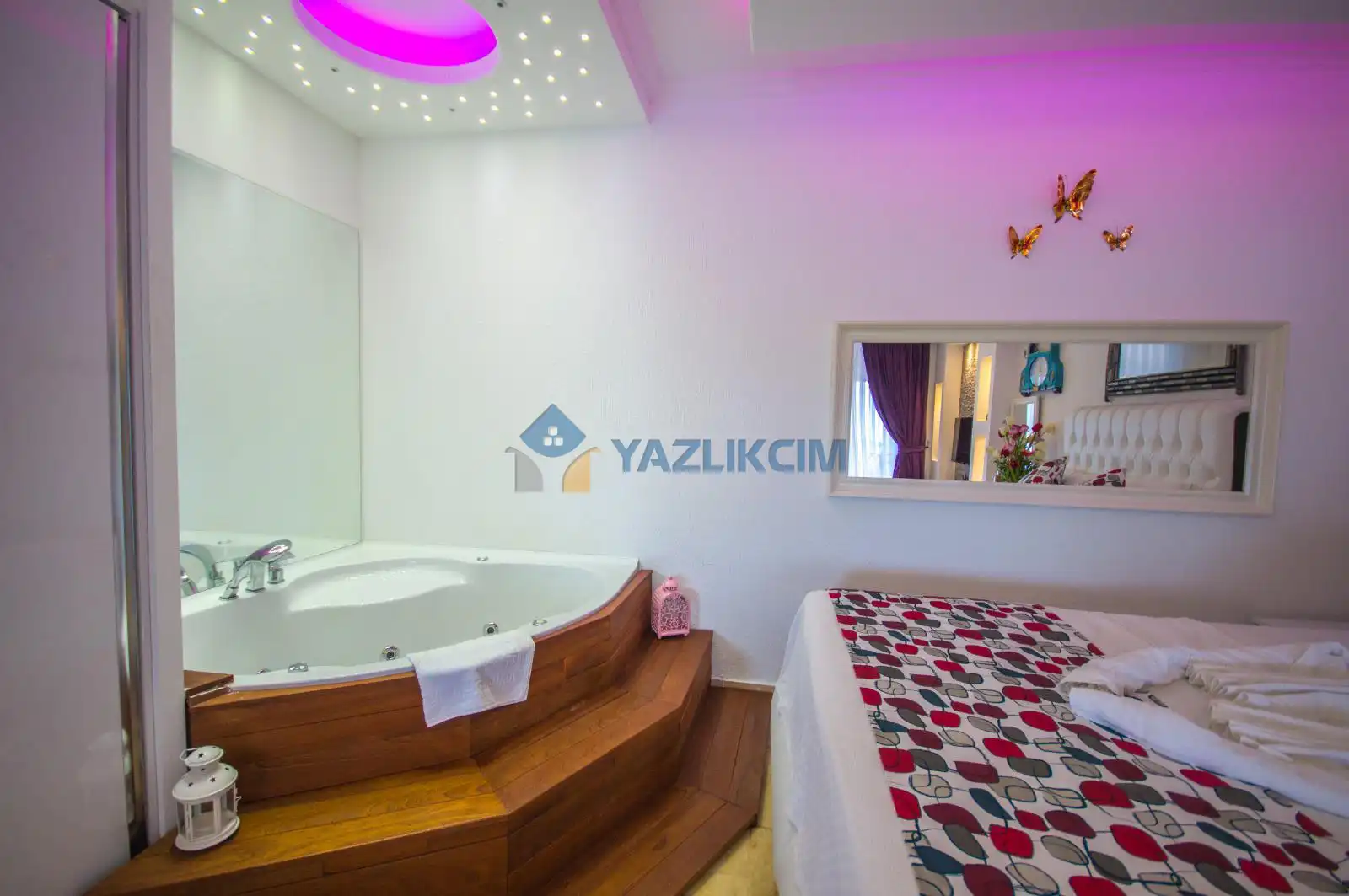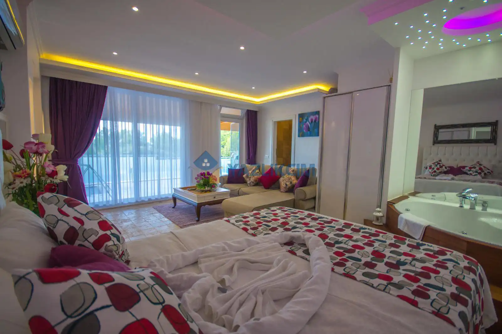 Detayları : Çift kişilik yatak,jakuzi, Komidin, Klima, Elbise dolabı, Makyaj masası,   Banyo ve wc Havuz terasına çıkış bulunmaktadır.