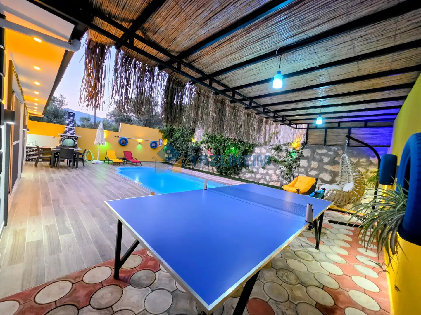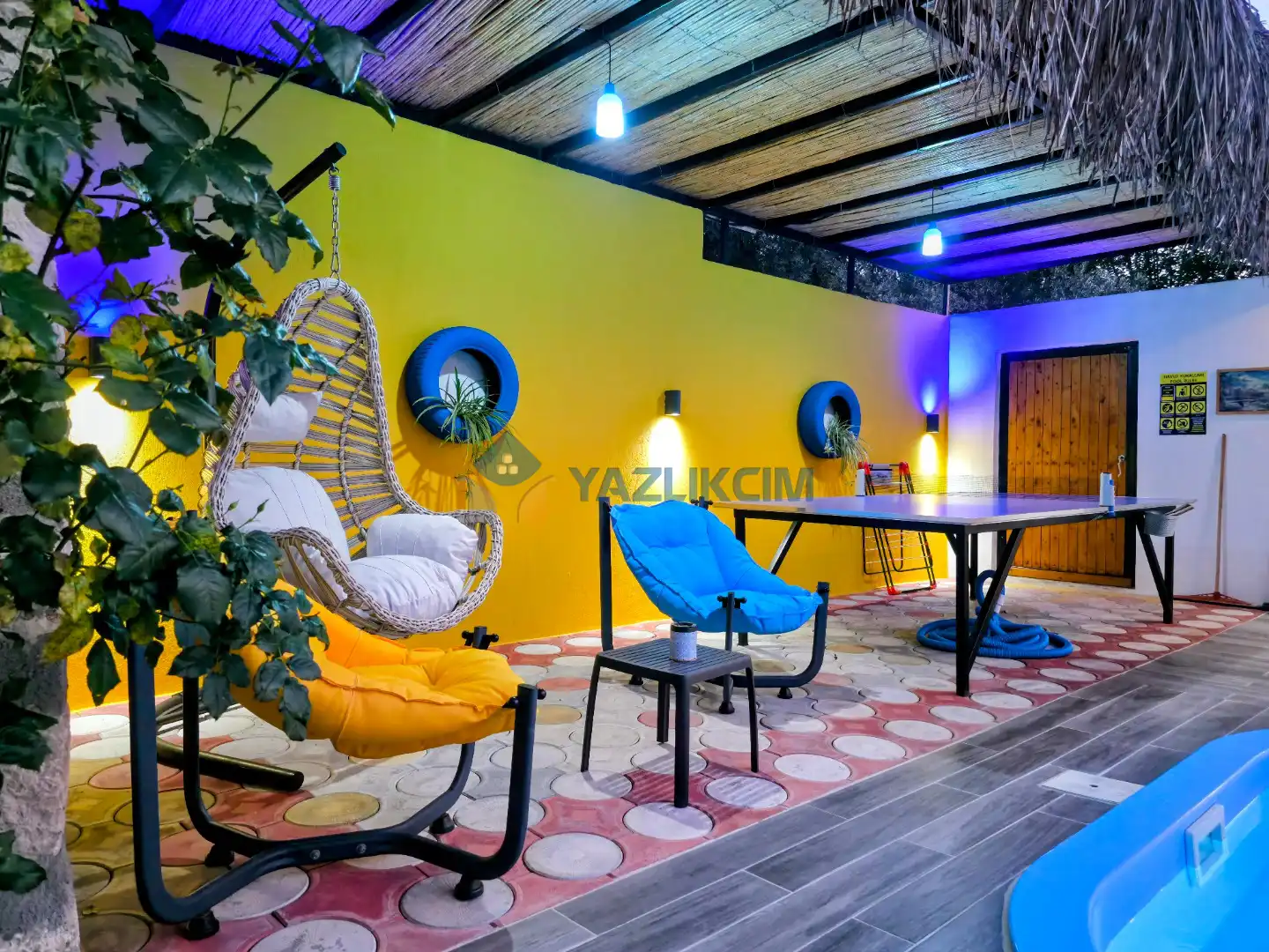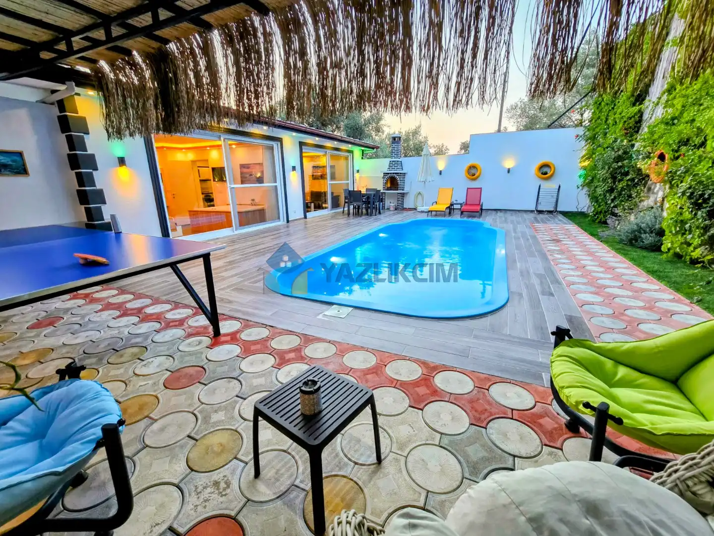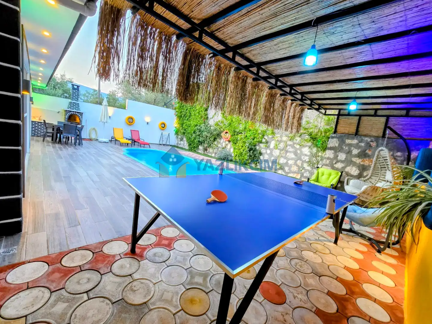Detayları : Şezlong, güneşlenme şemsiyesi, oyun parkı, salıncak, langırt, masa tenisi, barbekü, yemek masası ve sandalyeleri bulunmaktadır.