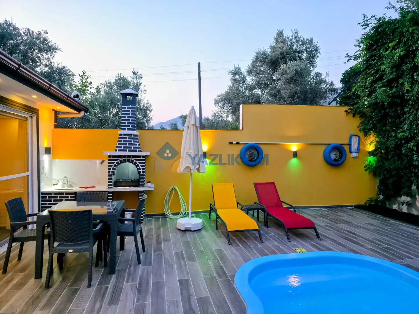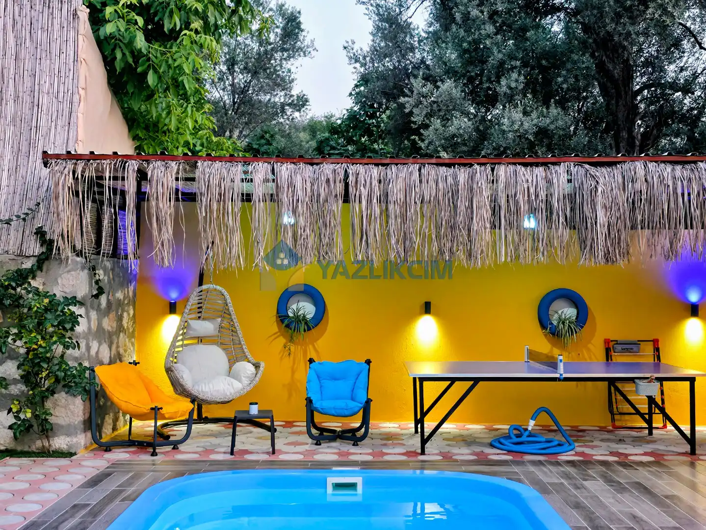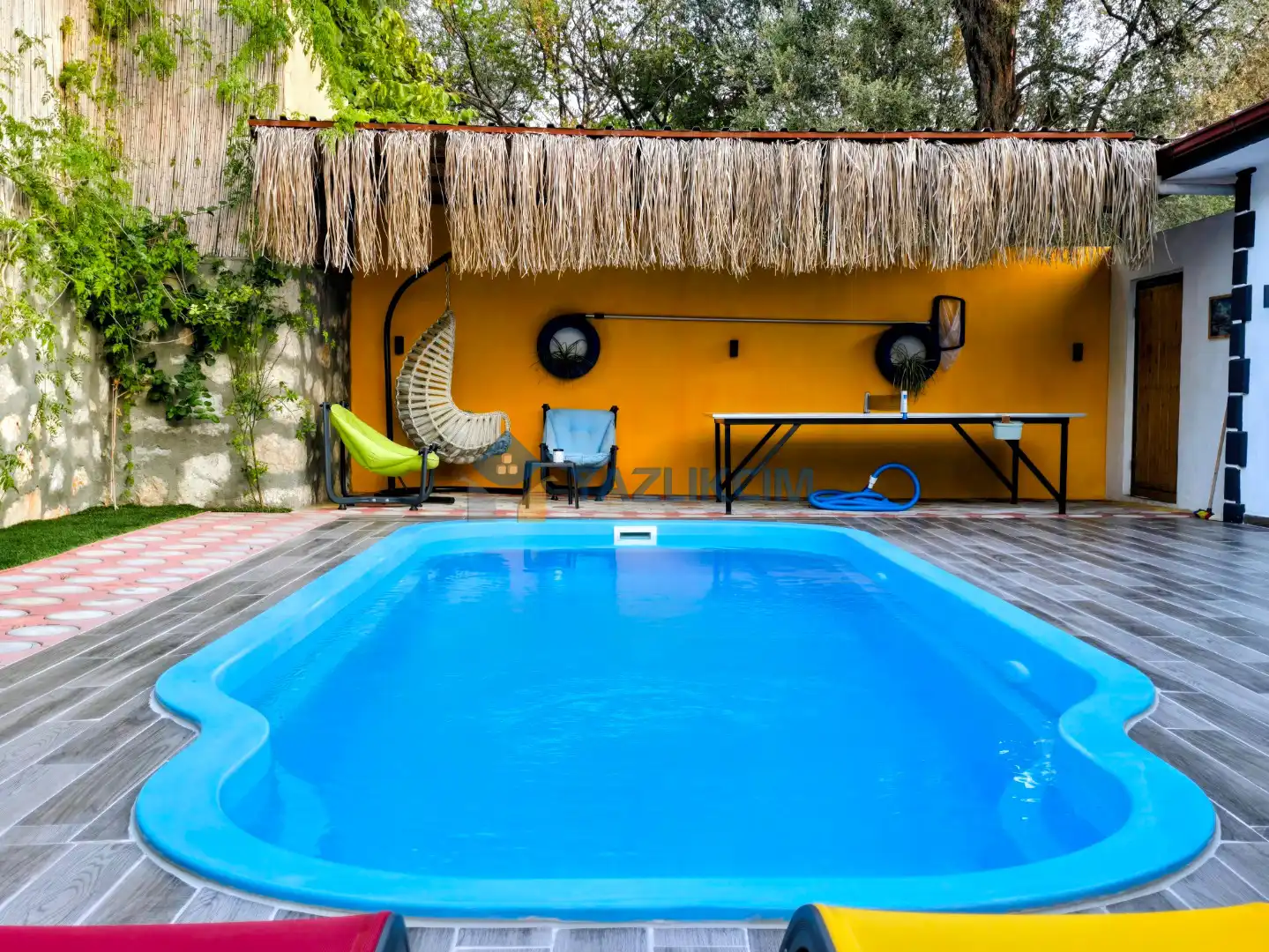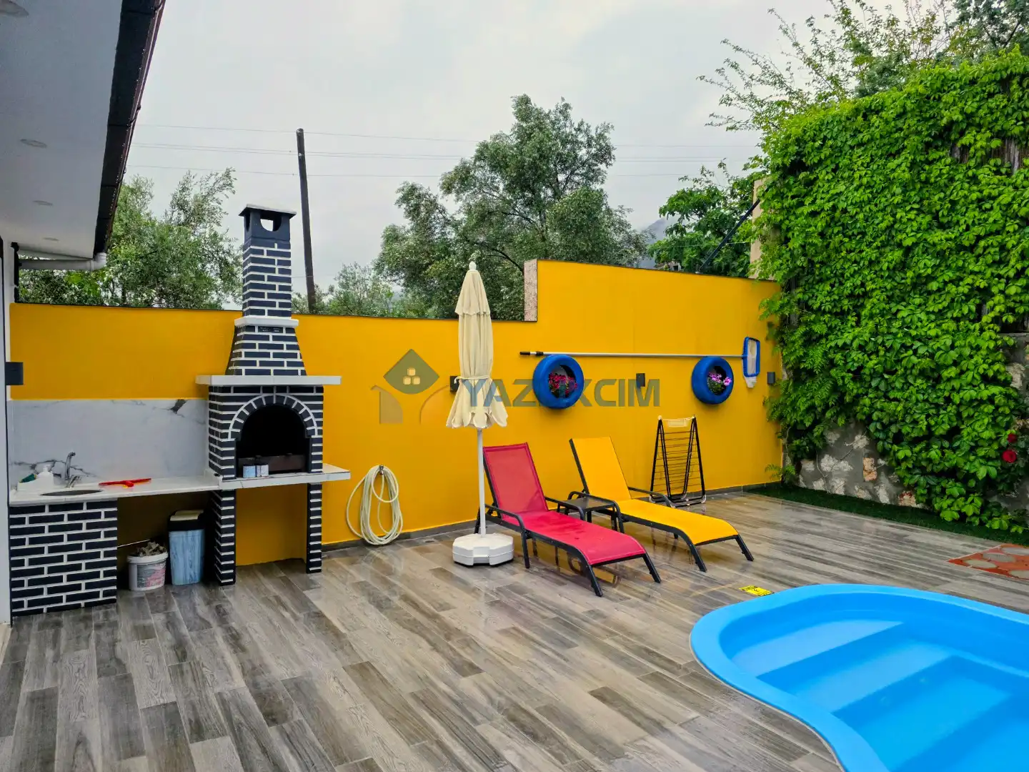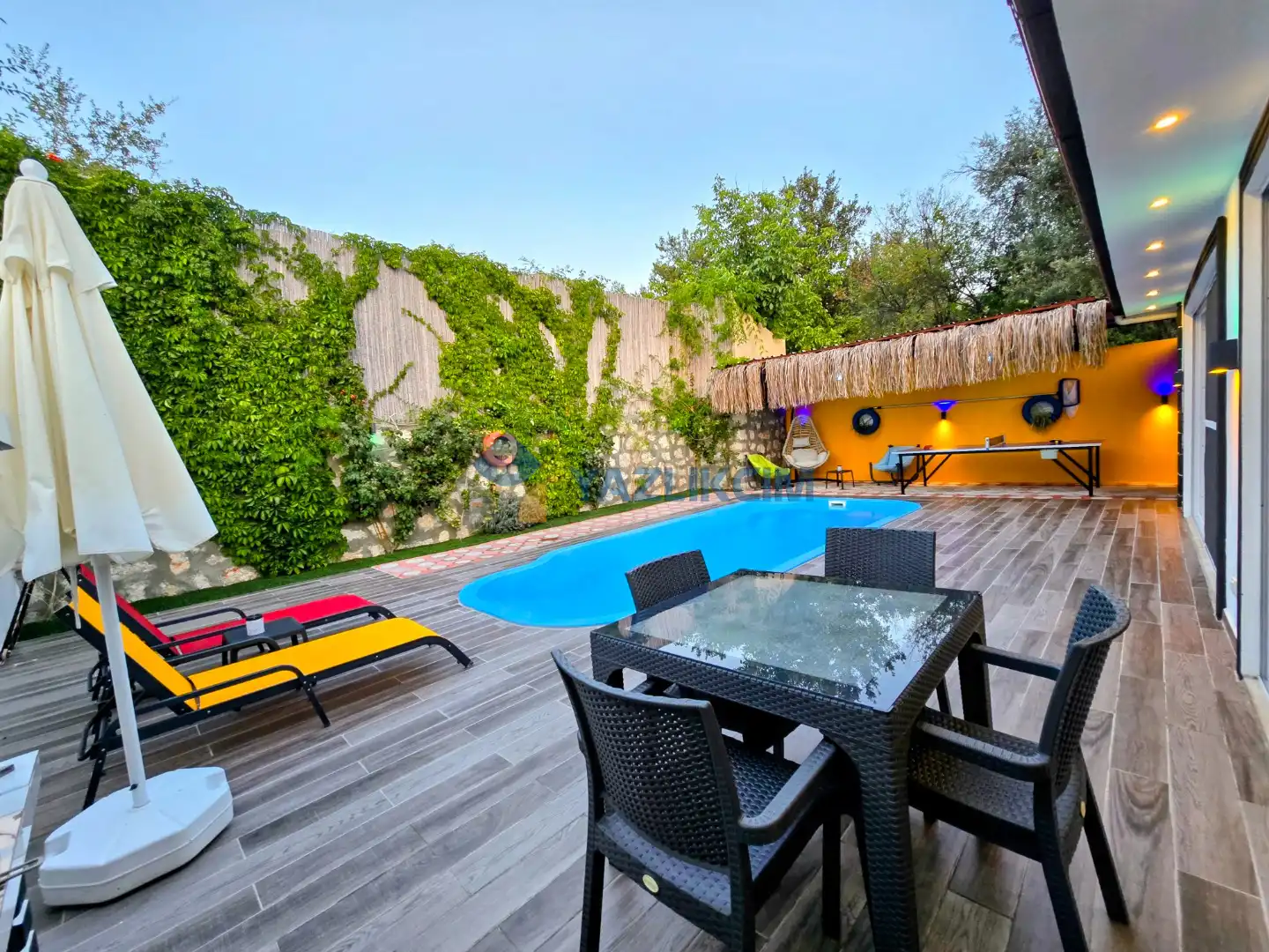 Detayları : Şezlong, güneşlenme şemsiyesi, oyun parkı, salıncak, langırt, masa tenisi, barbekü, yemek masası ve sandalyeleri bulunmaktadır.