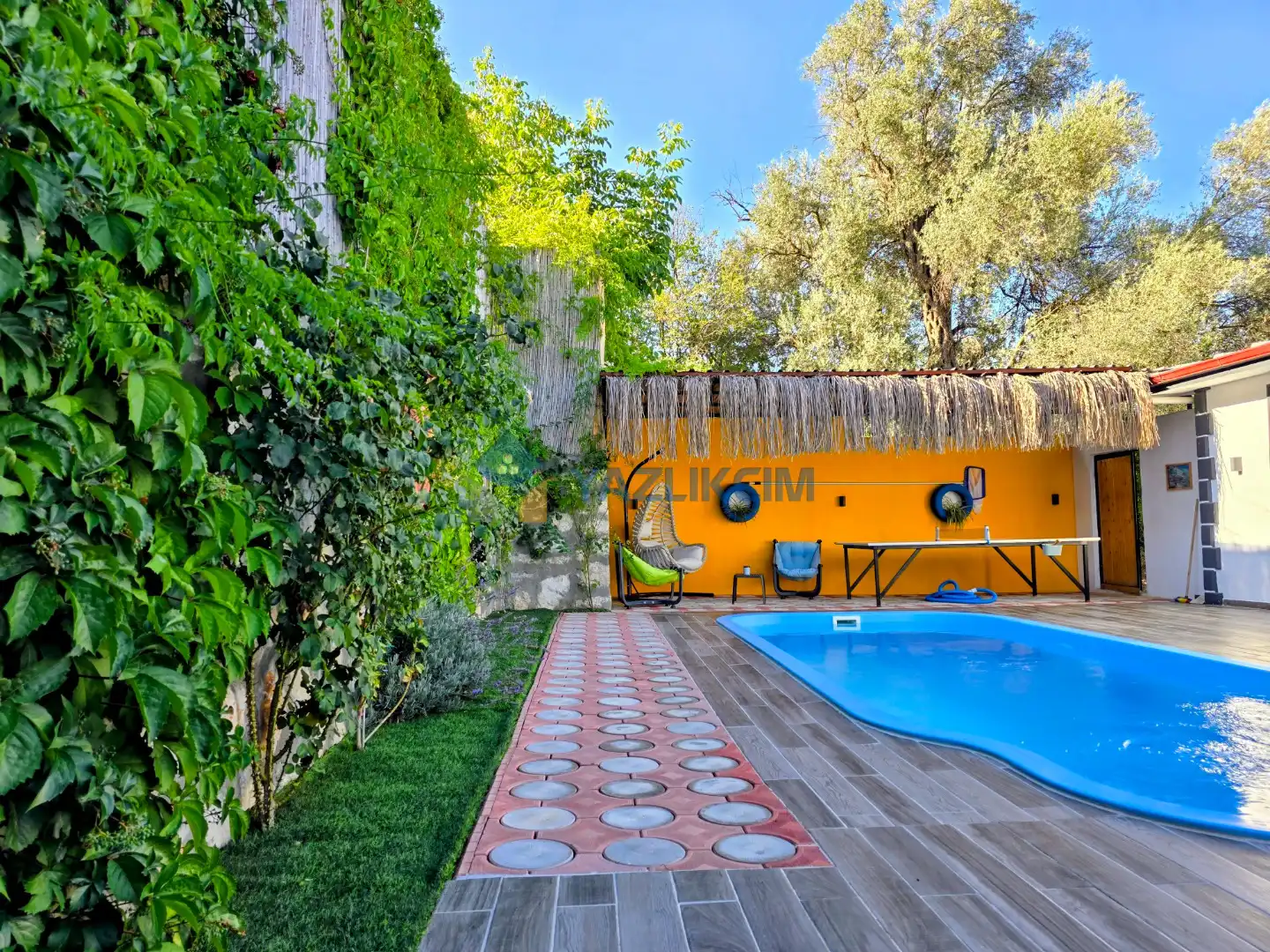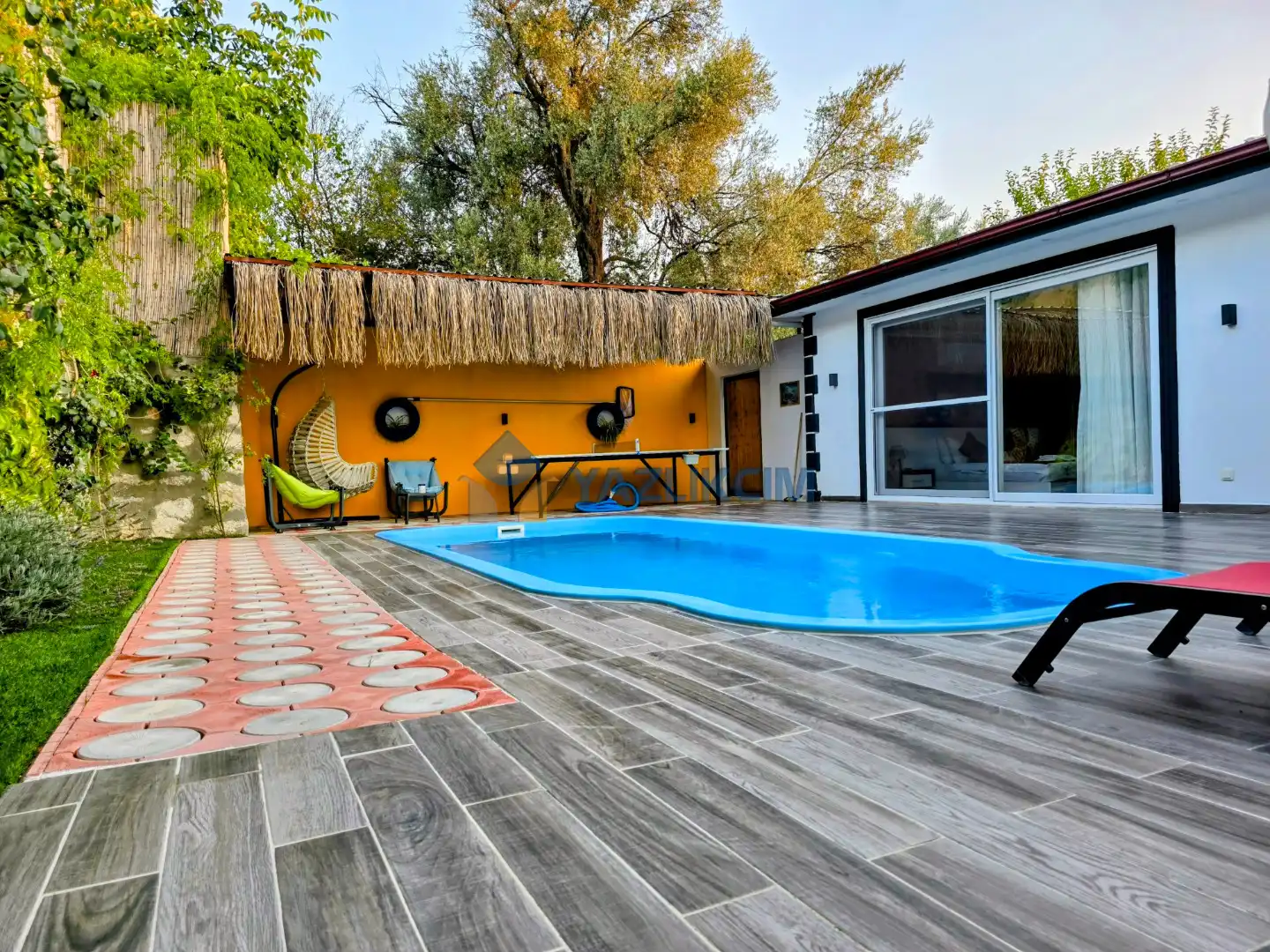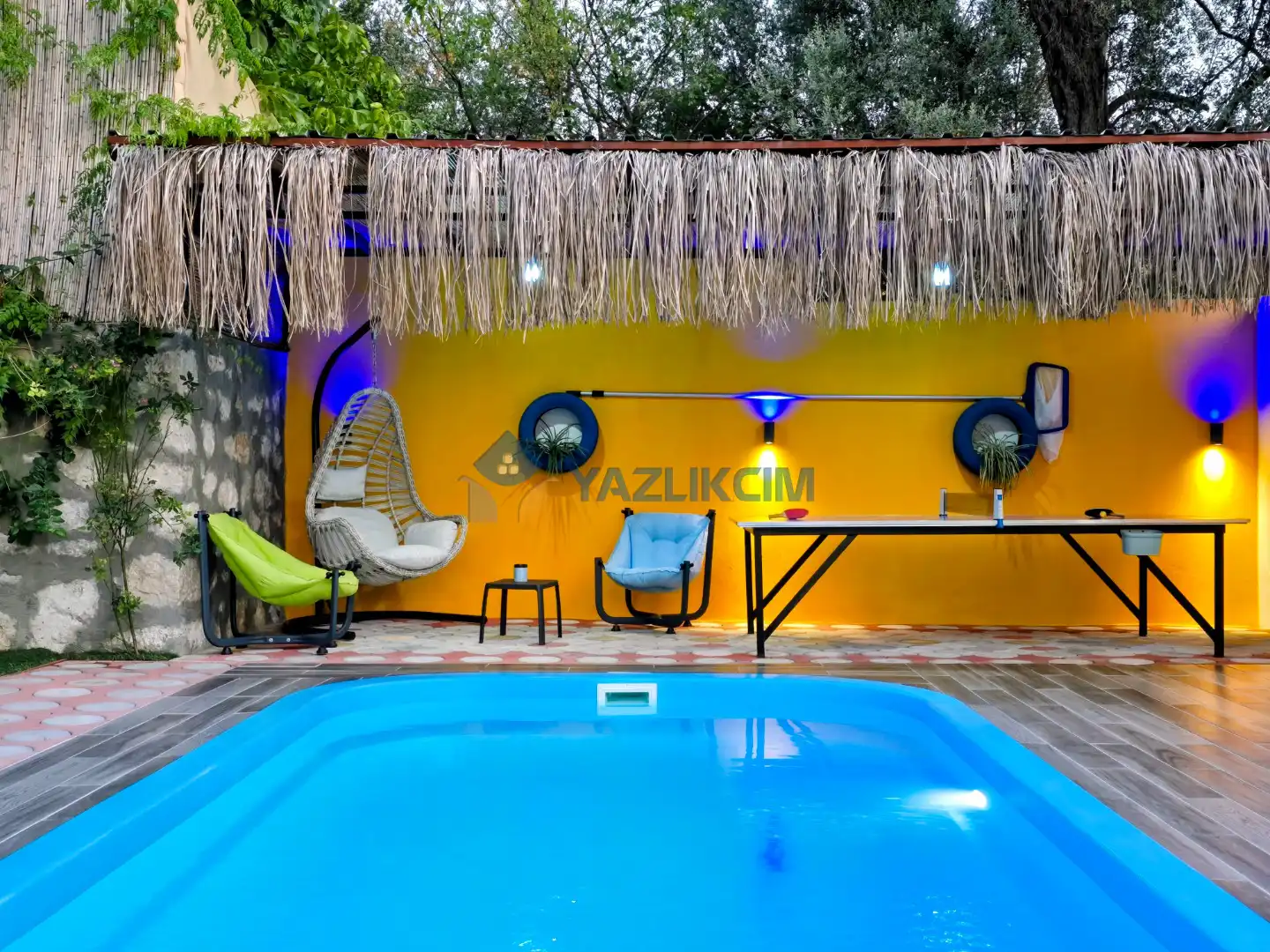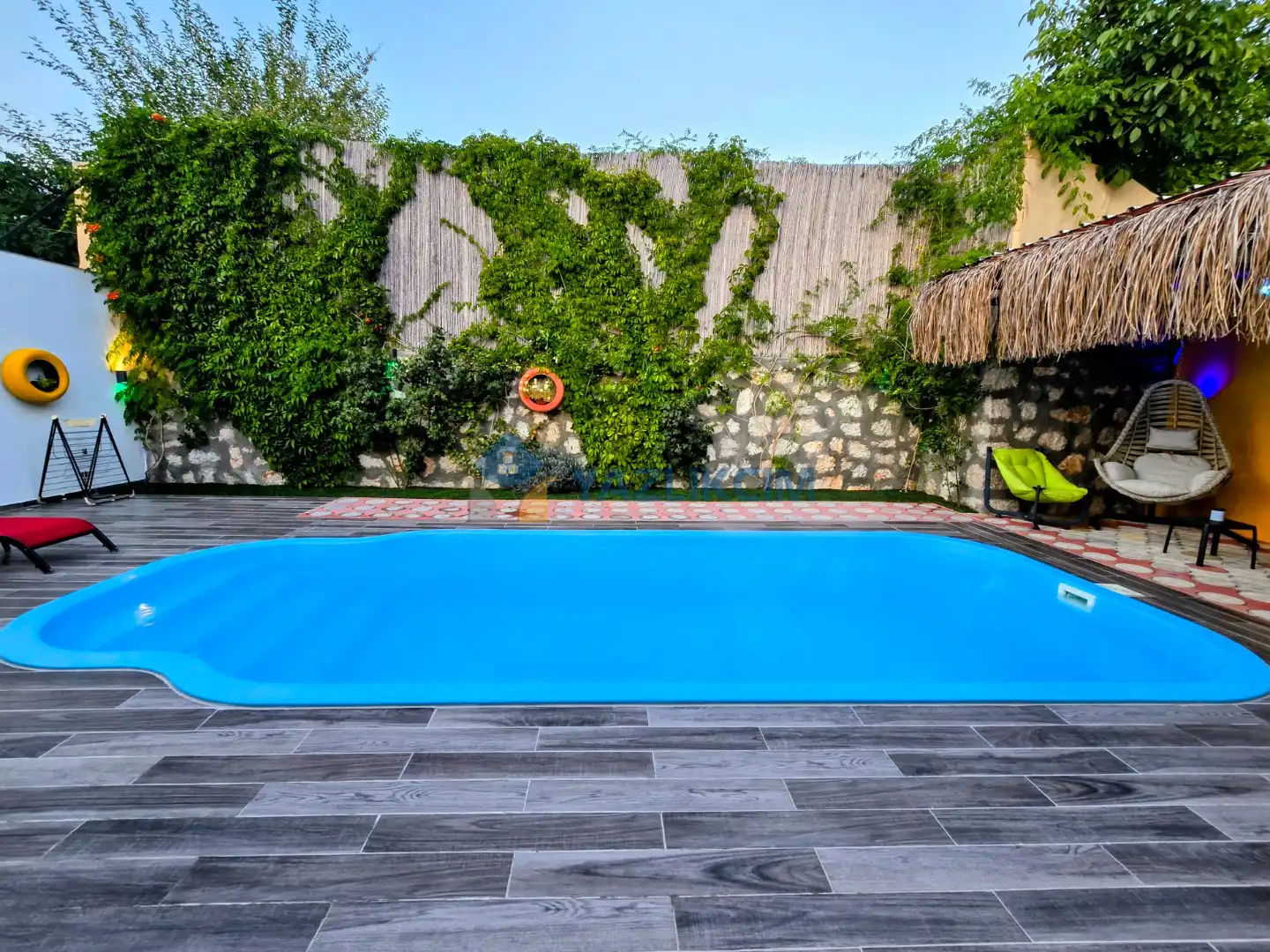 Detayları : Şezlong, güneşlenme şemsiyesi, oyun parkı, salıncak, langırt, masa tenisi, barbekü, yemek masası ve sandalyeleri bulunmaktadır.