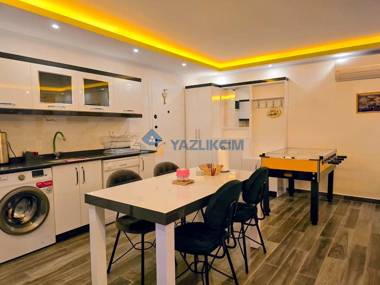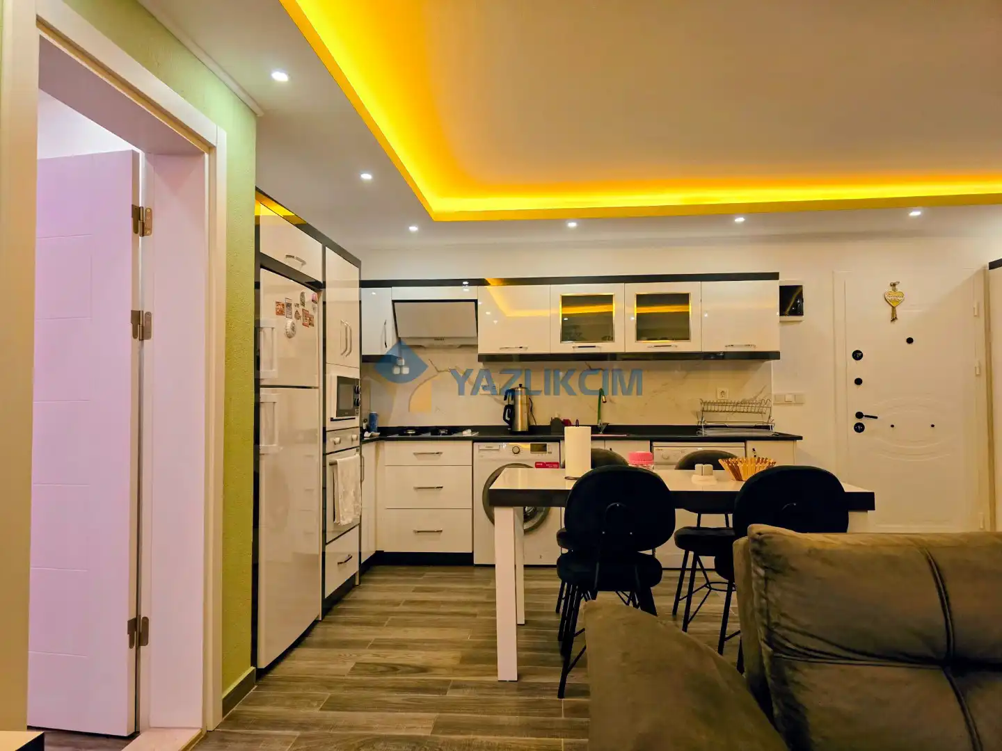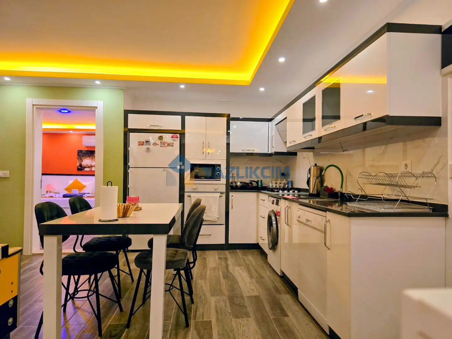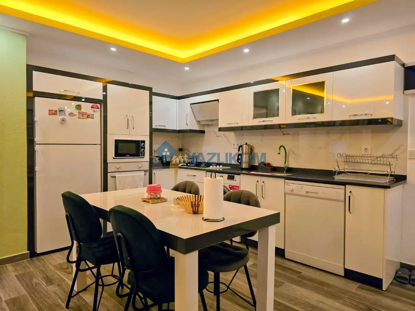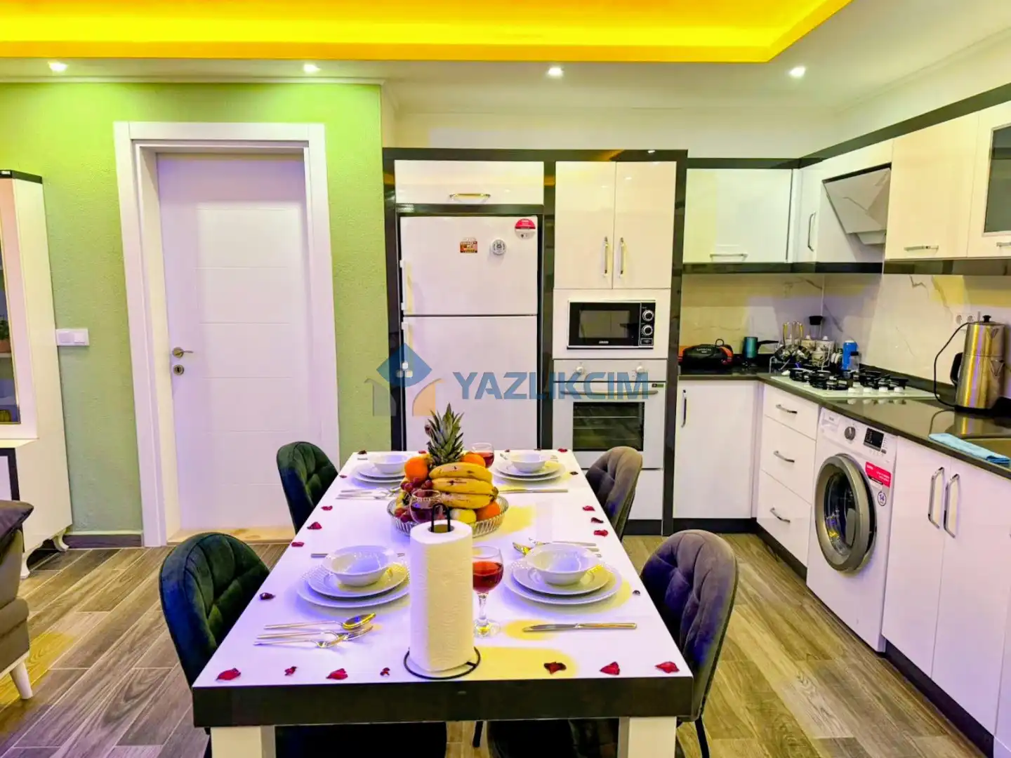 Mutfak Detayları:  Buzdolabı, bulaşık makinesi, fırın, çamaşır makinesi, yemek takımı, tava-tencere, çatal-bıçak seti bulunmaktadır.