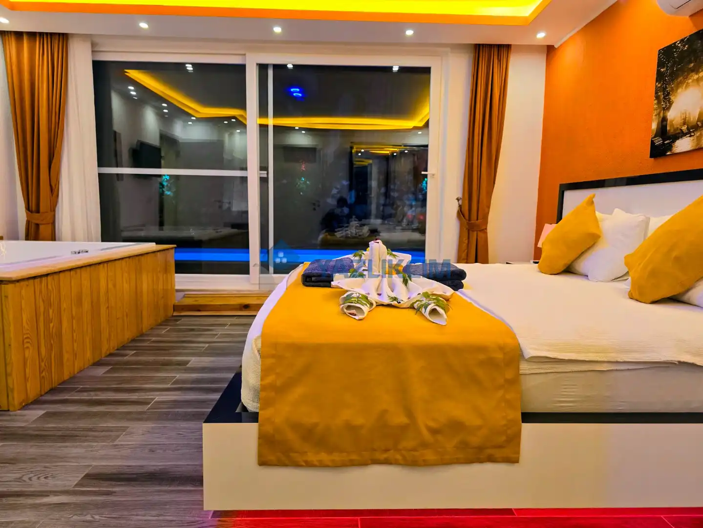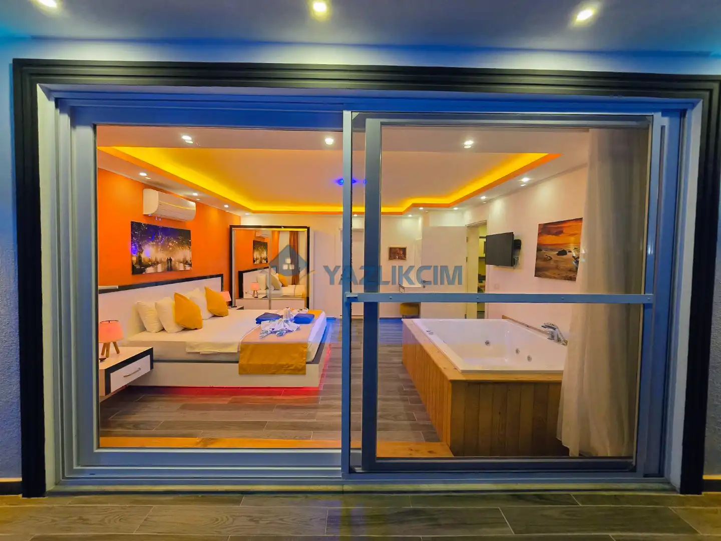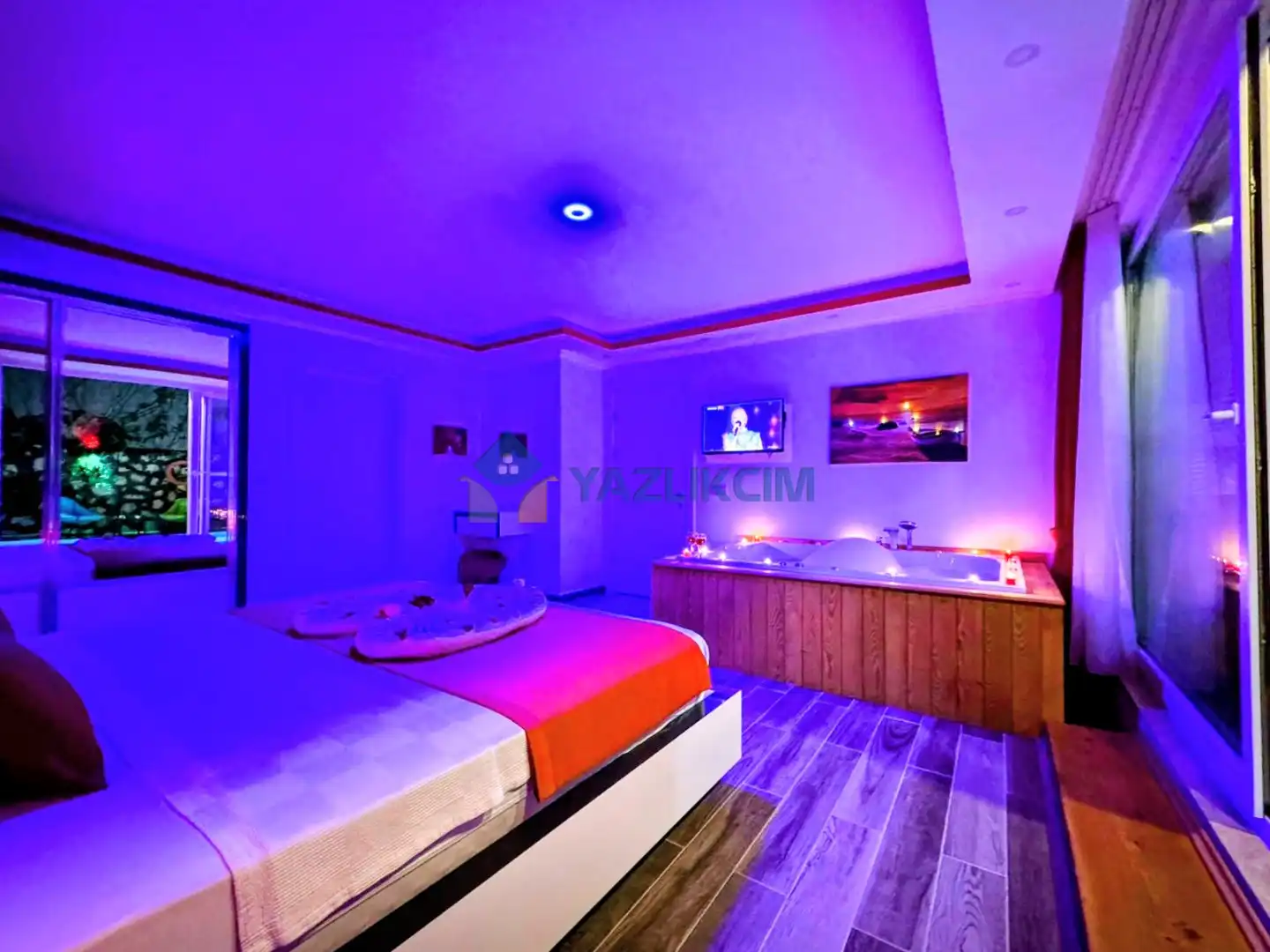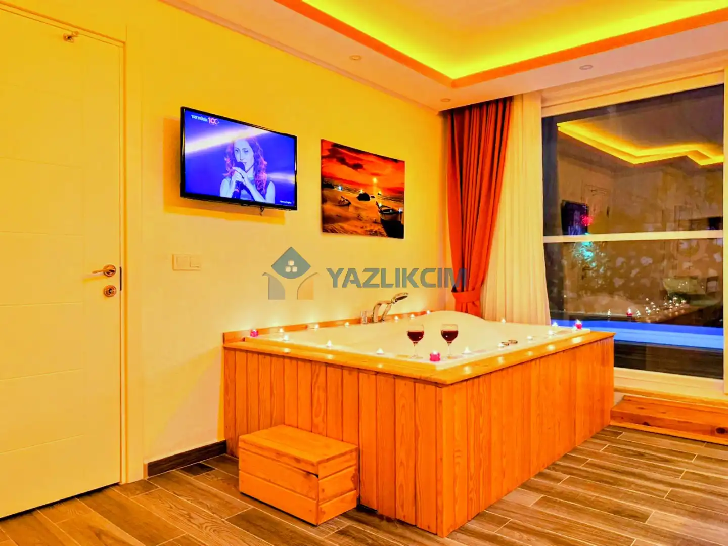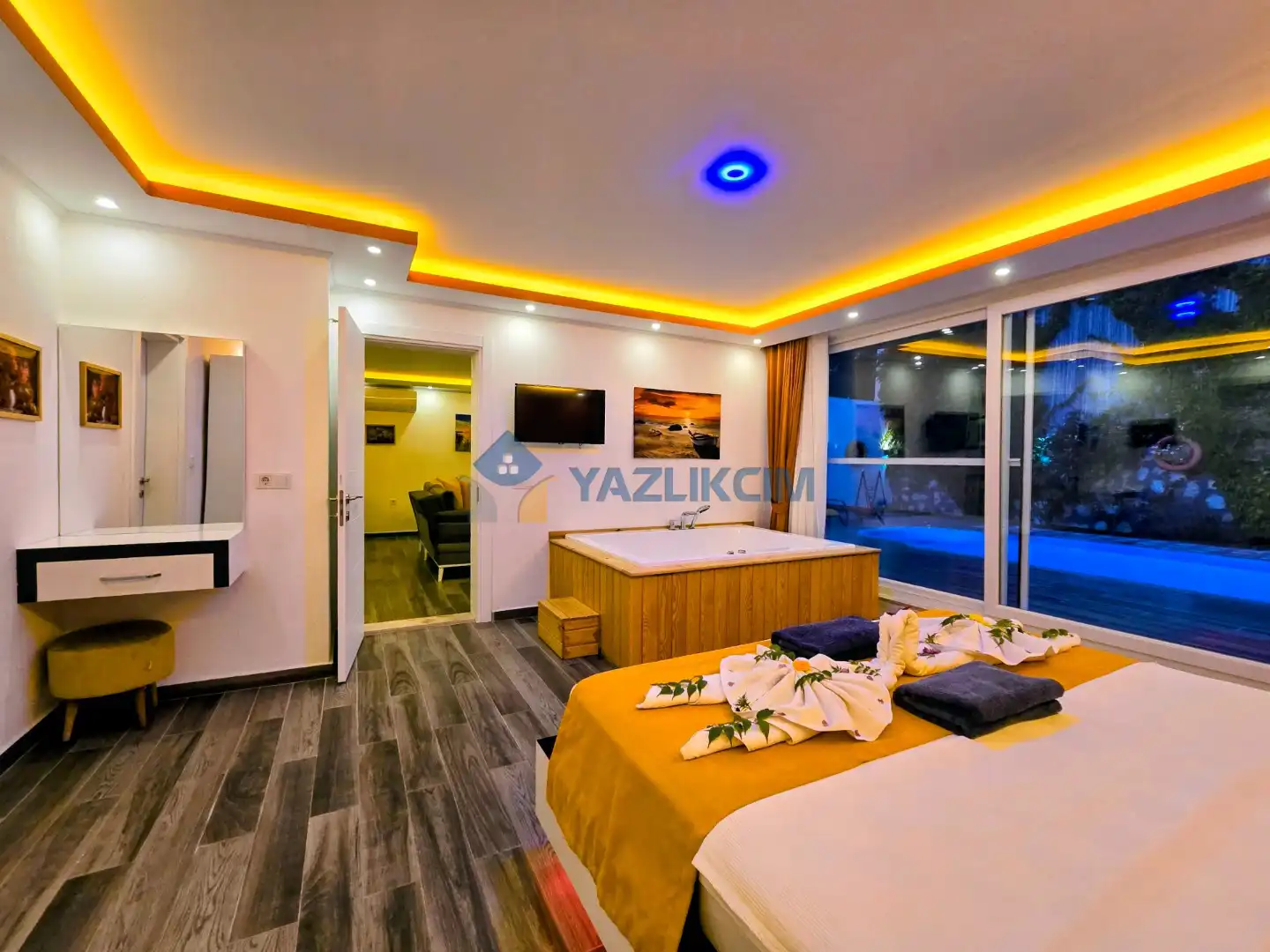 Detayları : Çift kişilik yatak, jakuzi, klima, komodin, elbise dolabı, makyaj masası, banyo ve lavabo bulunmaktadır.
